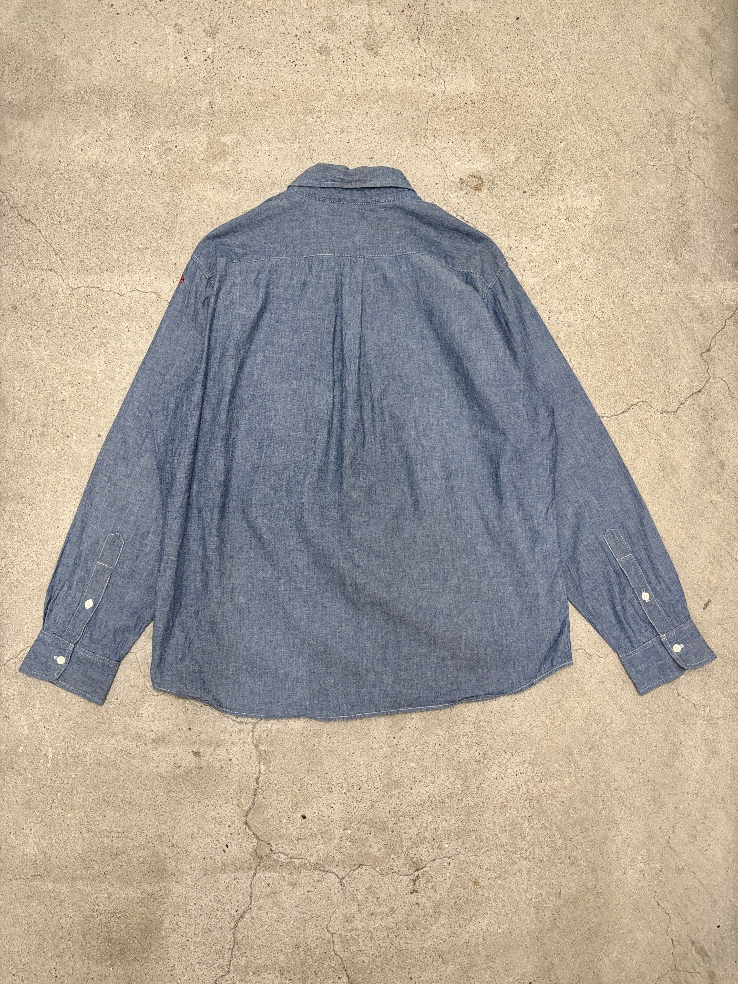 90s OLD STUSSY/Chambray Shirt/USA製/紺タグ/L/シャンブレーシャツ/長袖シャツ/チンスト/刺繍ロゴ/インディゴ/ステューシー/オ-ルドステューシー