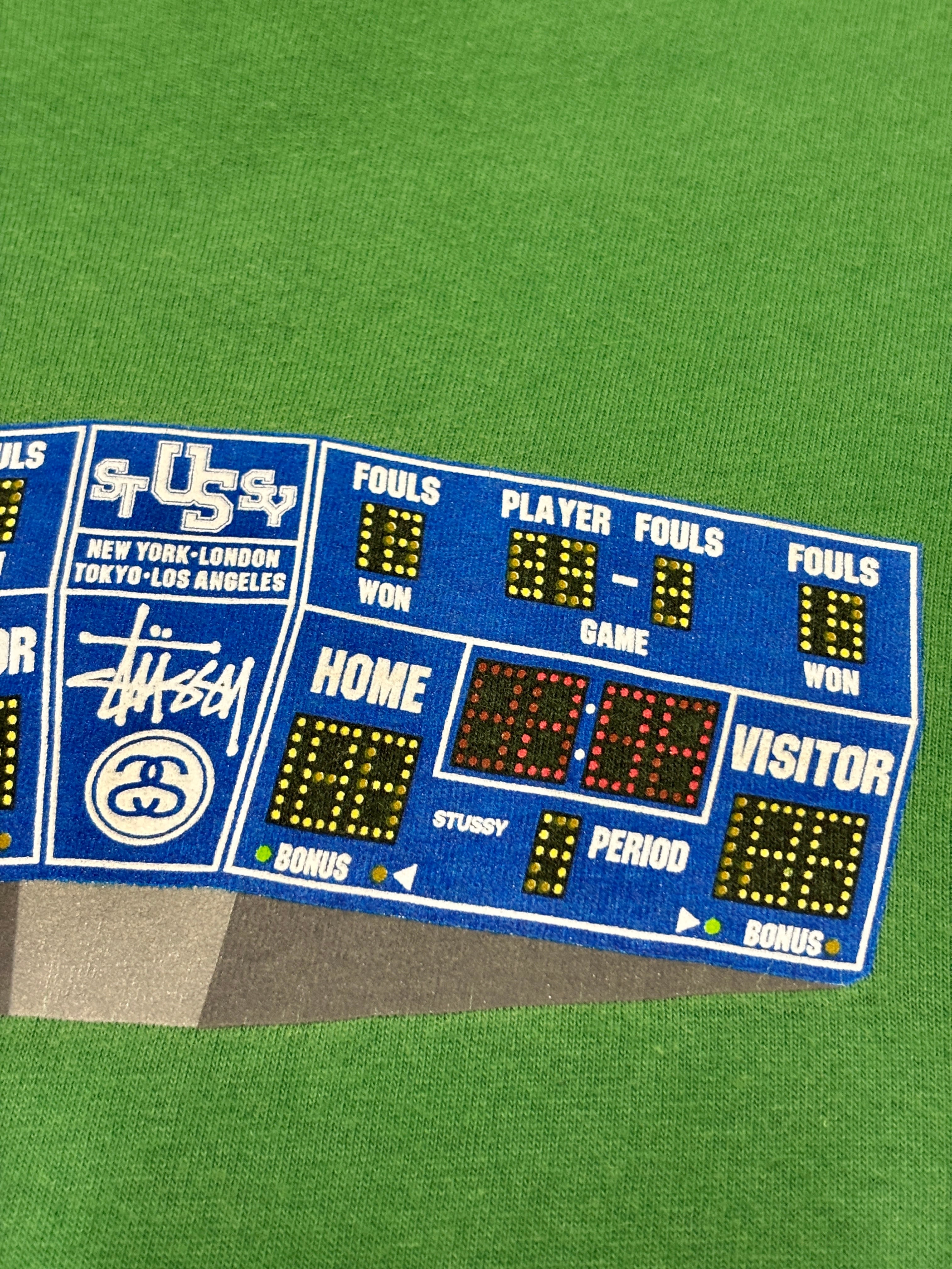 00s OLD STUSSY/Score Board Tee/USA製/銀タグ/XL/スコアボードプリントTシャツ/ロゴプリント/グリ-ン/ブル-/ステューシー/オ-ルドステューシ-