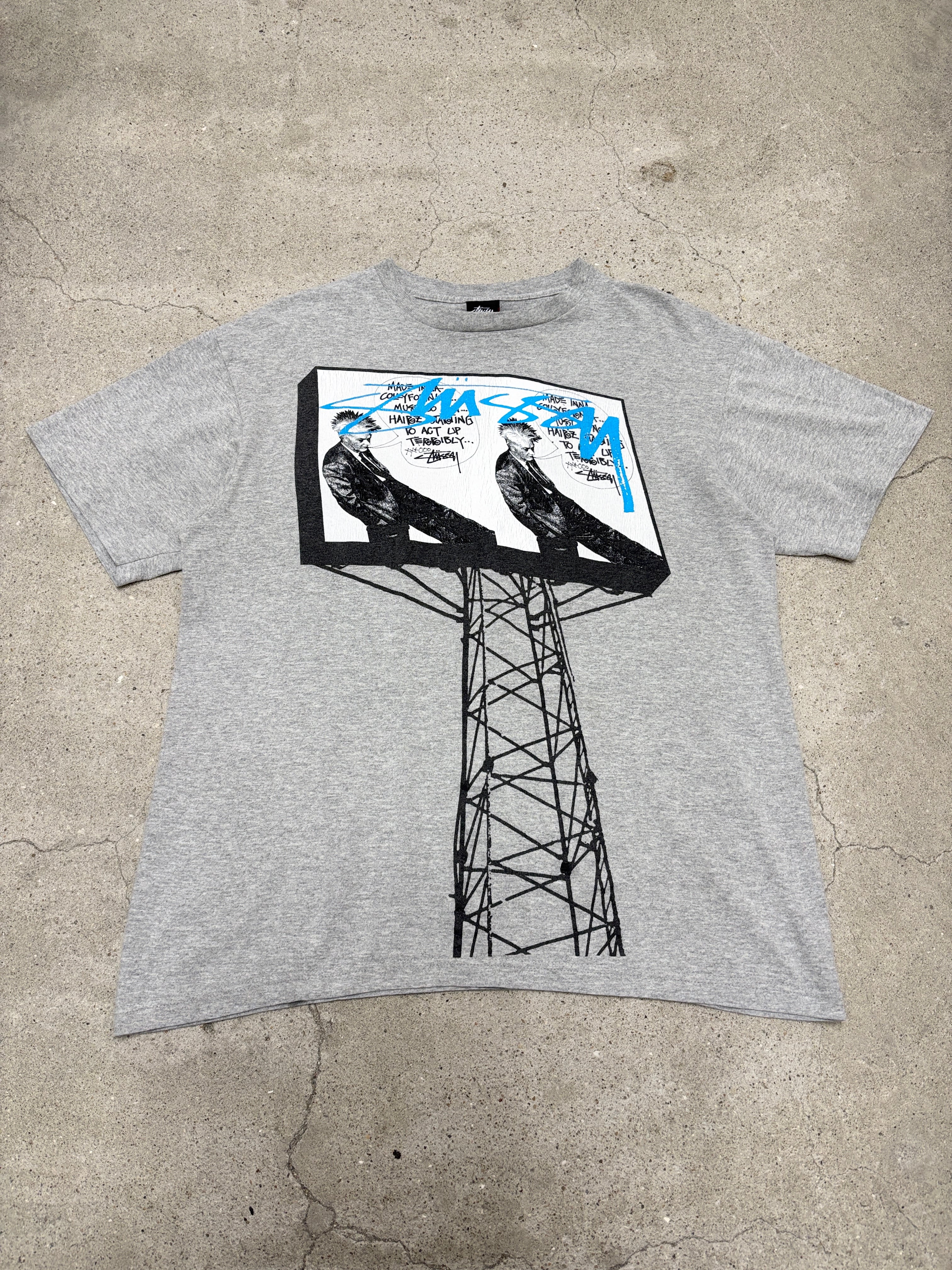00~10s STUSSY/Crazy Hair Tee/L/フォトプリントTシャツ/ロゴプリント/ストックロゴ/グレ-/ステューシー/吹き出しフォント/古着/ア―カイブ
