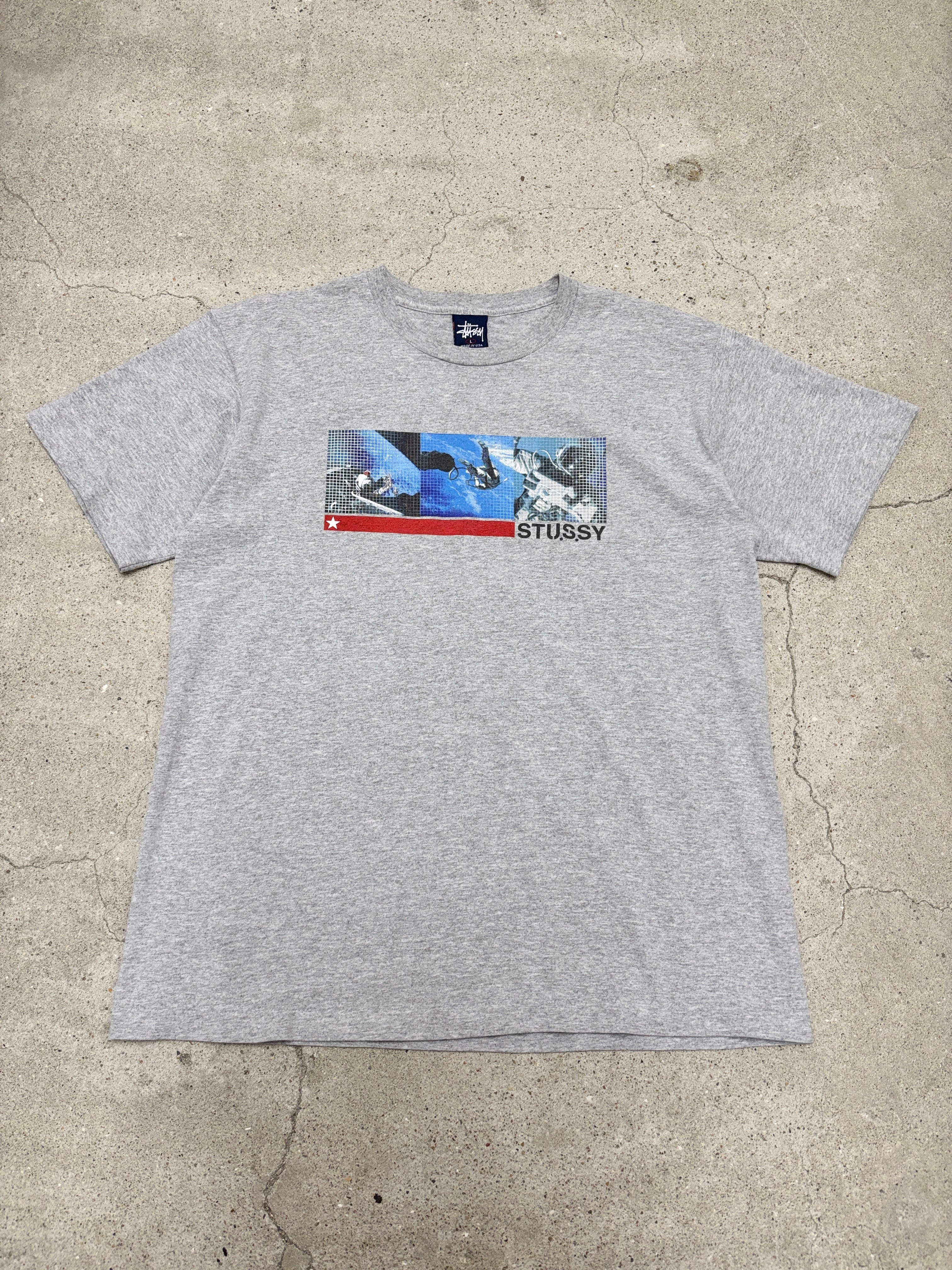 90~00s OLD STUSSY/Astronauts print Tee/USA製/紺タグ/L/宇宙飛行士プリントTシャツ/ロゴプリント/地球/グレ-/ステューシー/オ-ルドステューシー