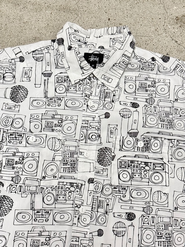 STUSSY/Boombox print S/S Shirt/M/ラジカセプリント半袖シャツ/総柄/マイク/ホワイト/ステューシー