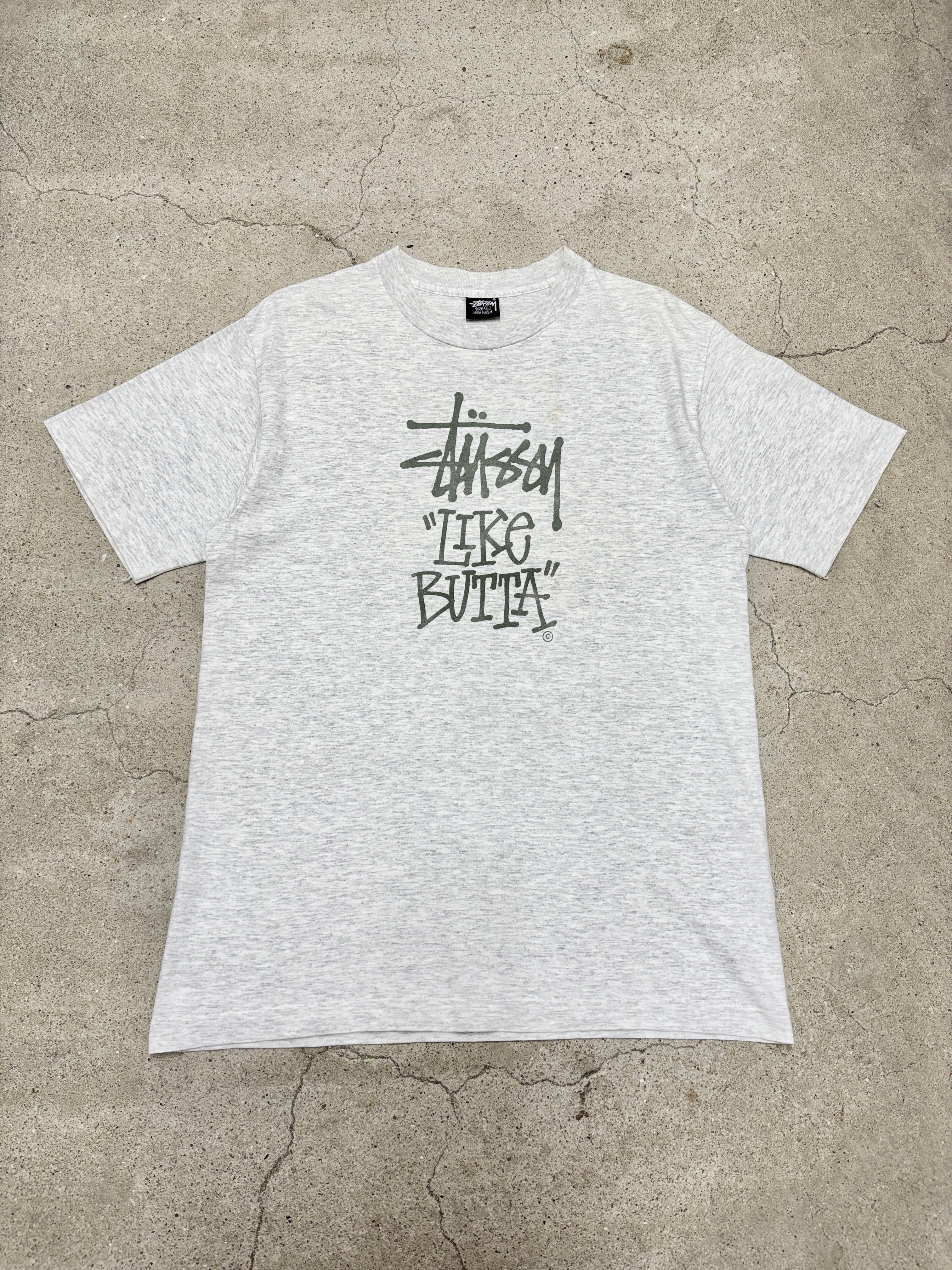 80~90s OLD STUSSY/LIKE BUTTA Tee/USA製/黒タグ/L/ロゴプリントTシャツ/ライクブッタ/グレ-/ステューシー/オ-ルドステューシー/古着/ア―カイブ