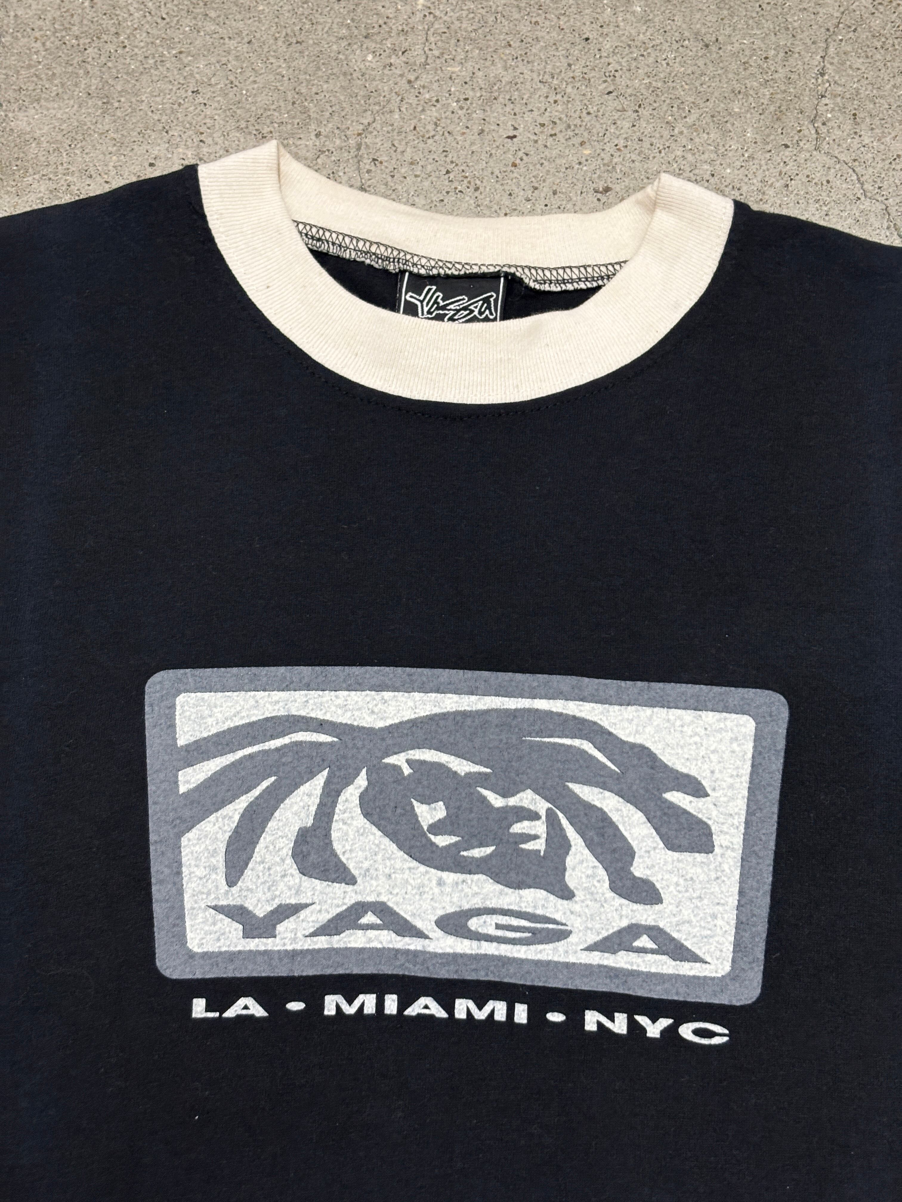 90~00s YAGA/Logo print Ringer Tee/USA製/M/ロゴプリントリンガ-Tシャツ/ブラック/ホワイト/ヤガ/古着