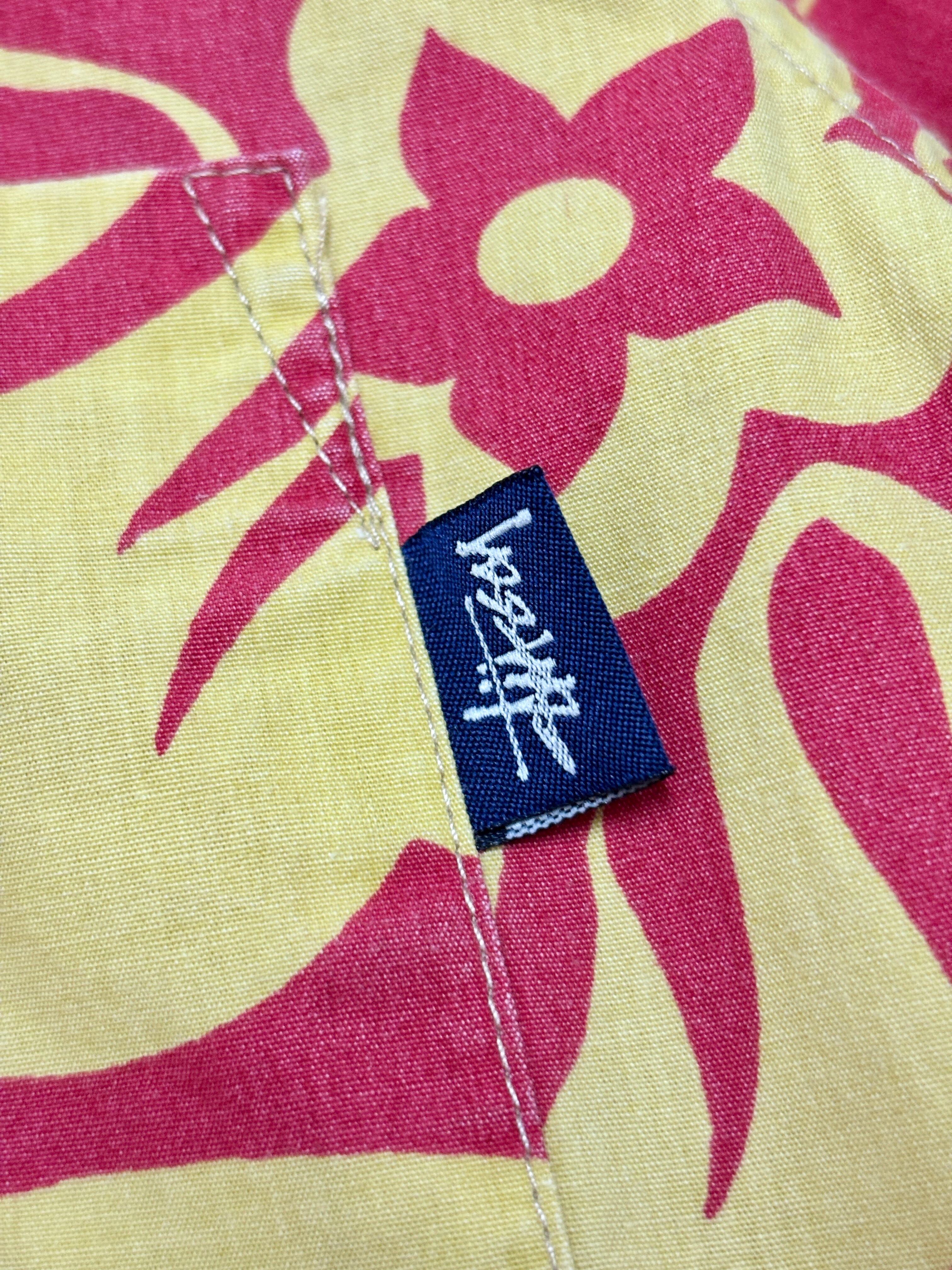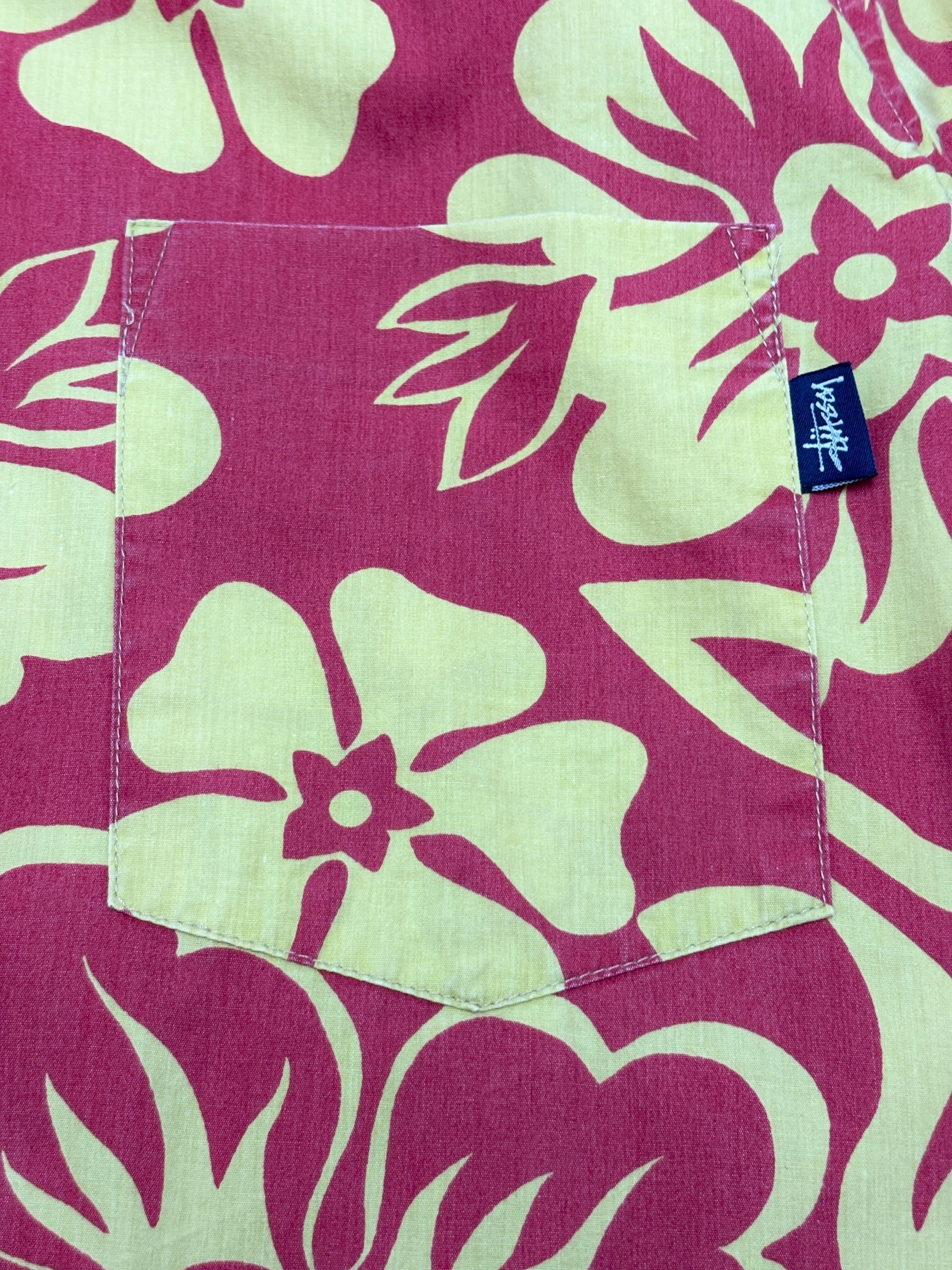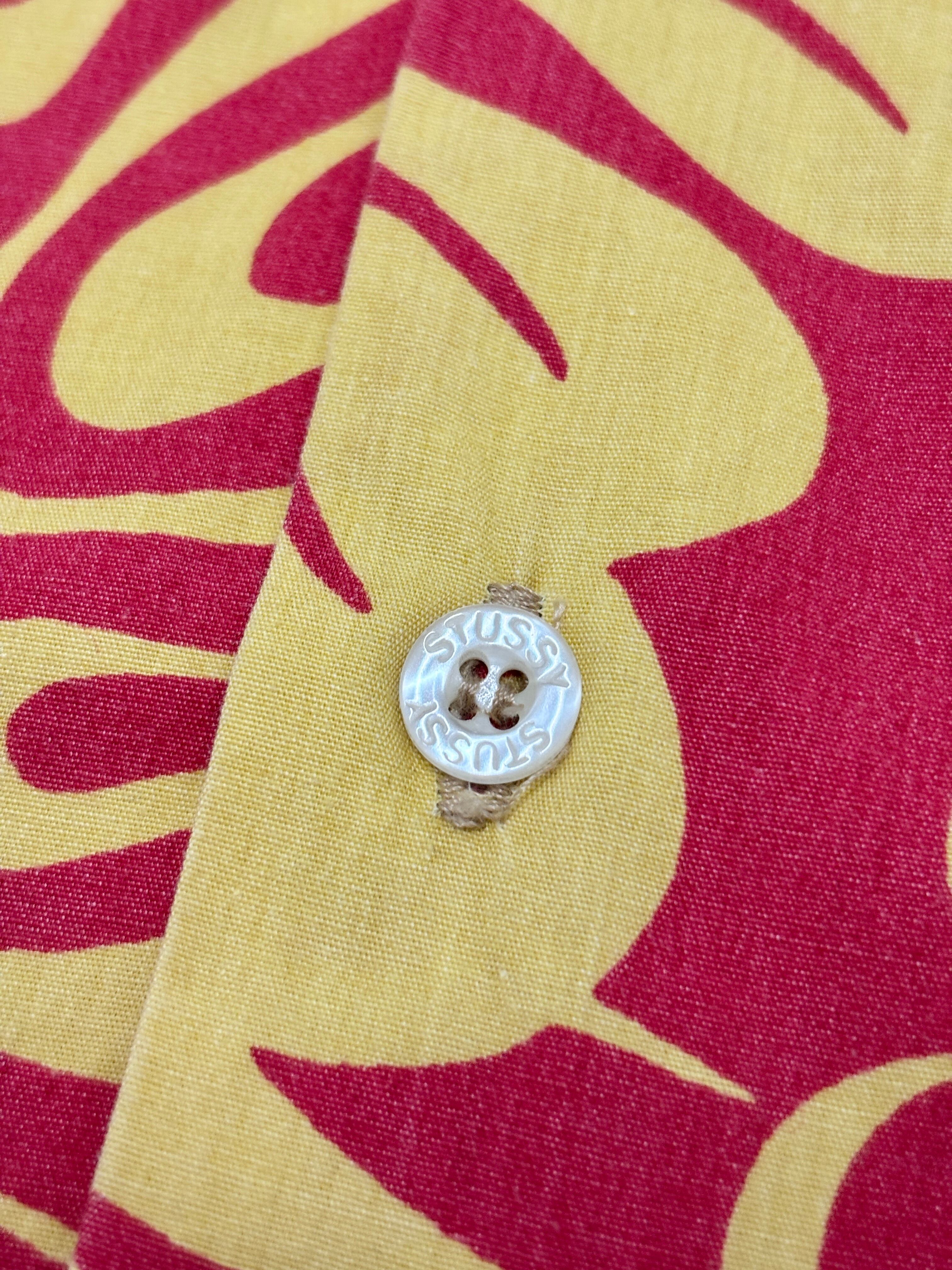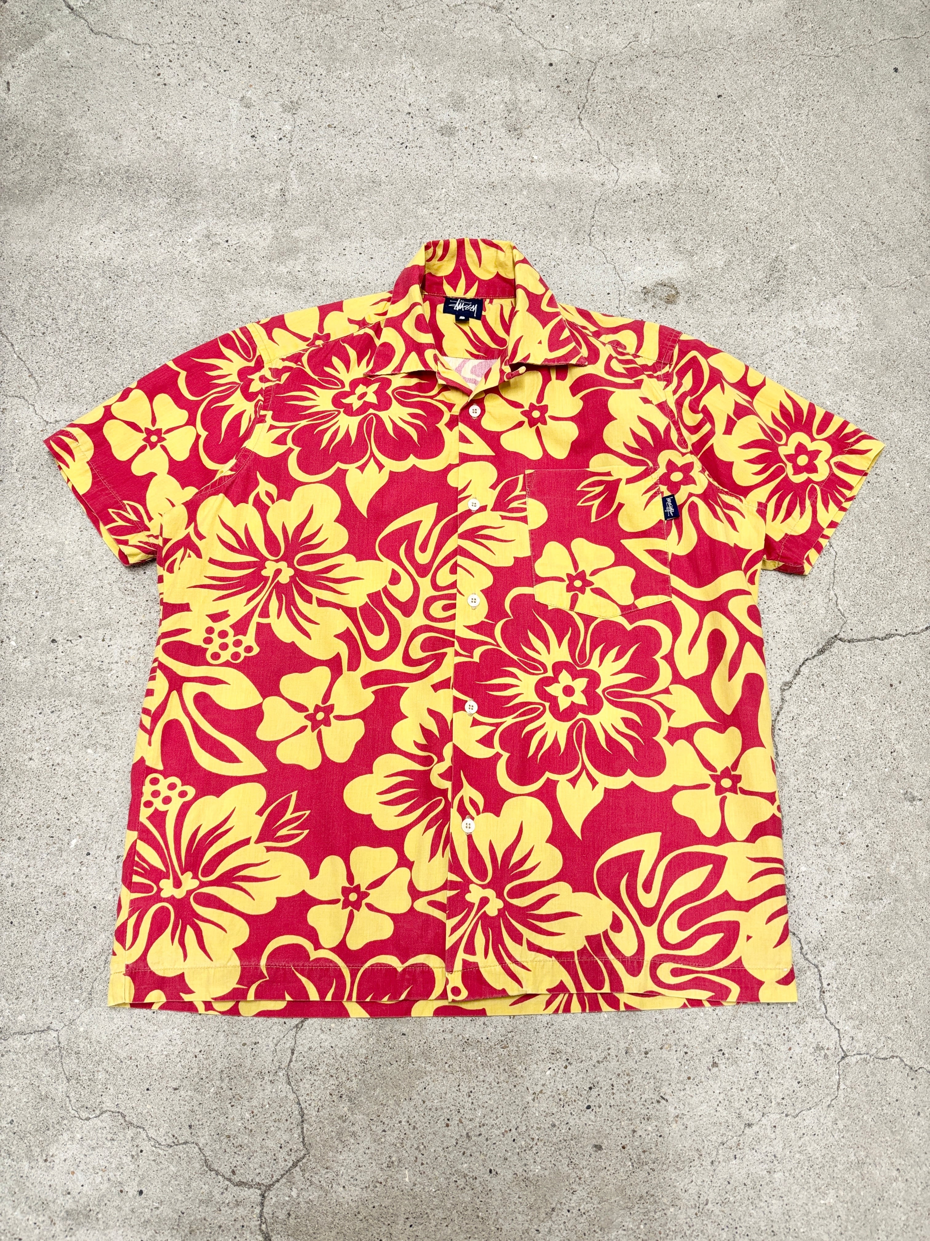 90~00s OLD STUSSY/ALOHA Shirt/USA製/紺タグ/S (M-L相当)/アロハシャツ/ハイビスカス/半袖シャツ/レッド/イエロ-/ステューシー/オ-ルドステューシー/古着/ア―カイブ