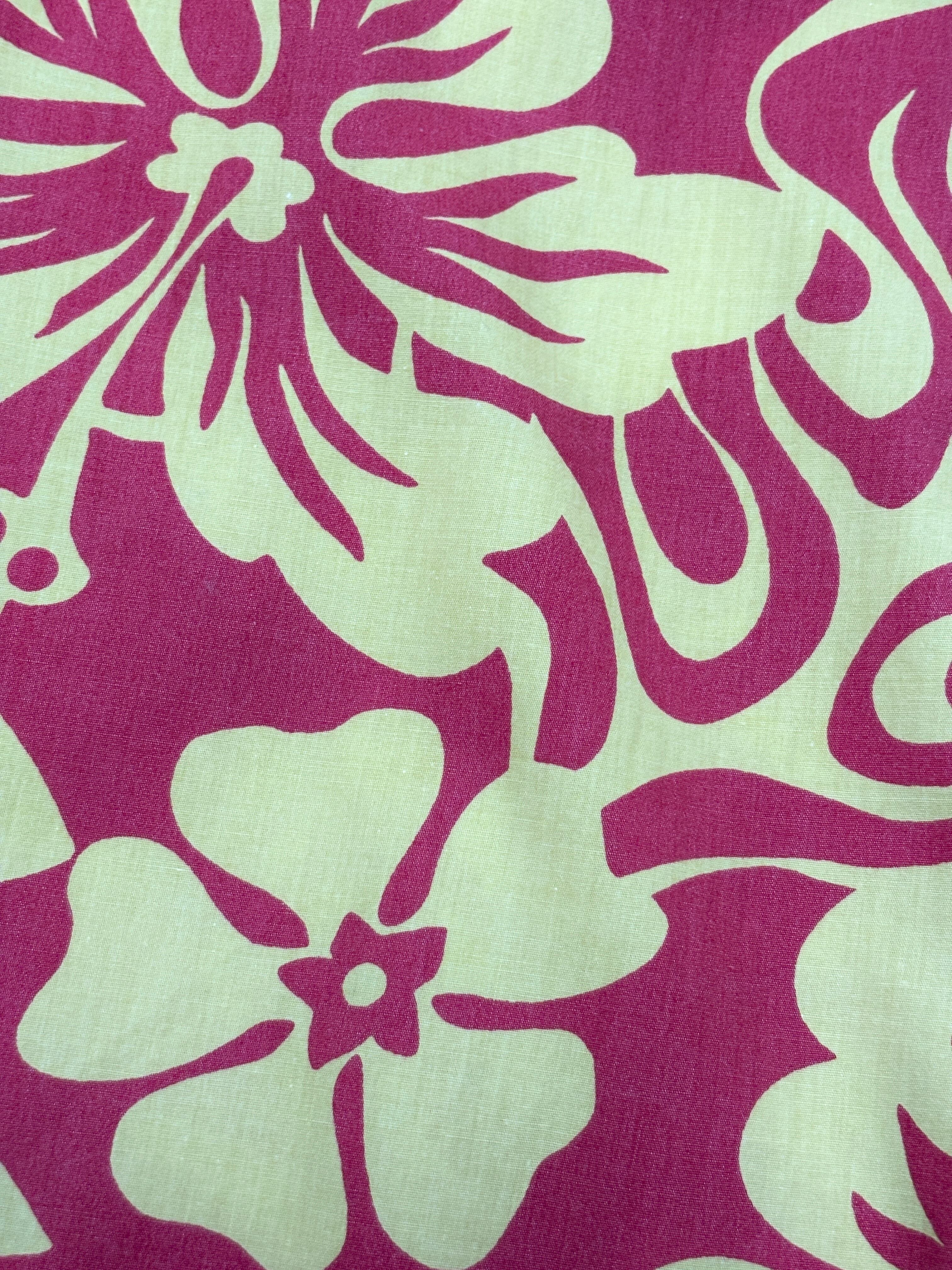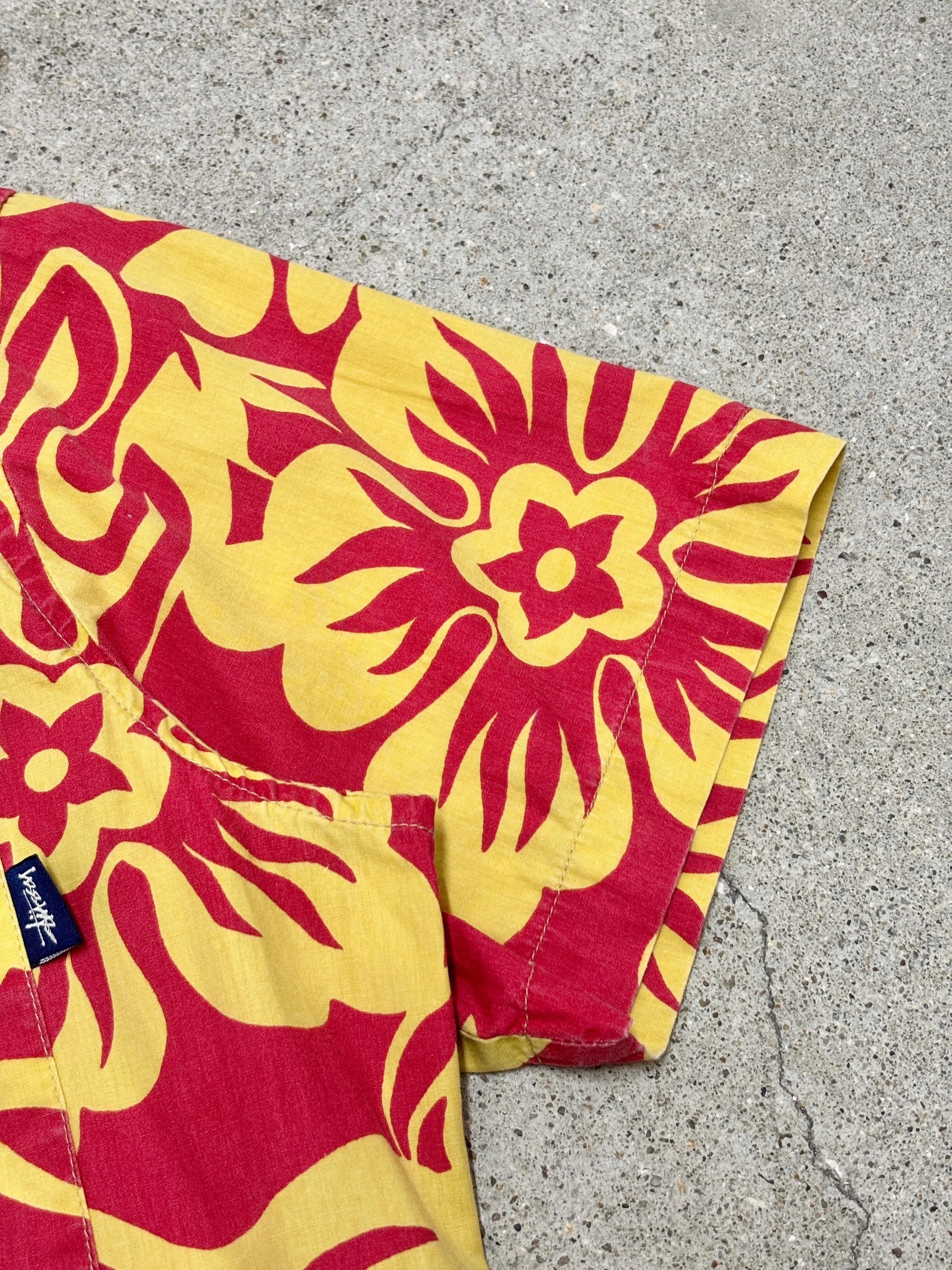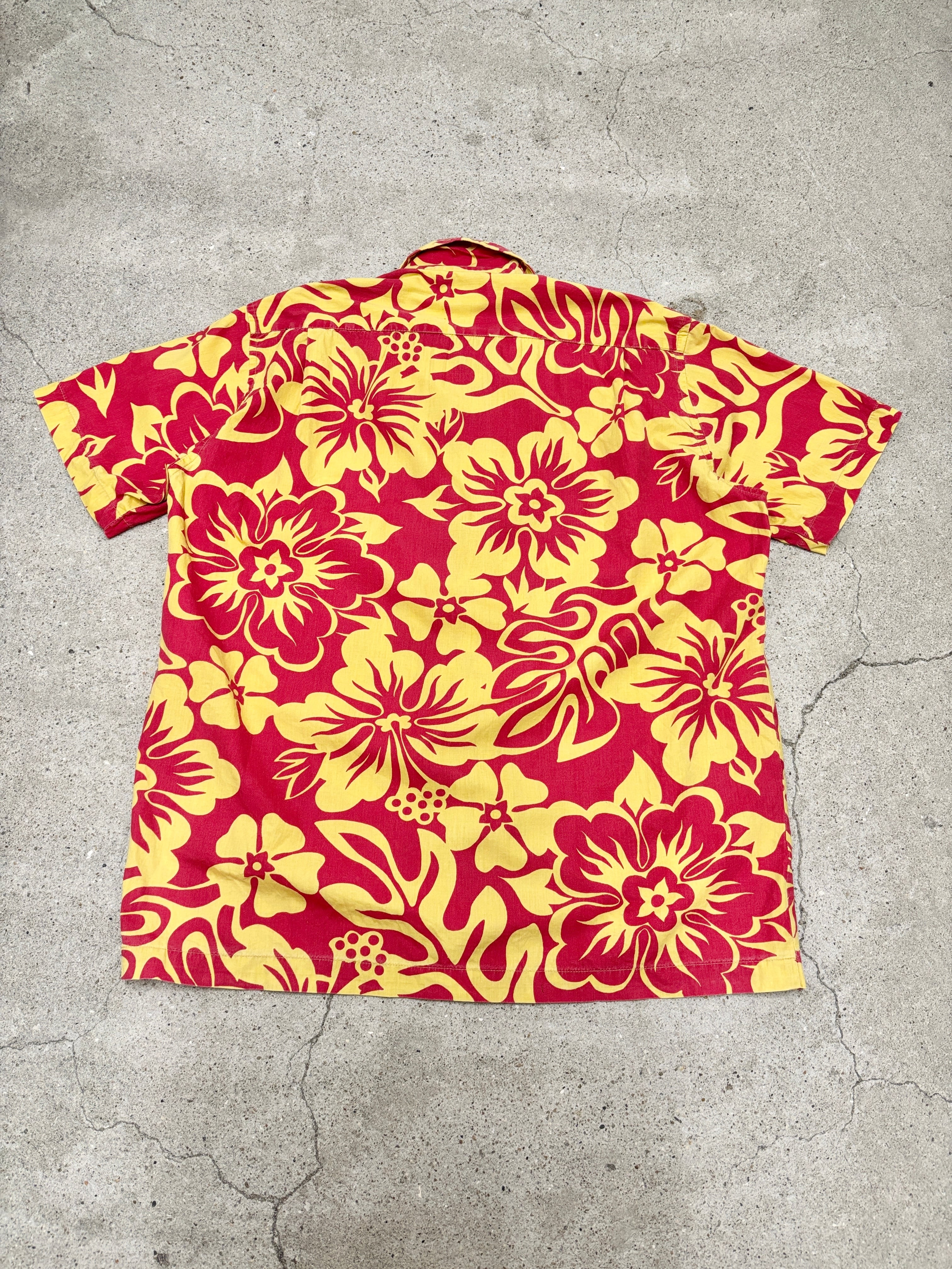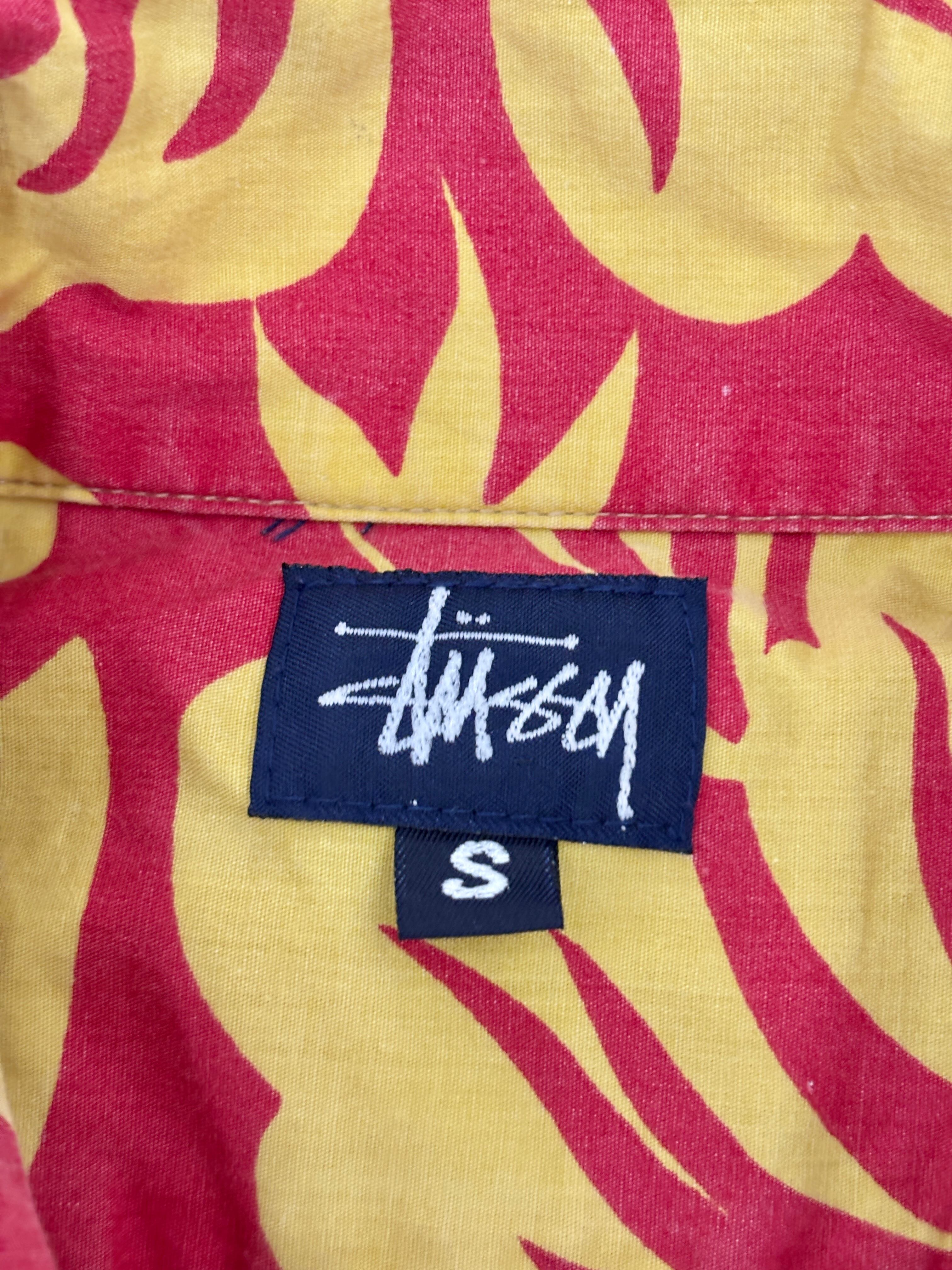 90~00s OLD STUSSY/ALOHA Shirt/USA製/紺タグ/S (M-L相当)/アロハシャツ/ハイビスカス/半袖シャツ/レッド/イエロ-/ステューシー/オ-ルドステューシー/古着/ア―カイブ