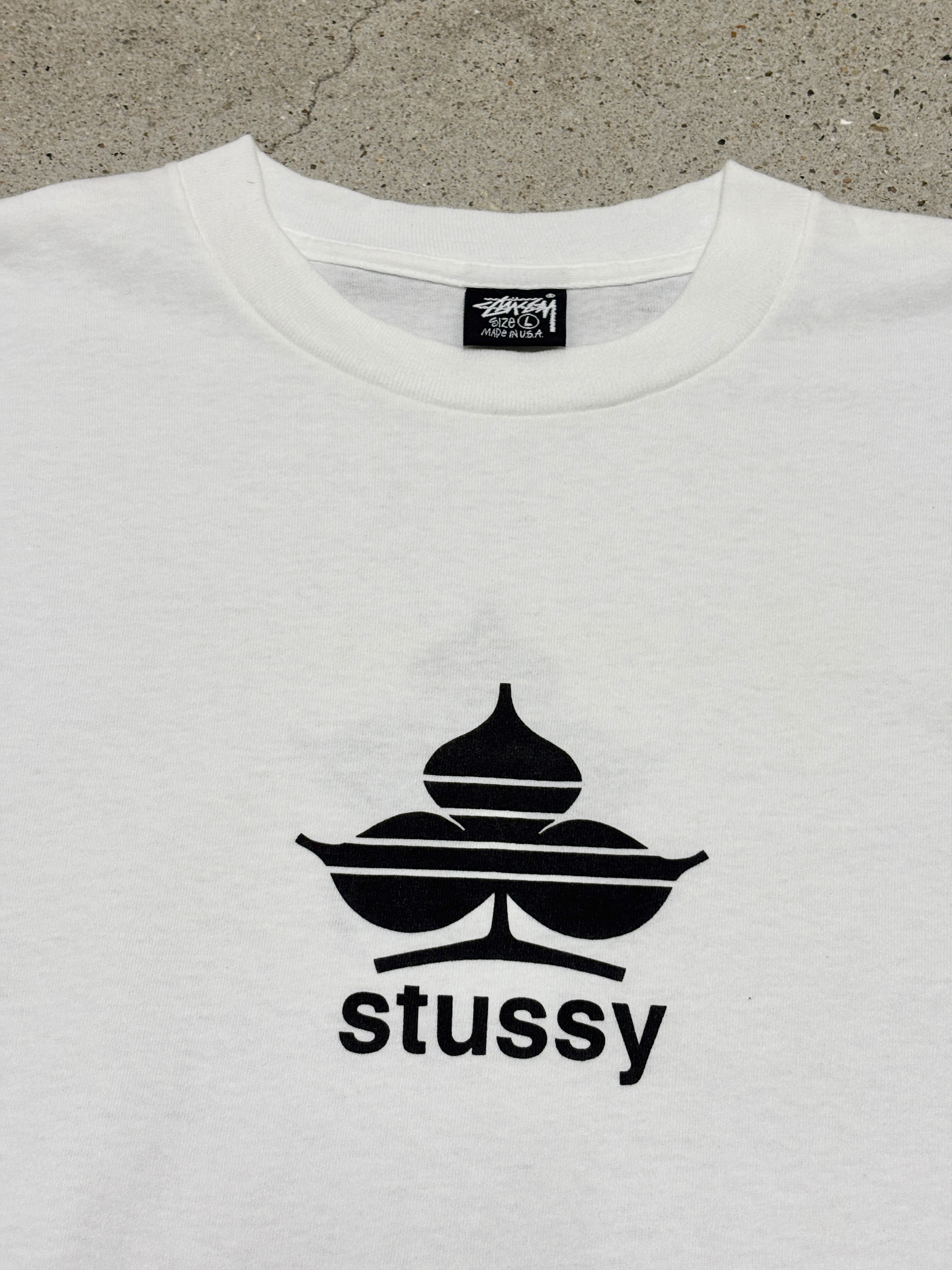 90s OLD STUSSY/Clover Logo print Tee/USA製/黒タグ/L/クロ-バ-ロゴプリントTシャツ/クラブ/ホワイト/ステューシ-/オ-ルドステューシー/古着/ア―カイブ