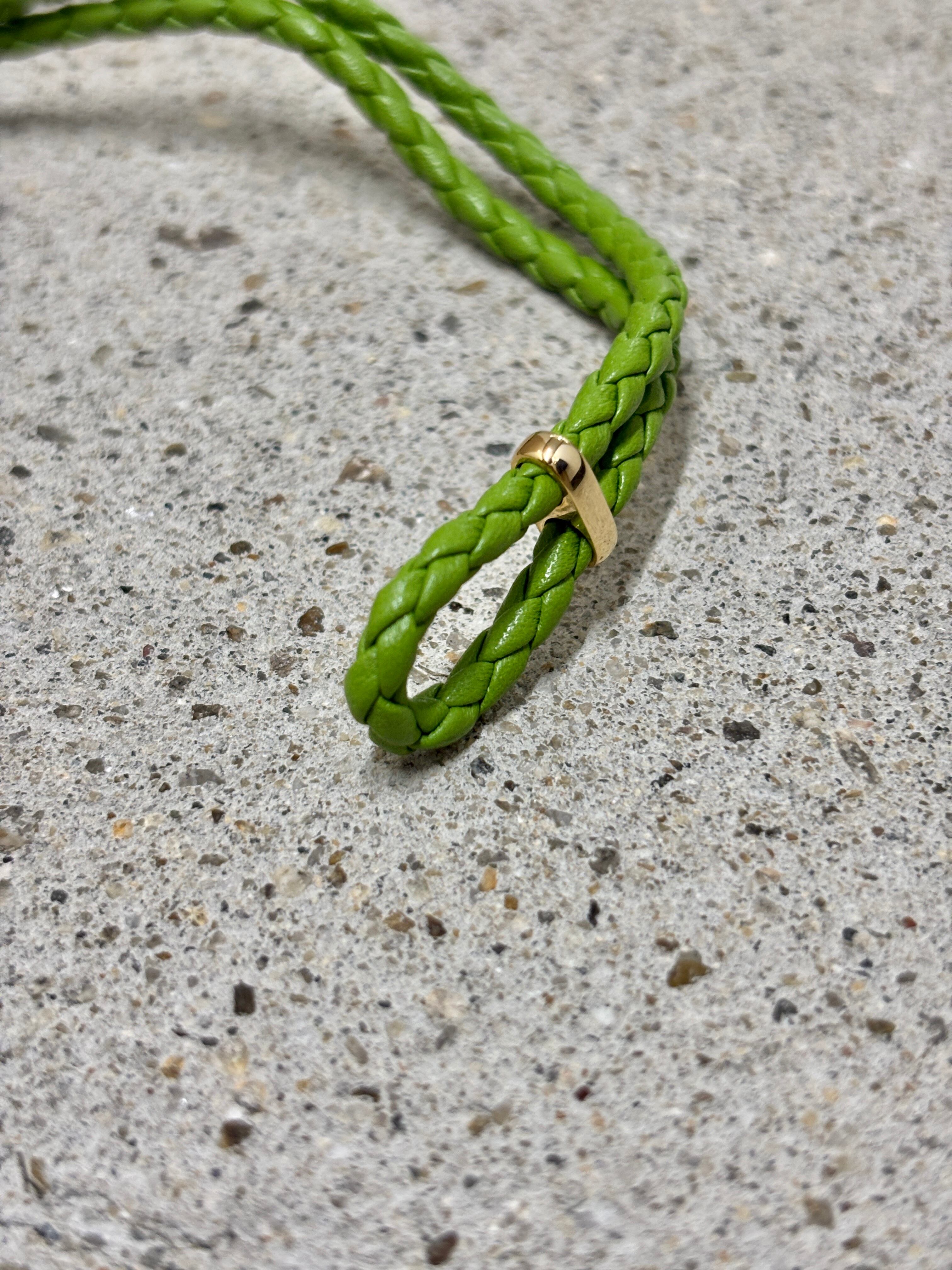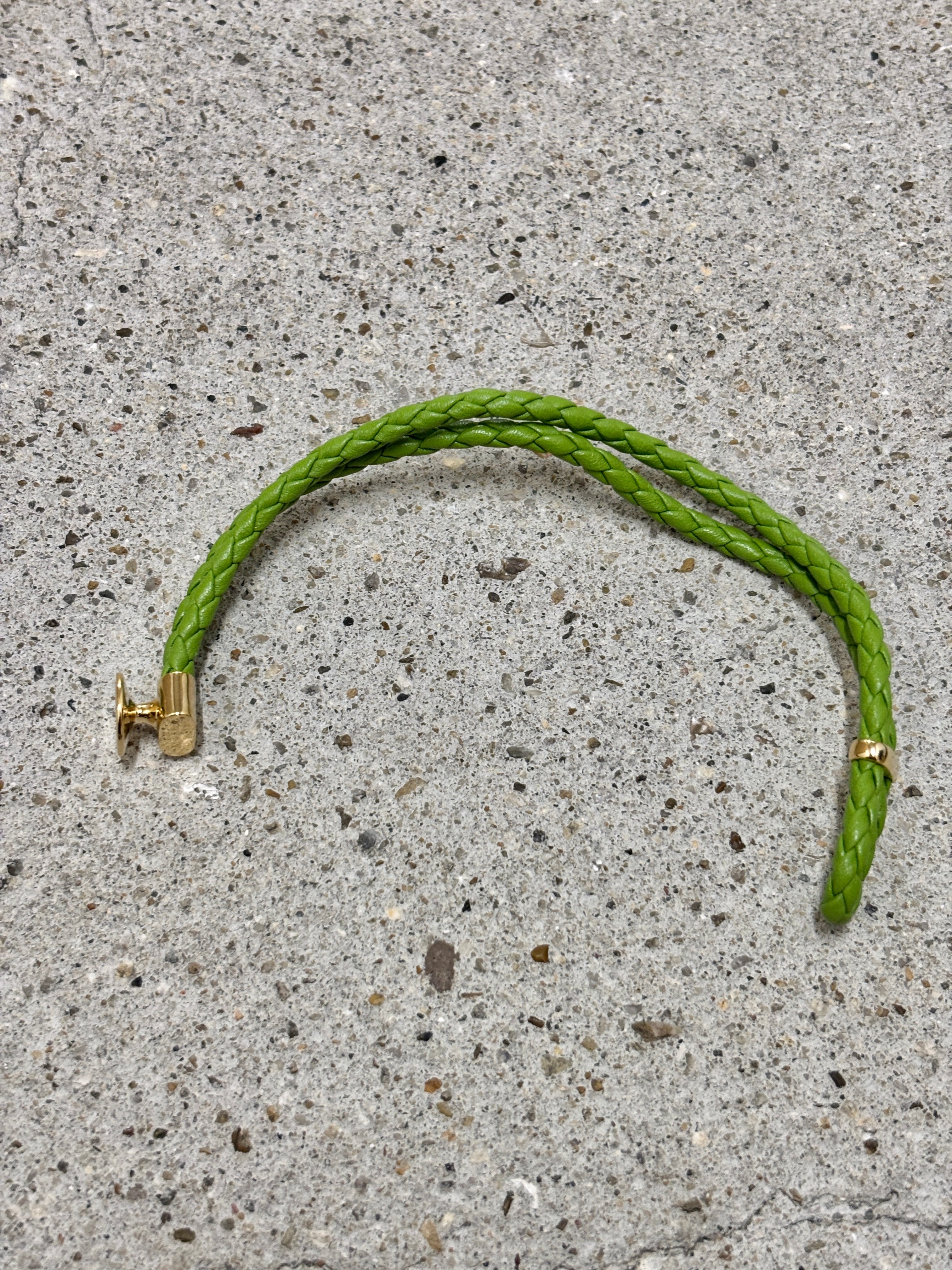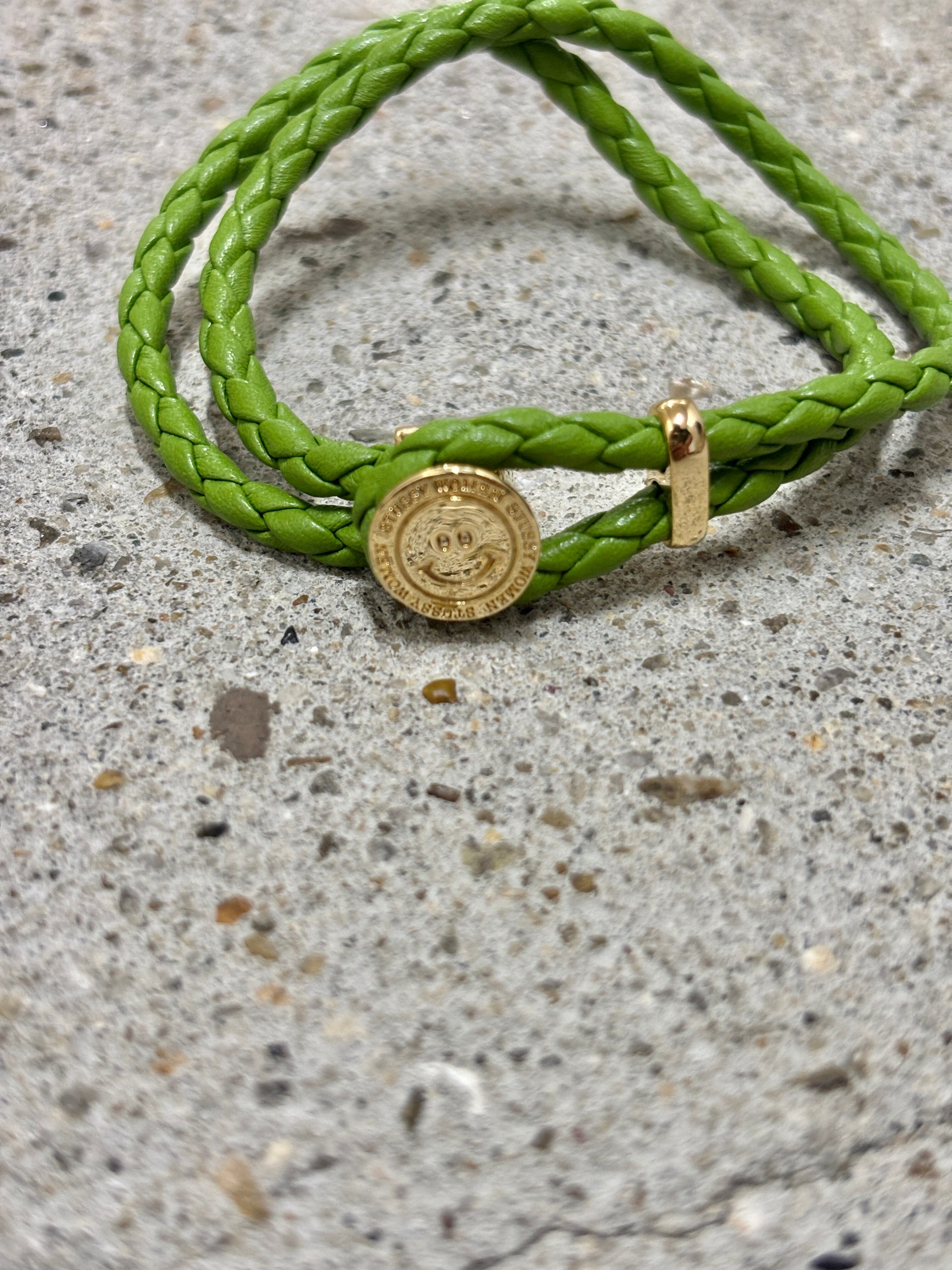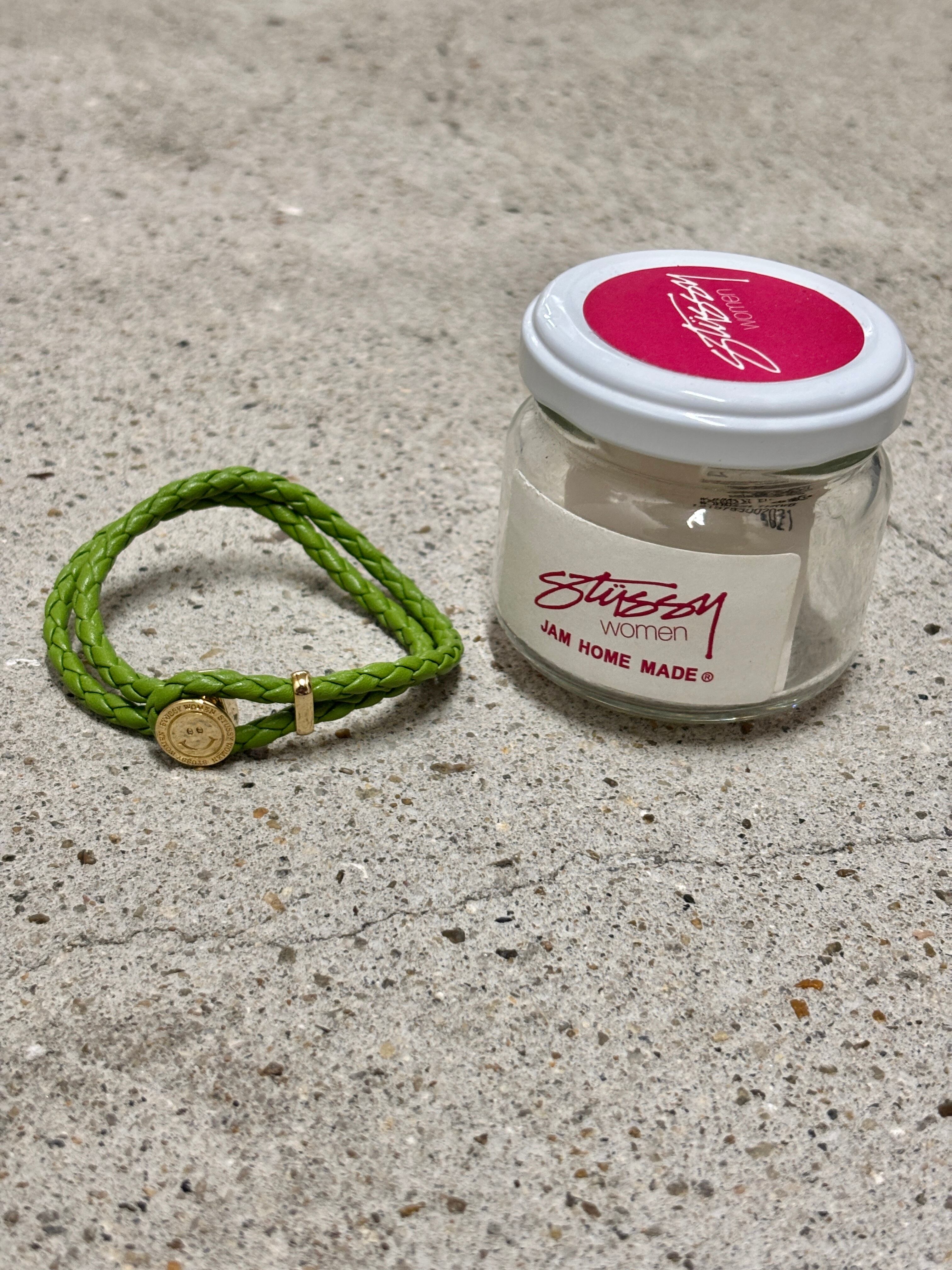 10s STUSSY WOMEN × JAM HOME MADE/Leather Bracelet/レザ-ブレスレット/編み込み/スマイル/ロゴ刻印/グリ-ン/ゴ-ルド/アクセサリ-/ジャムホームメイドコラボ/ステューシ-