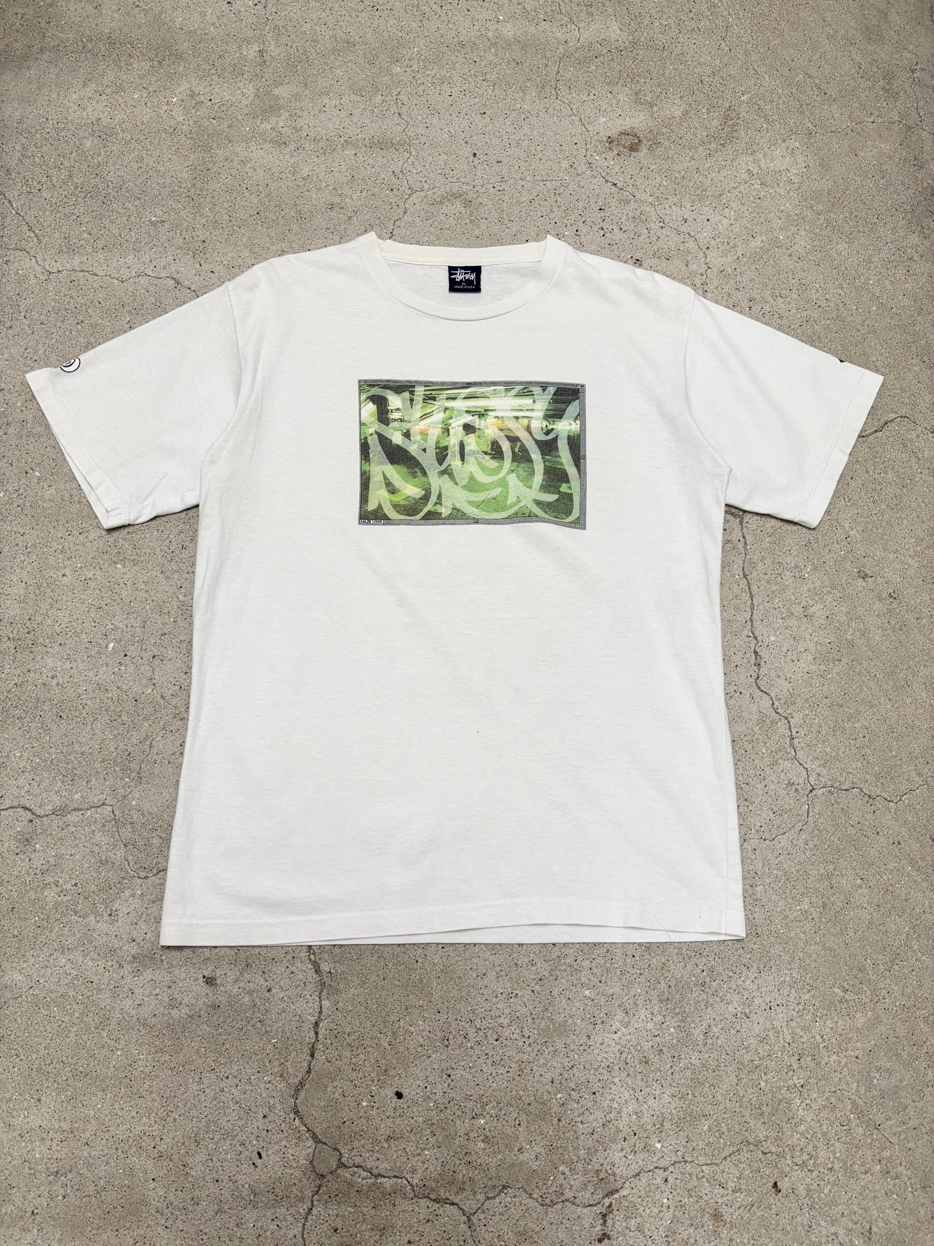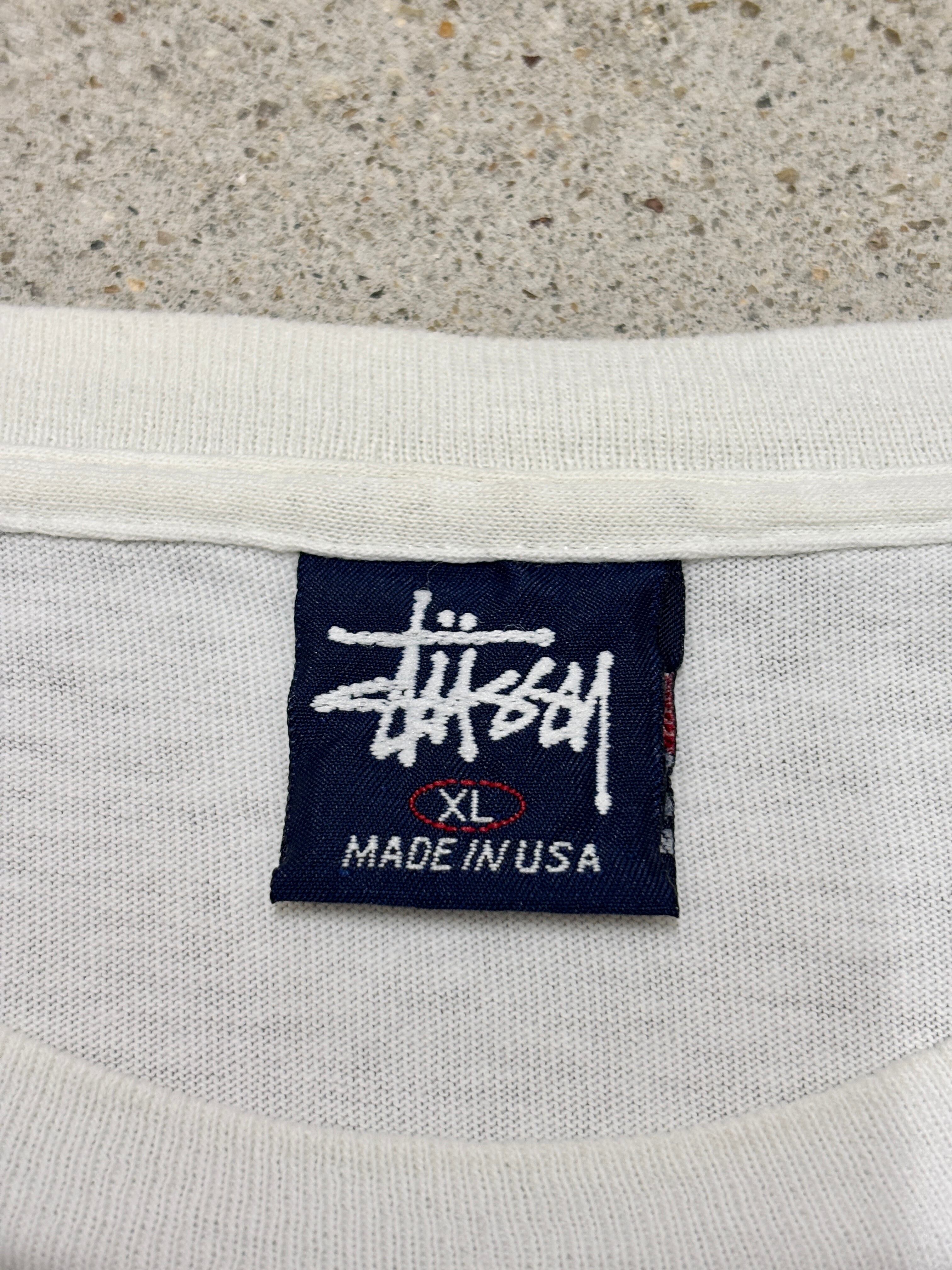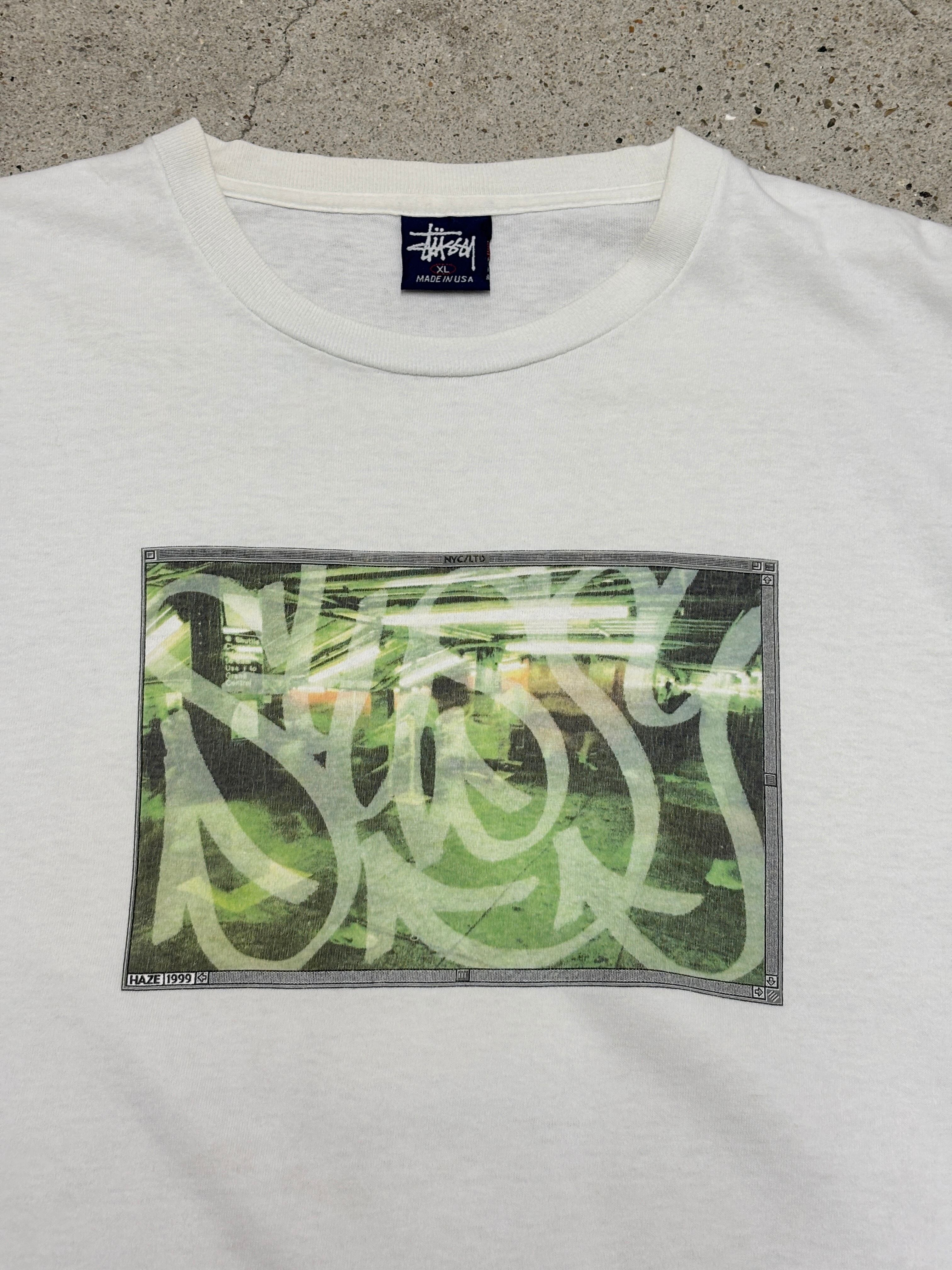 90~00s OLD STUSSY × Eric Haze/Graphic Logo print Tee/USA製/紺タグ/1999年/XL/グラフィックロゴプリントTシャツ/ホワイト/エリックヘイズコラボ/ステューシー/オ-ルドステューシー/古着/ア―カイブ