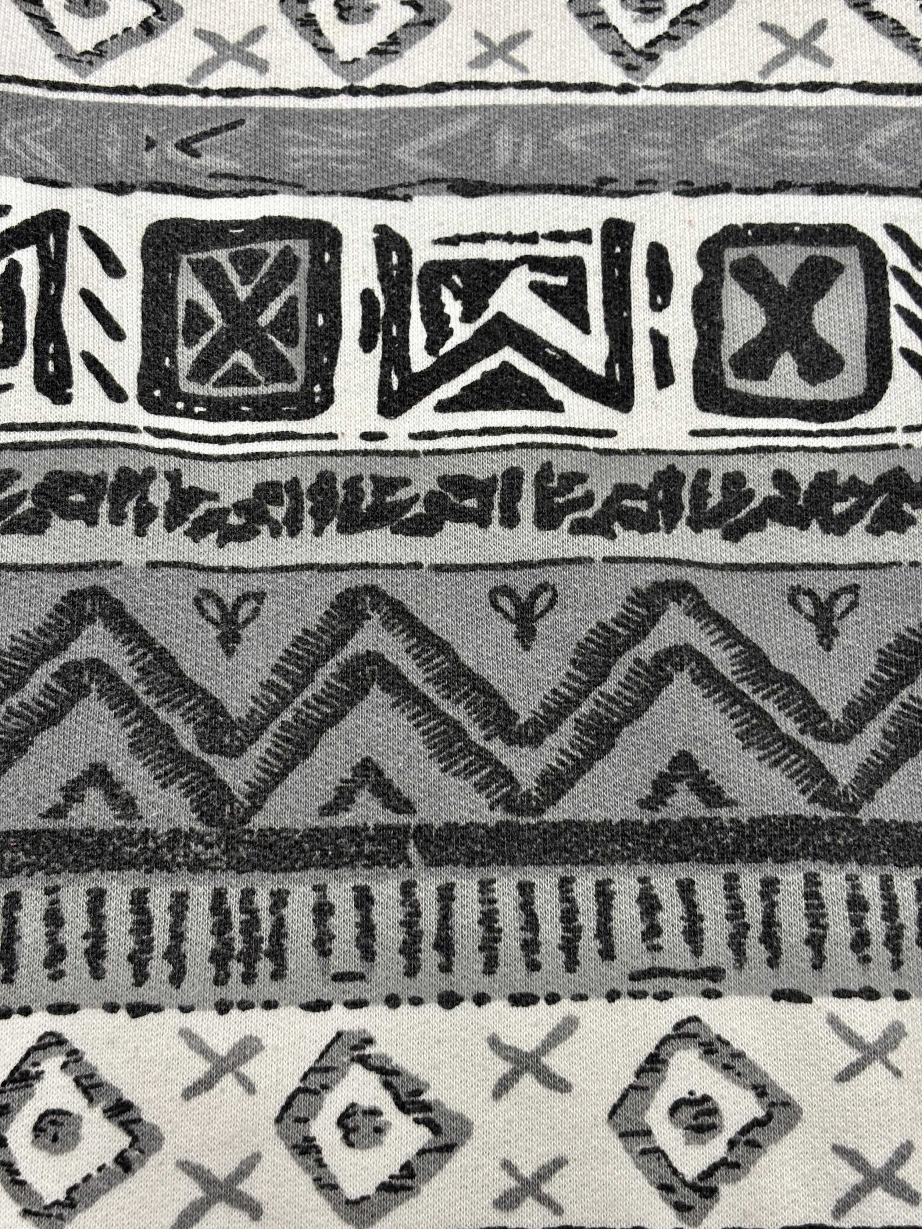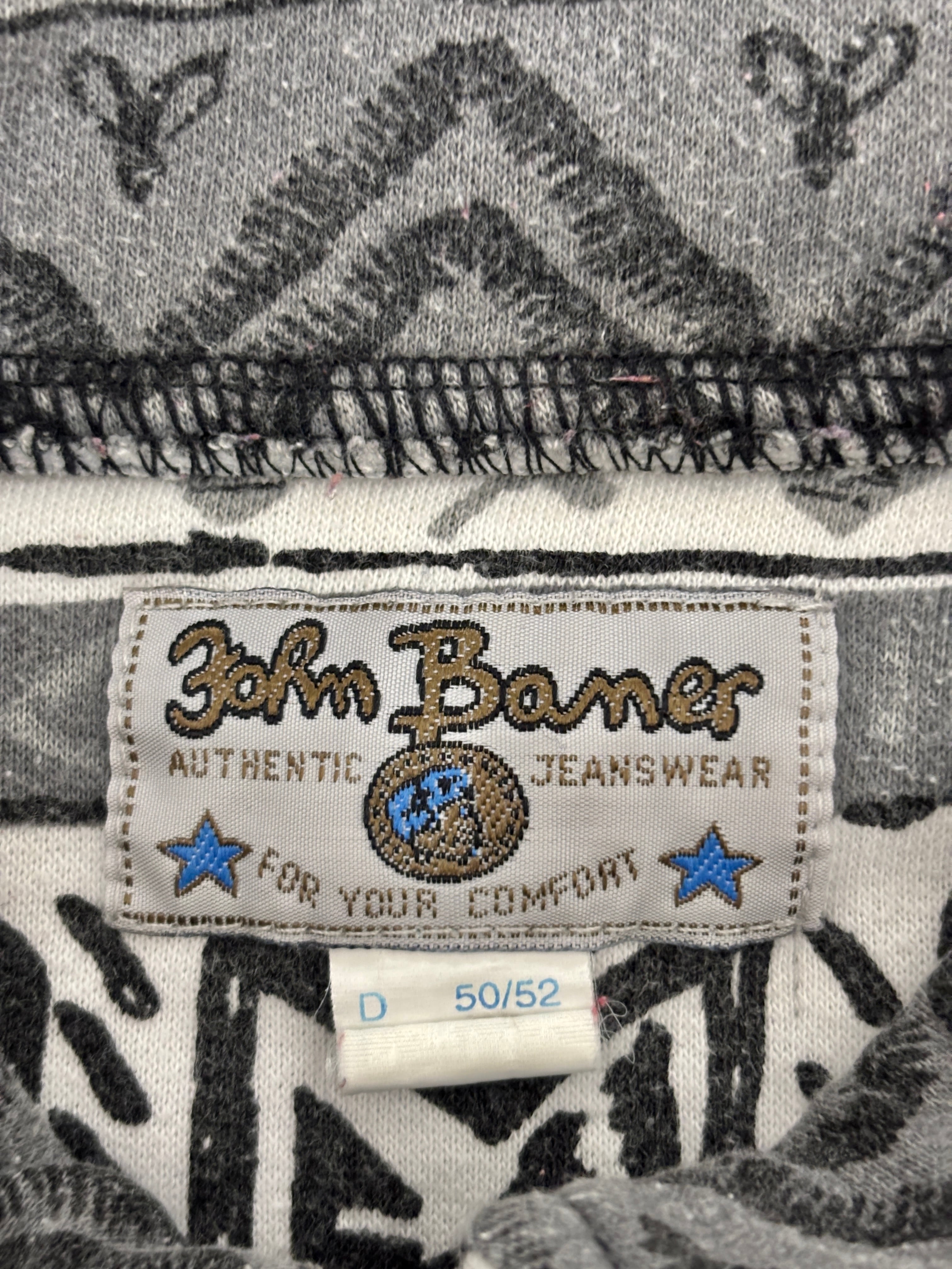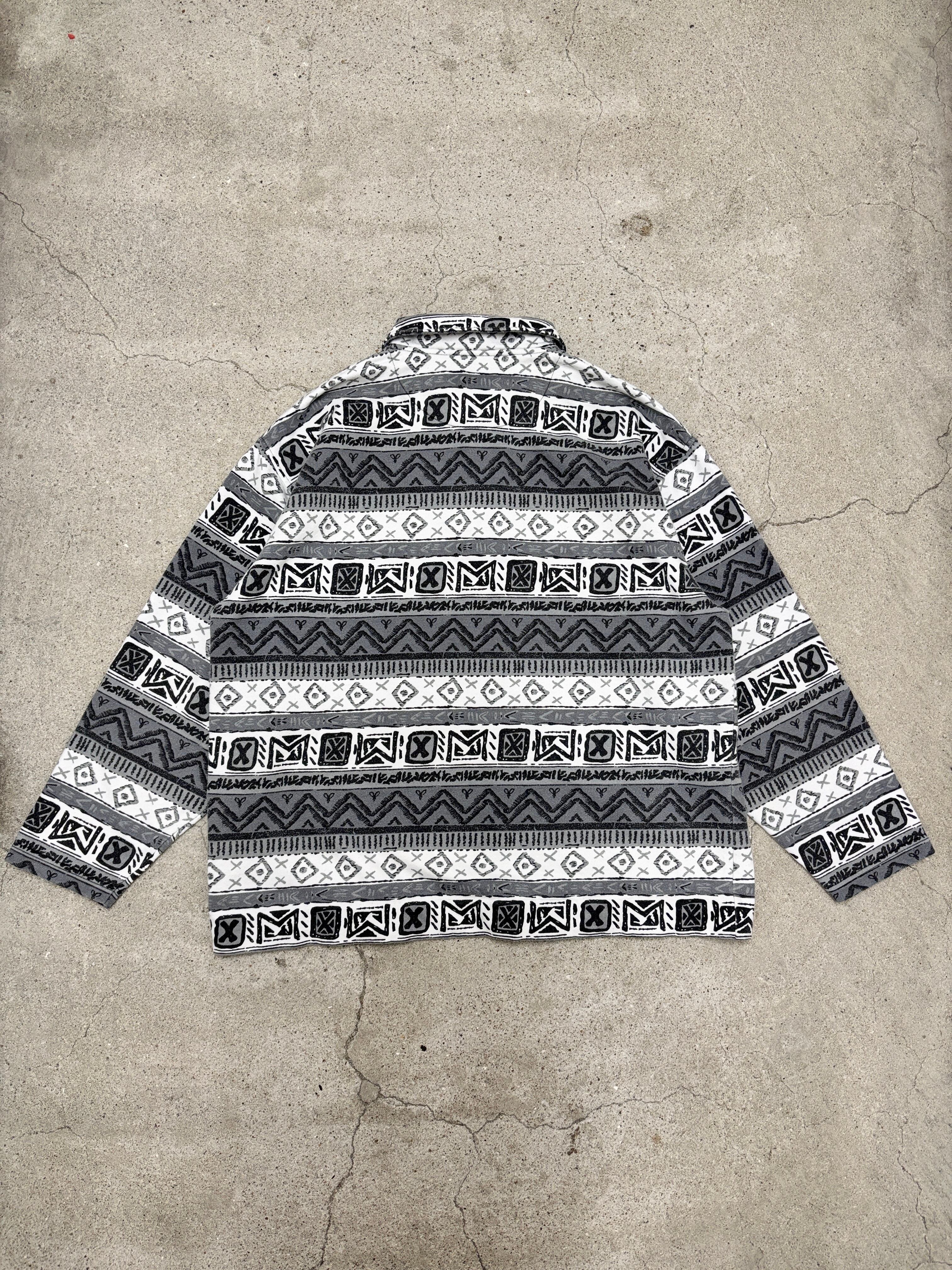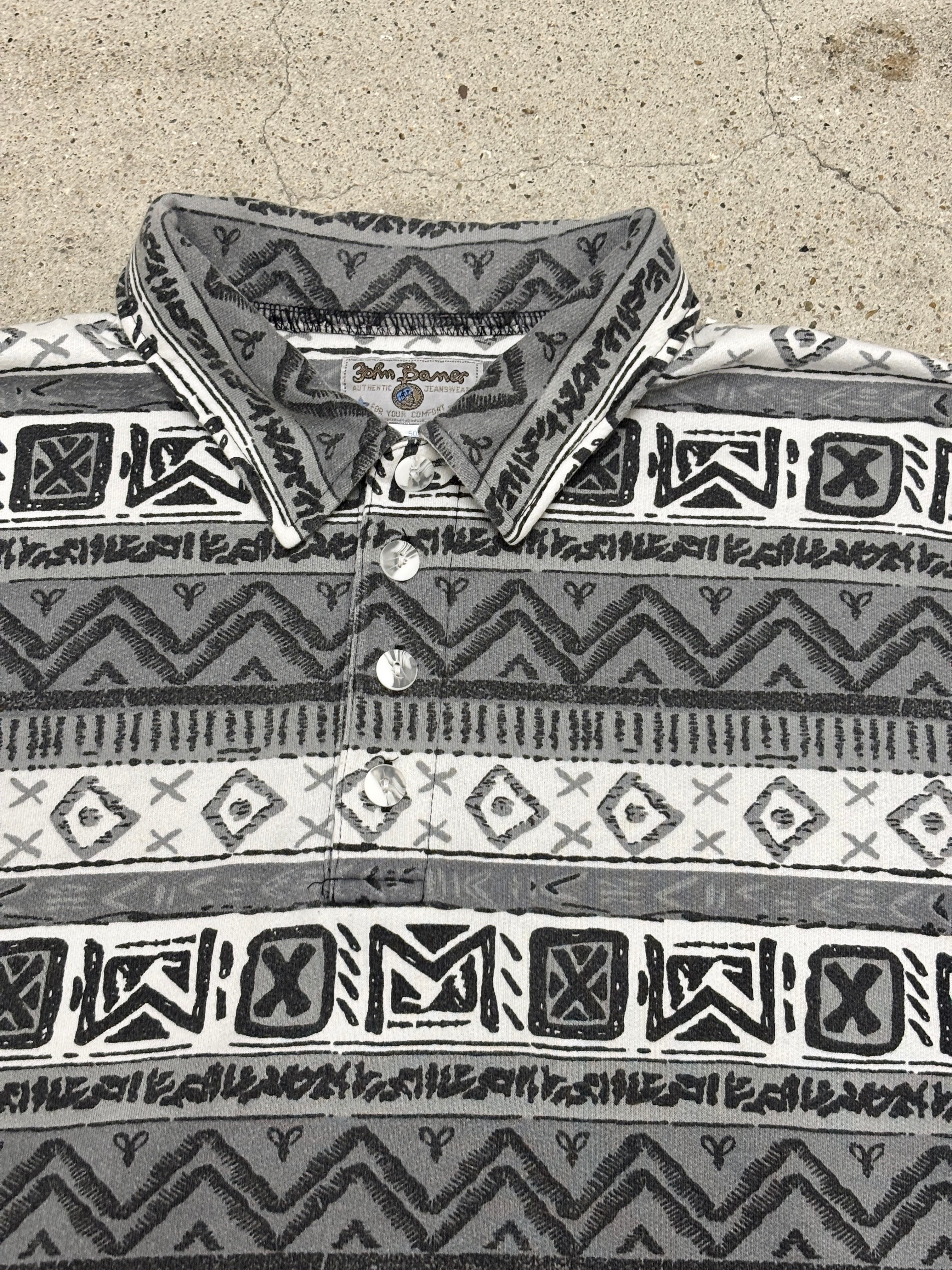 90s John Baner/Multi print L/S Polo Shirt/XL相当/総柄/長袖ポロシャツ/マルチプリント/グレ-/ホワイト/ジョンバナ-/古着