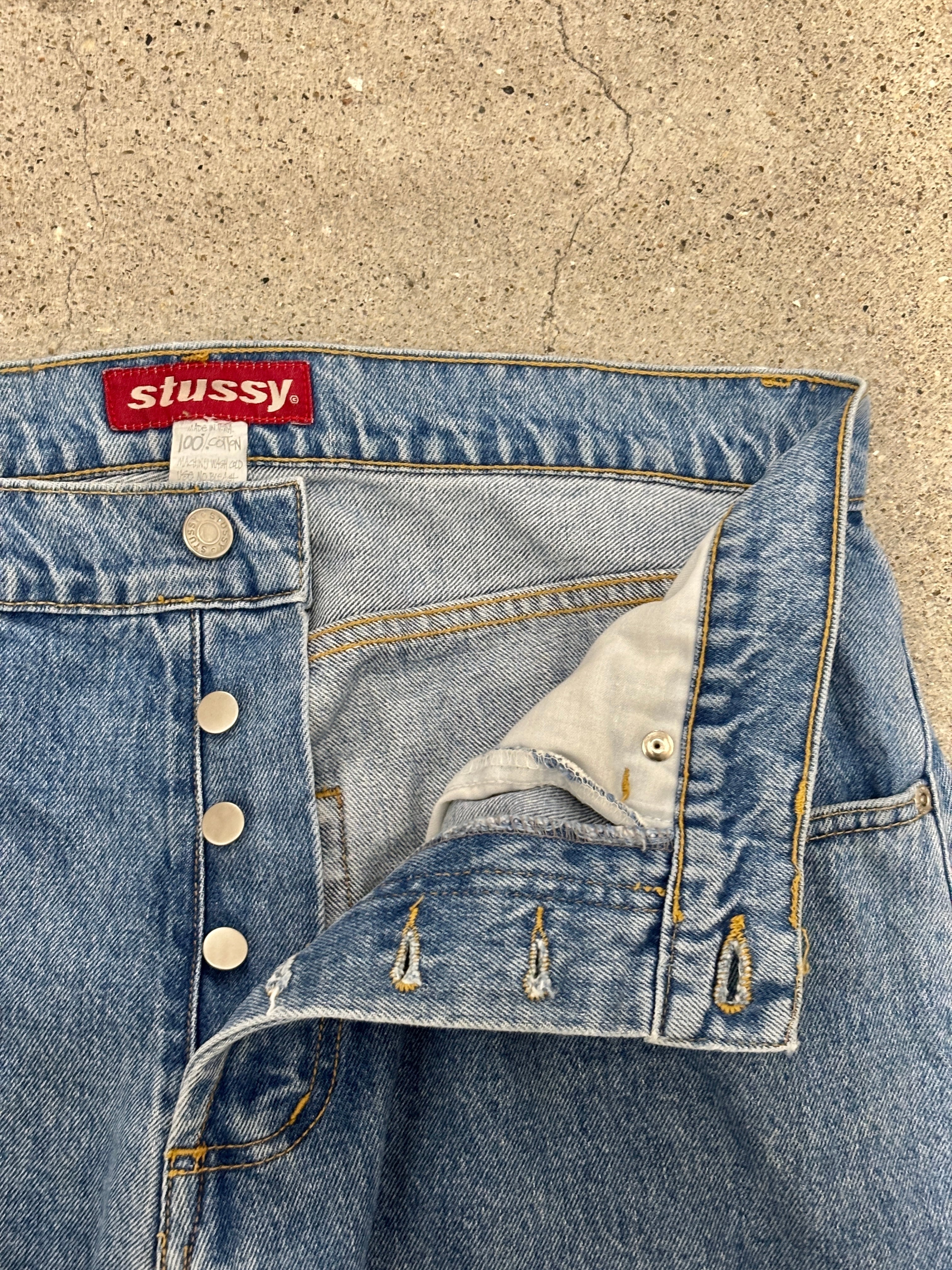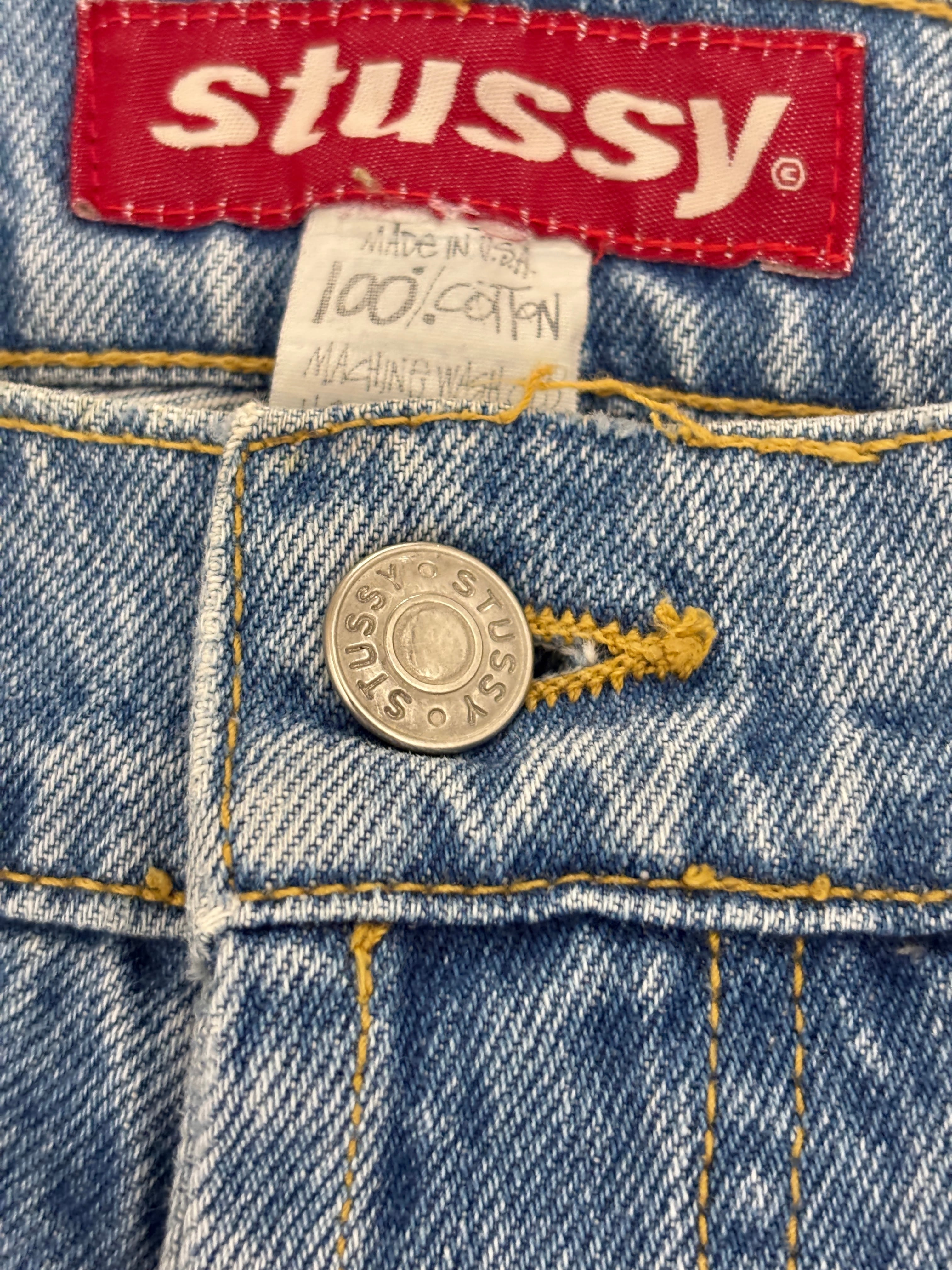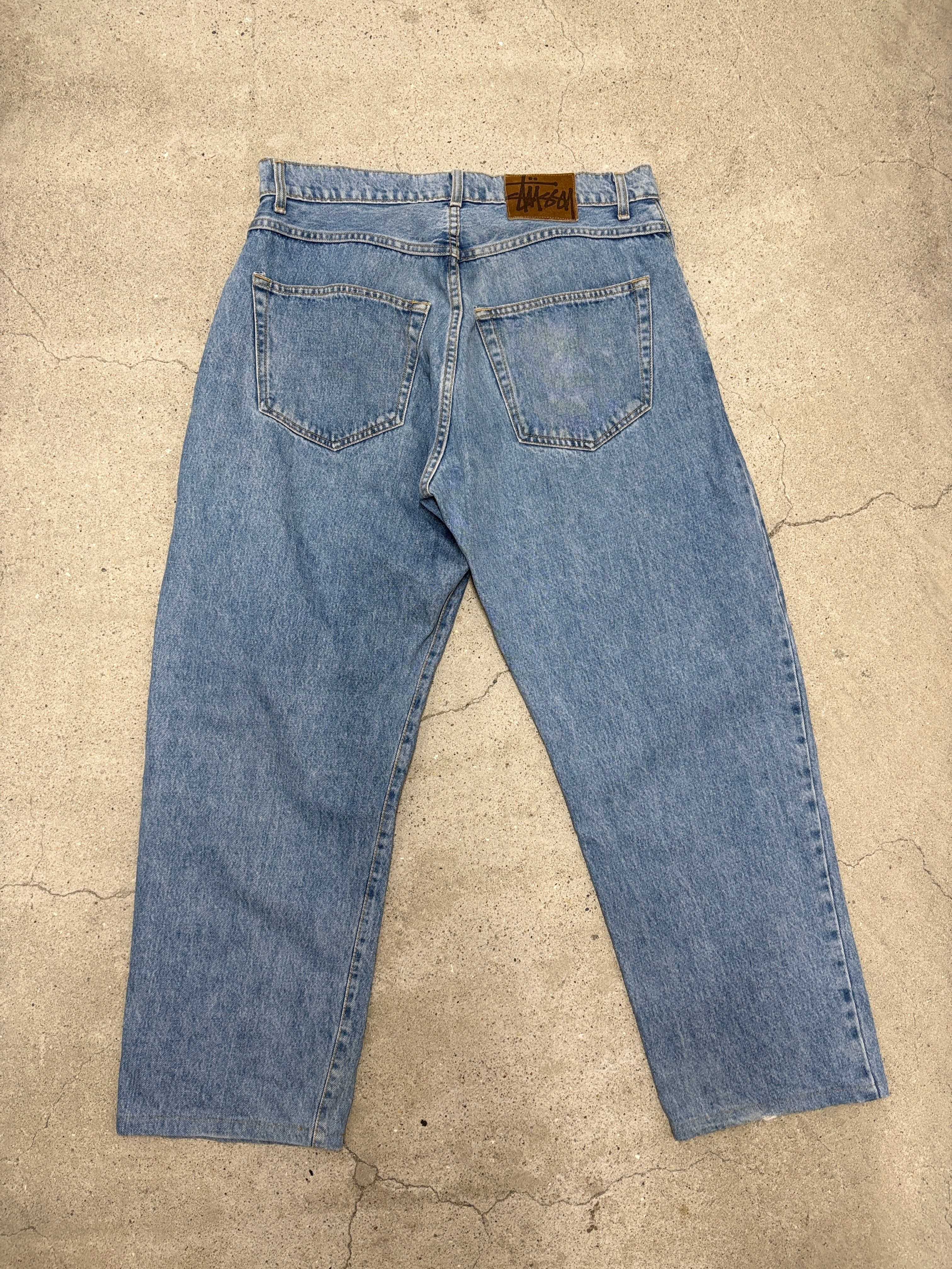 90s OLD STUSSY/Denim pants/USA製/W33〜34相当/デニムパンツ/ボトム/ワイド/アイスブル-/ステューシー/オ-ルドステューシー