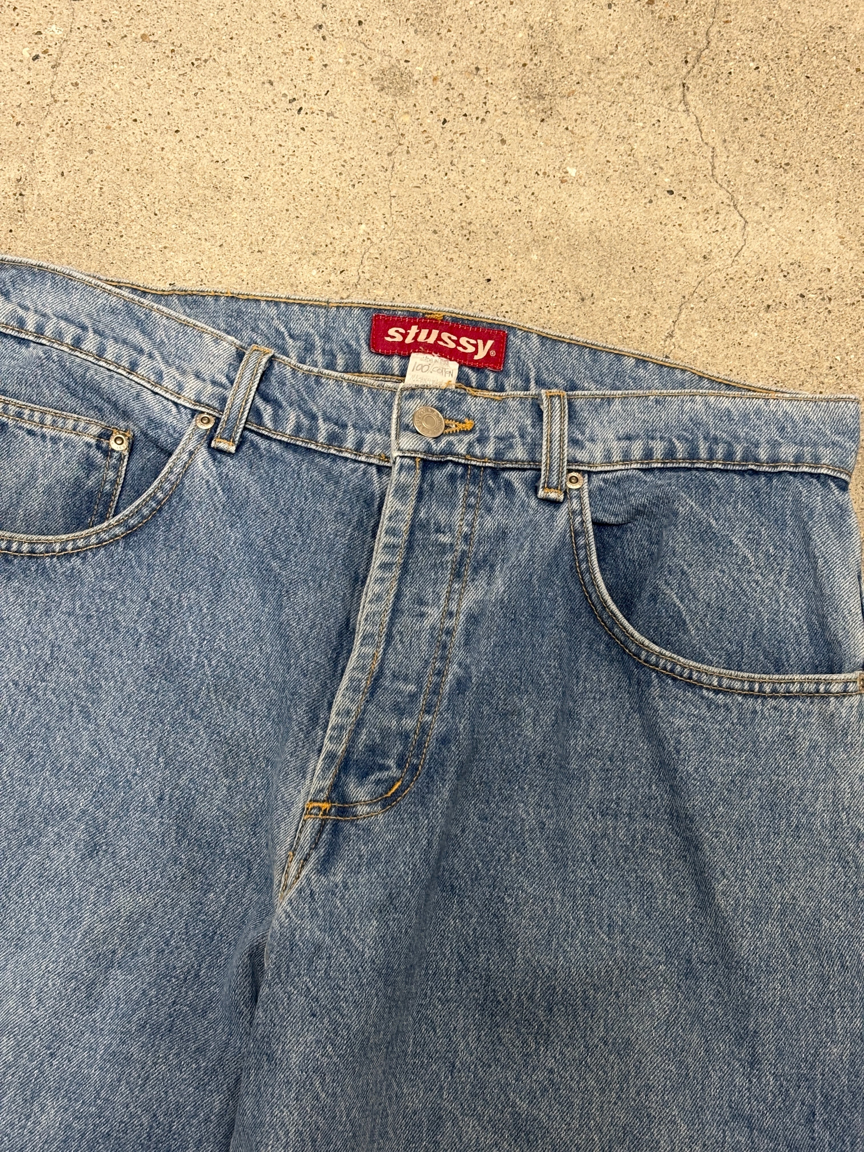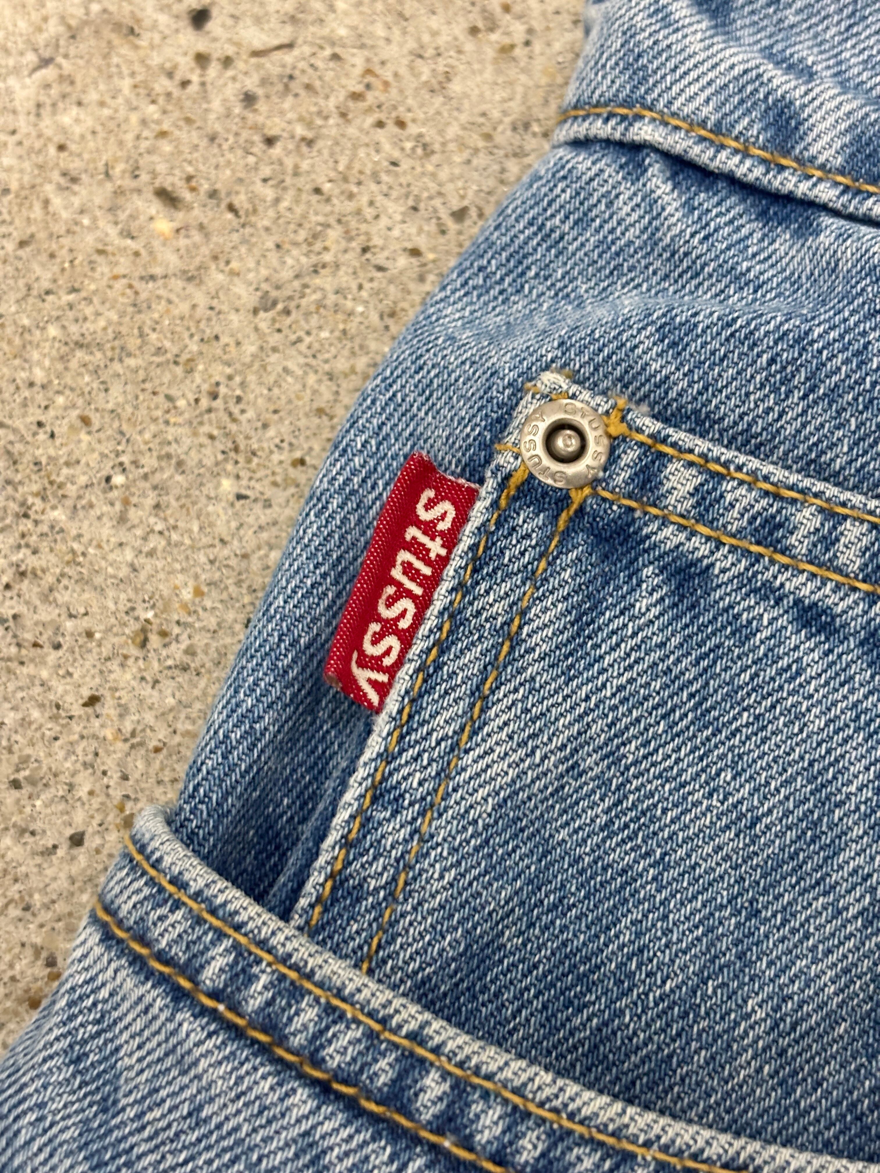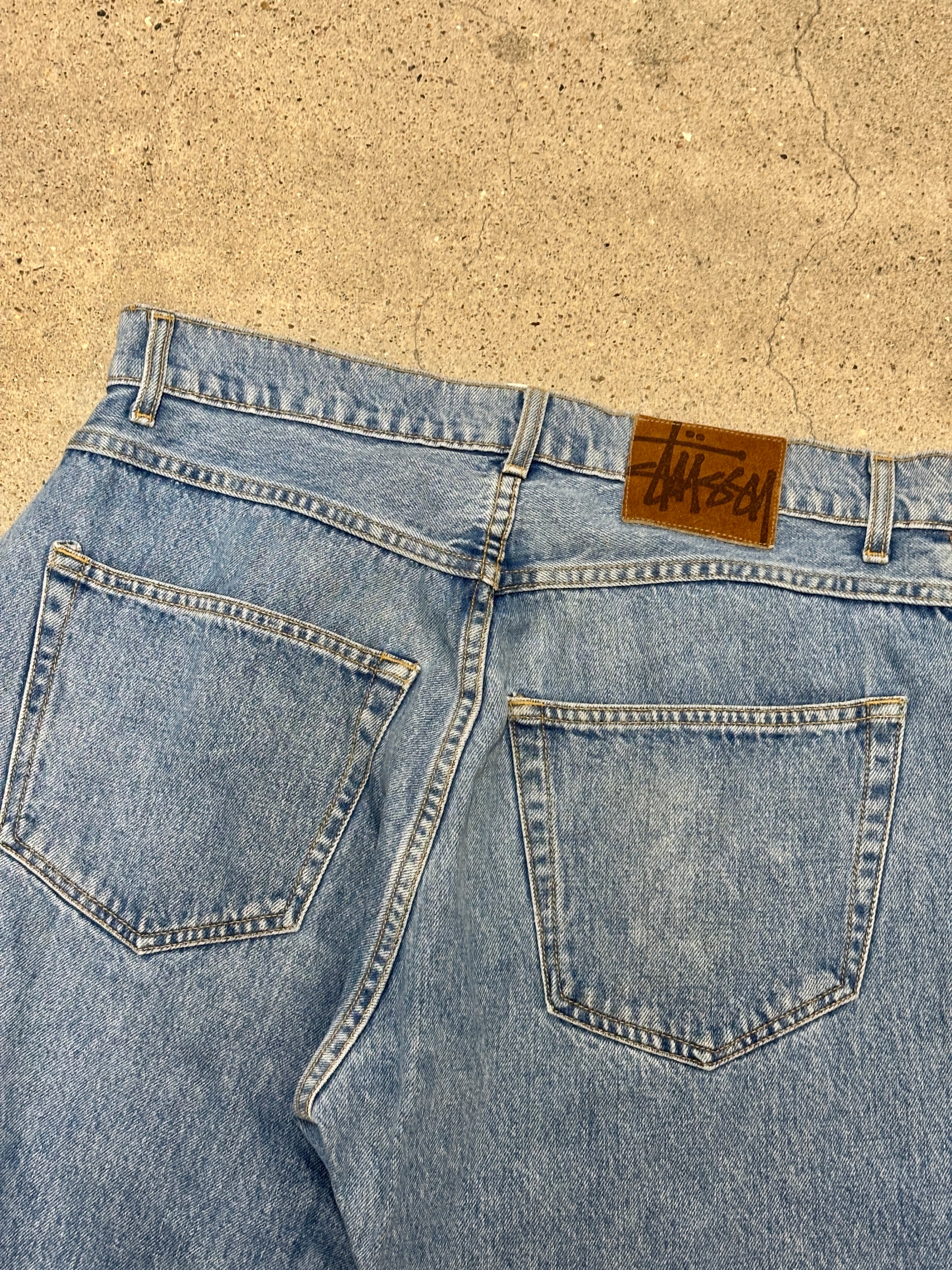 90s OLD STUSSY/Denim pants/USA製/W33〜34相当/デニムパンツ/ボトム/ワイド/アイスブル-/ステューシー/オ-ルドステューシー