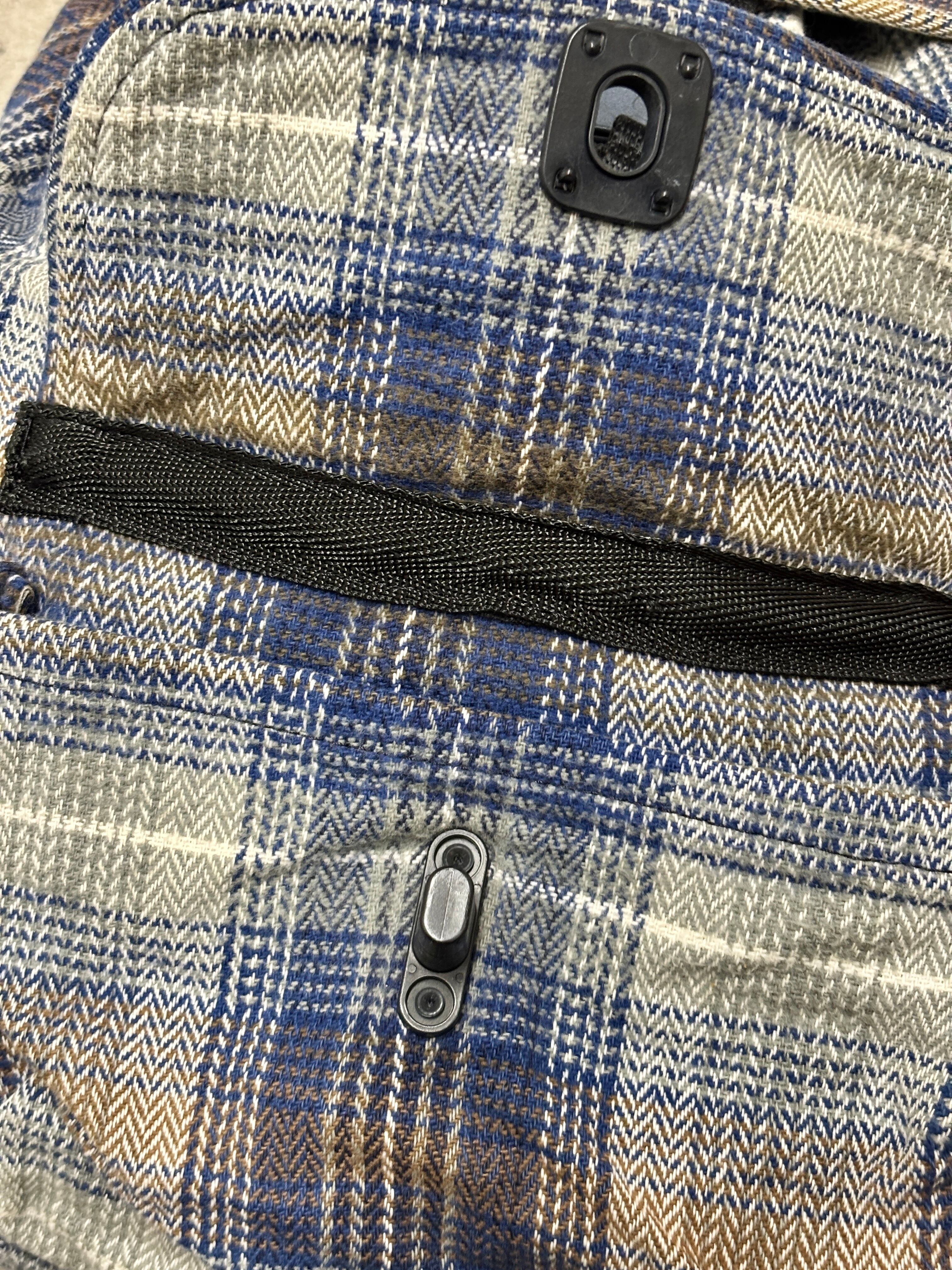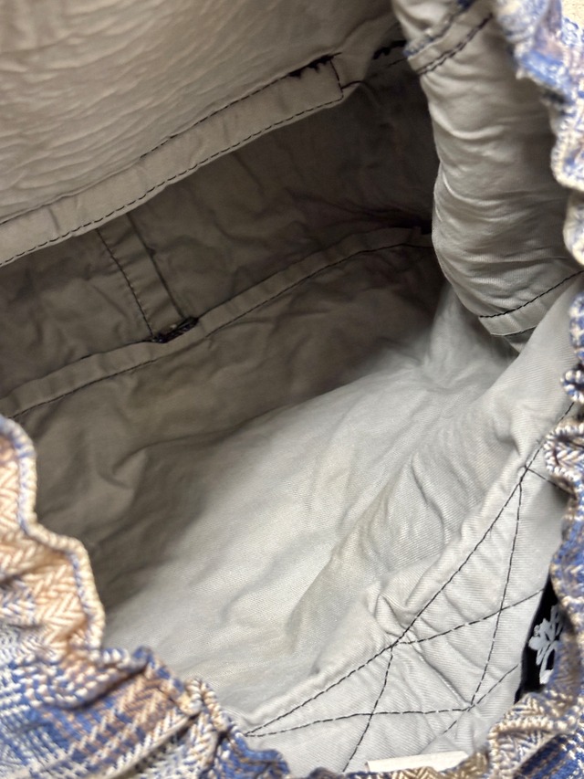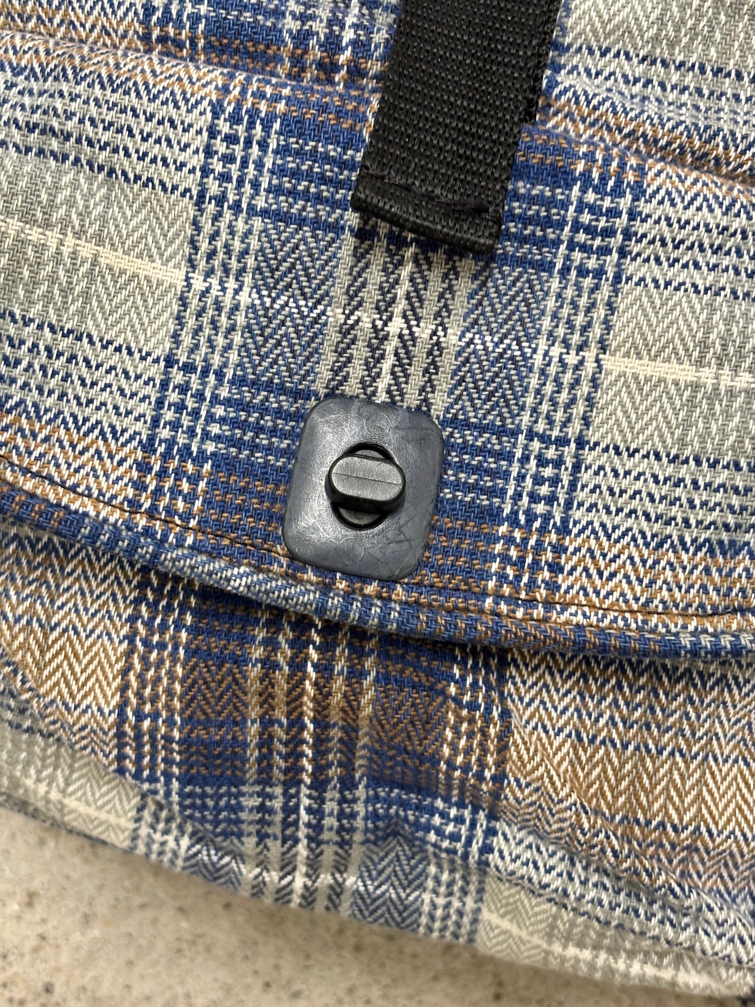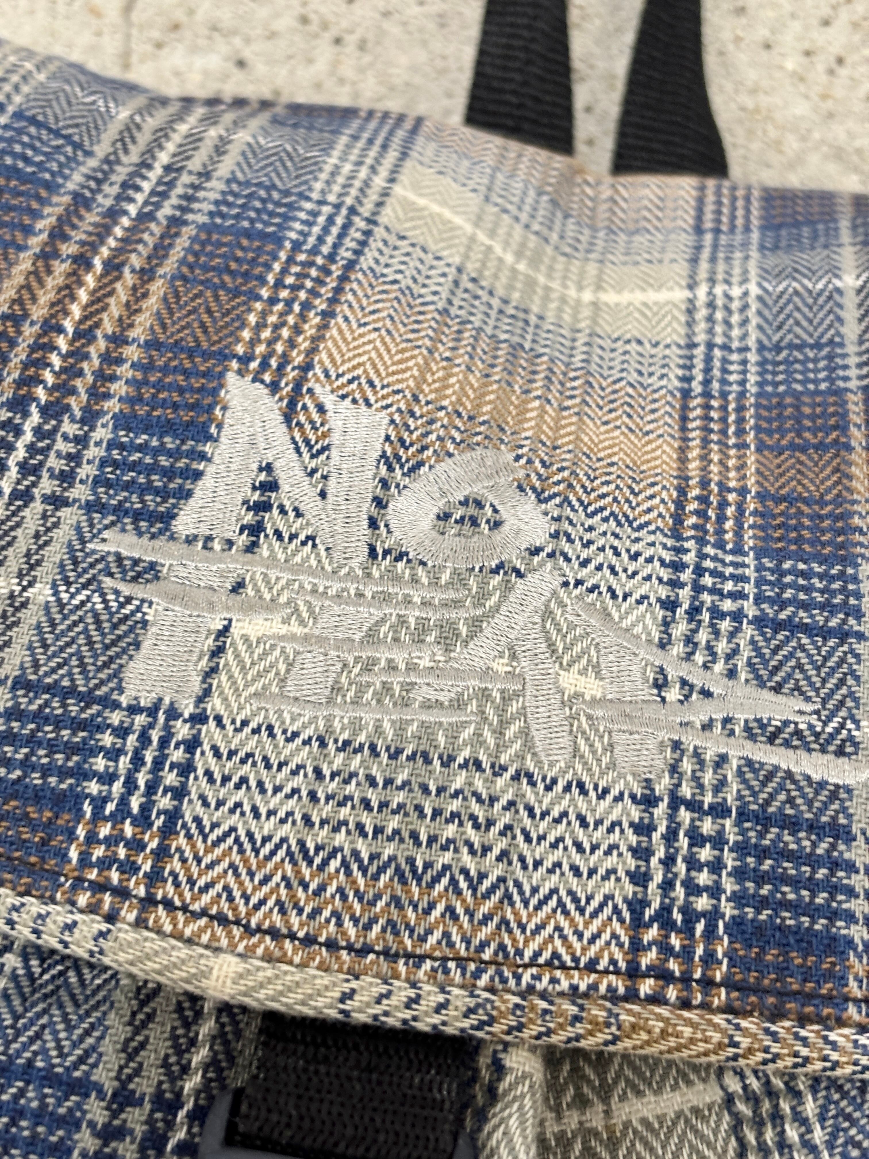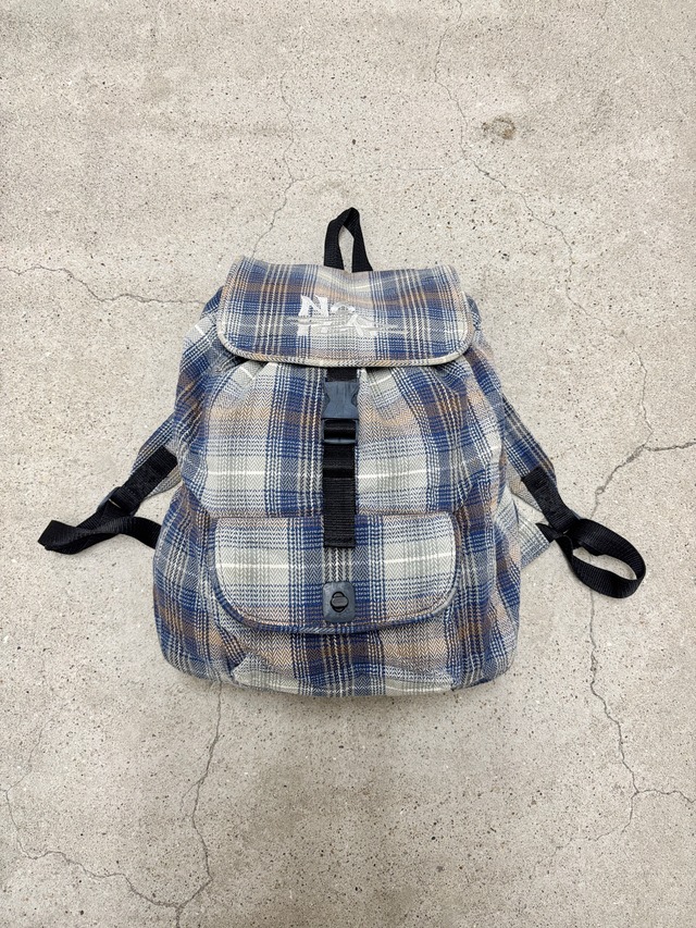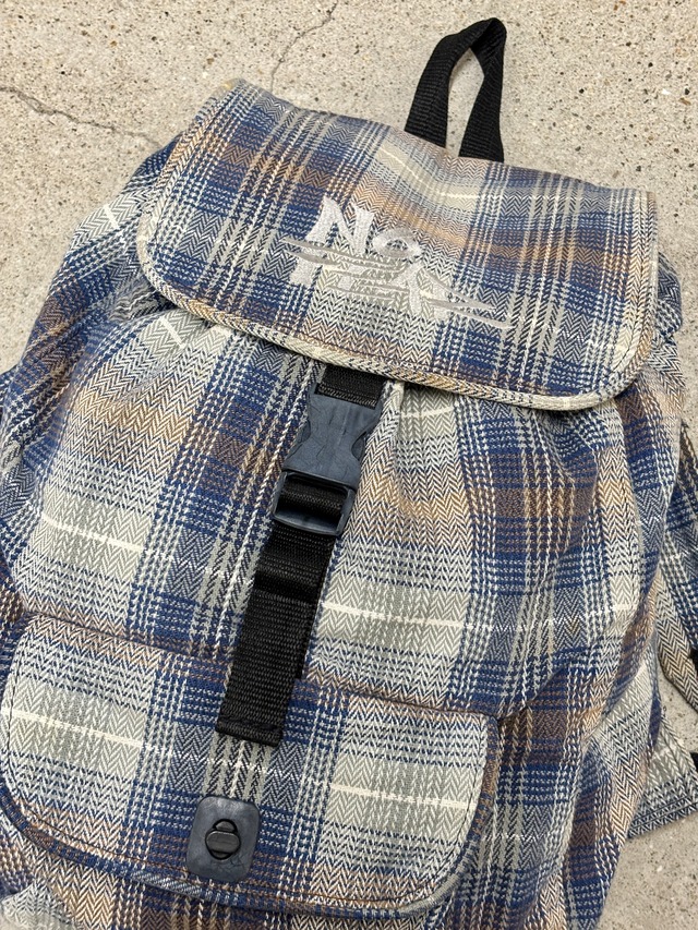 90s NO FEAR/Logo embroidery Backpack/USA製/刺繍ロゴ/バックパック/リュック/チェック柄/ネイビ-/グレ-/ノ-フィア-/バッグ/鞄/スケ-ト/スケートボード/古着