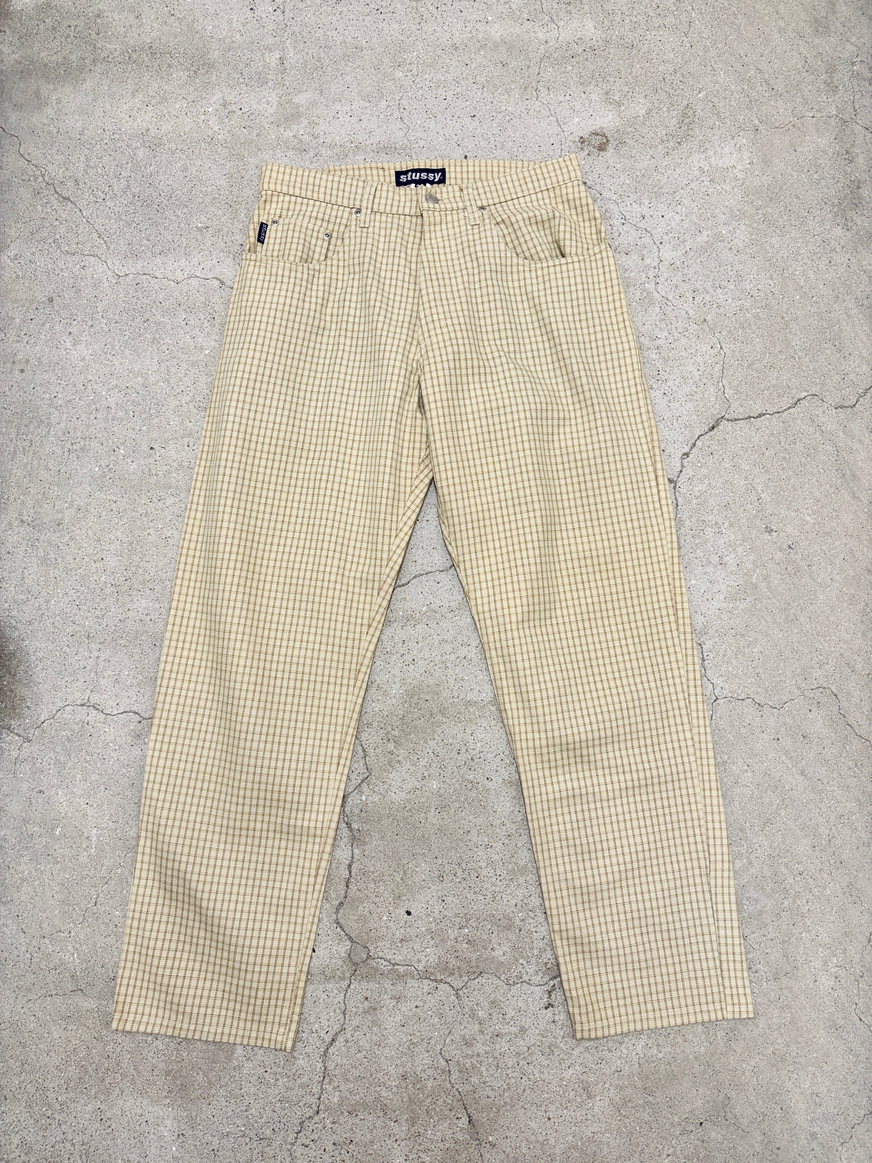 90s OLD STUSSY/Check pants/USA製/紺タグ/W32/チェック柄パンツ/ストレ-ト/ボトム/クリ-ム/ステューシー/オ-ルドステューシー