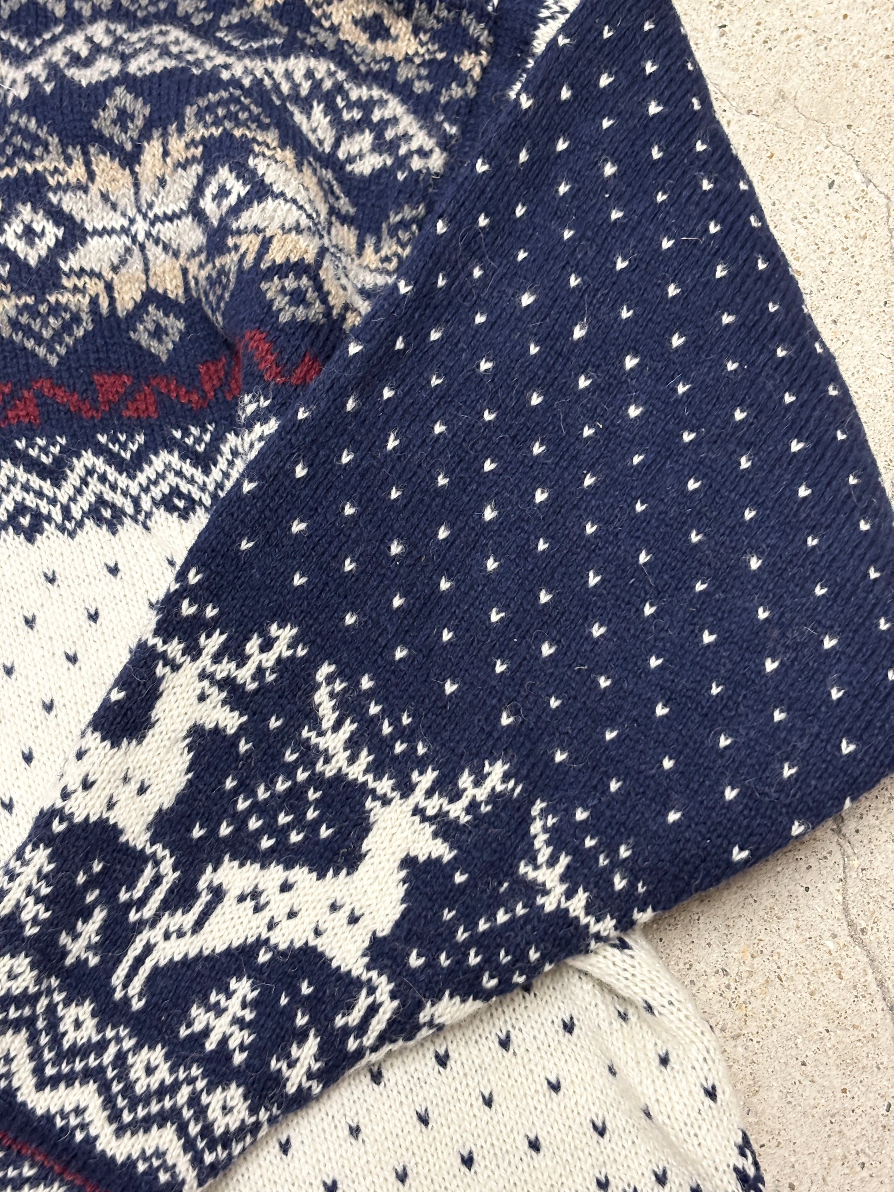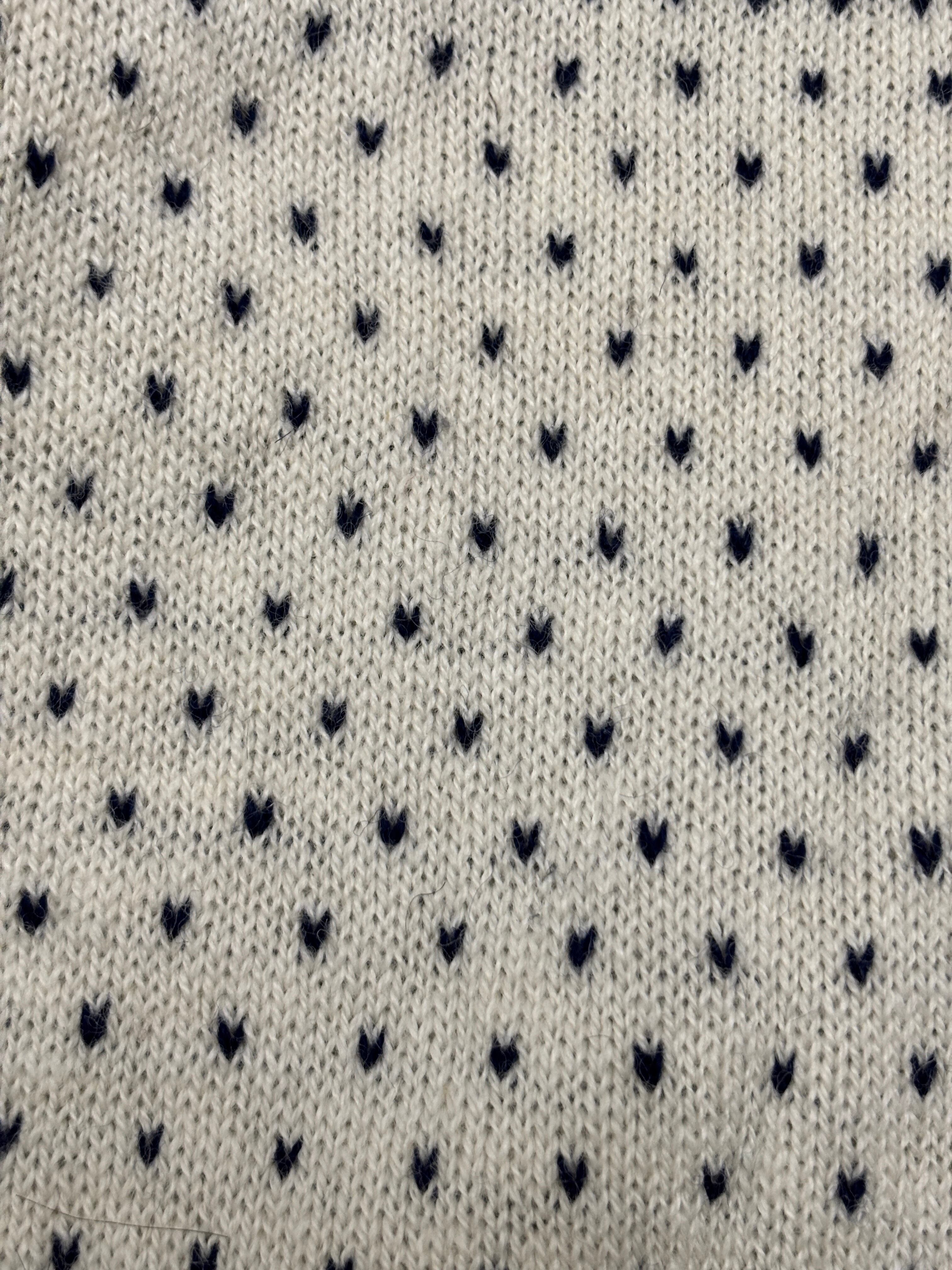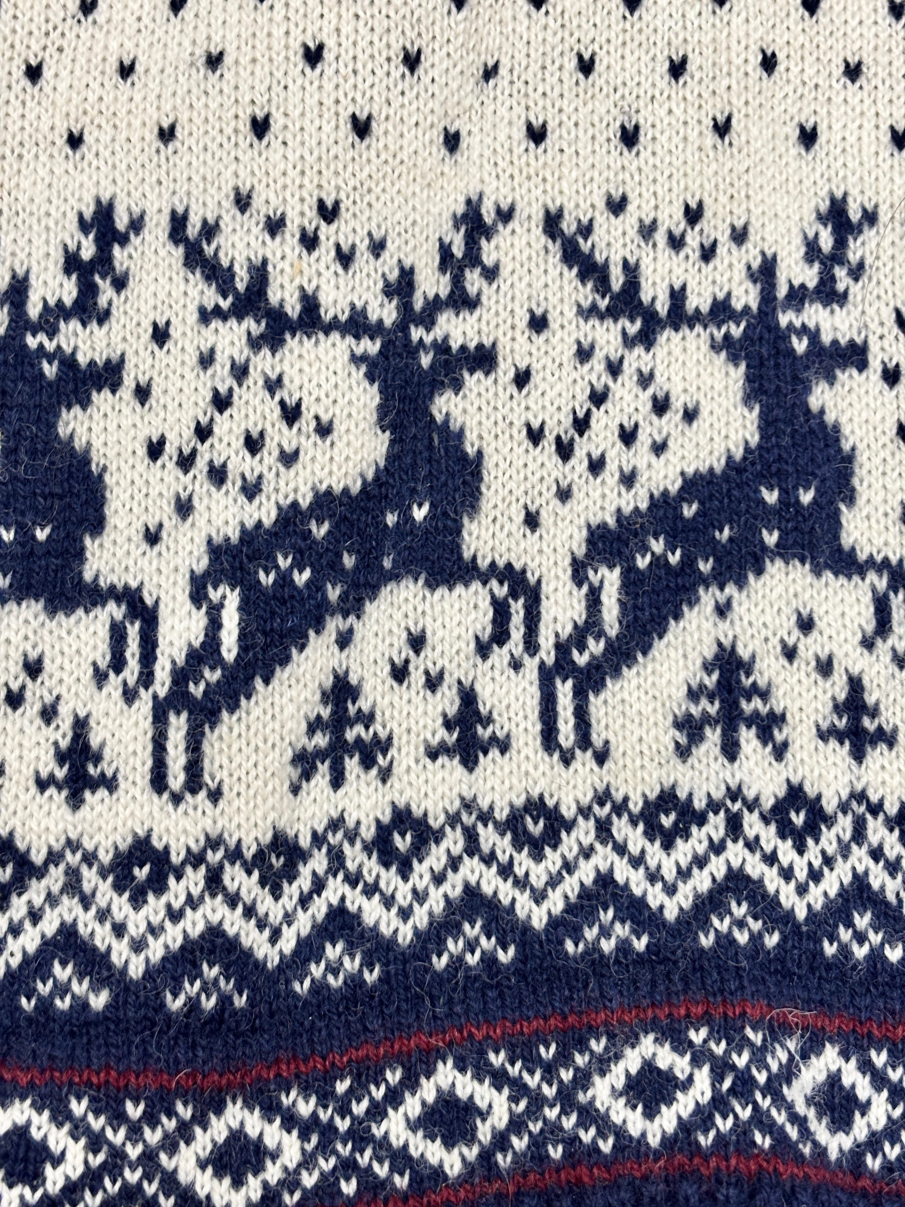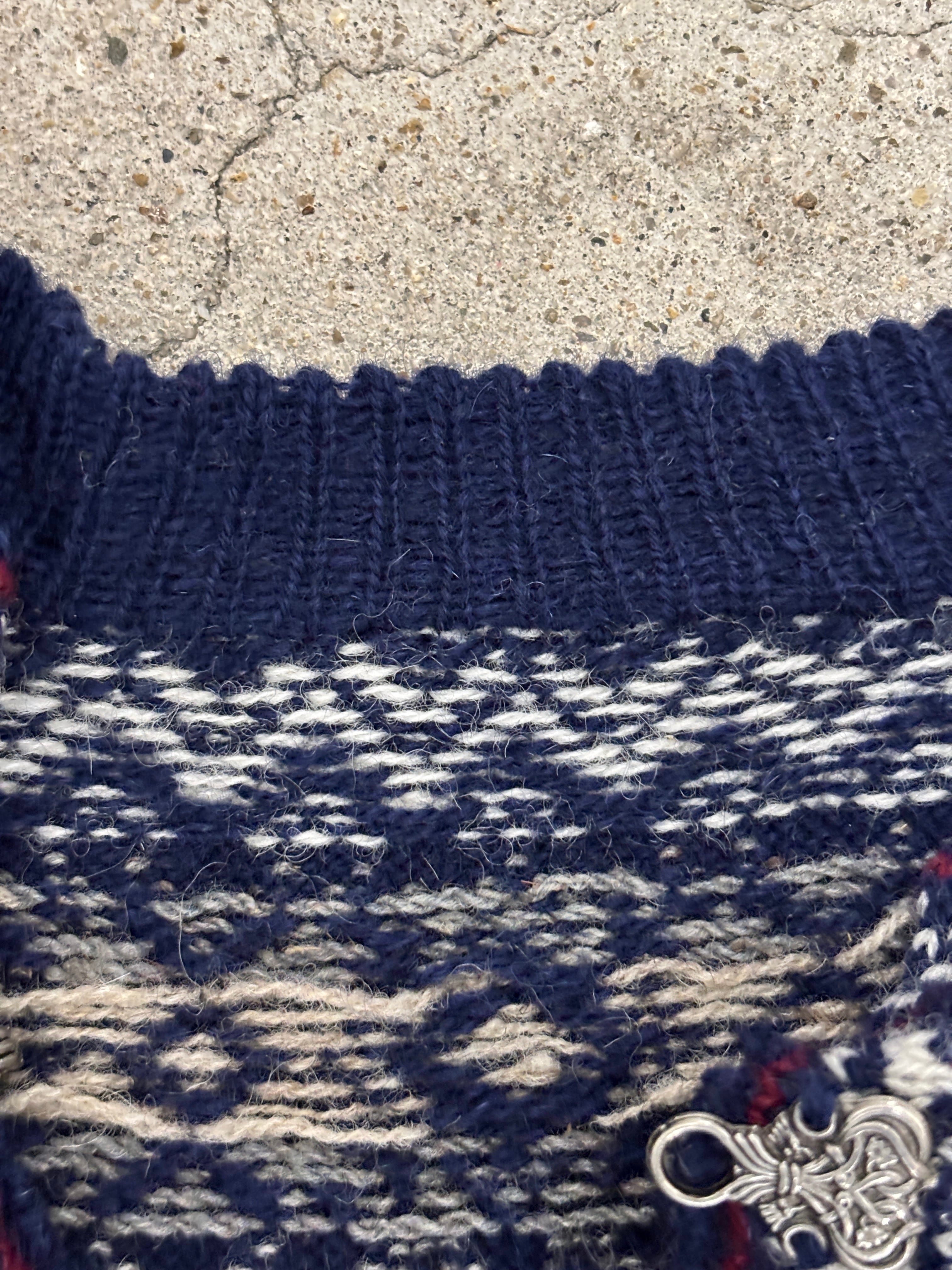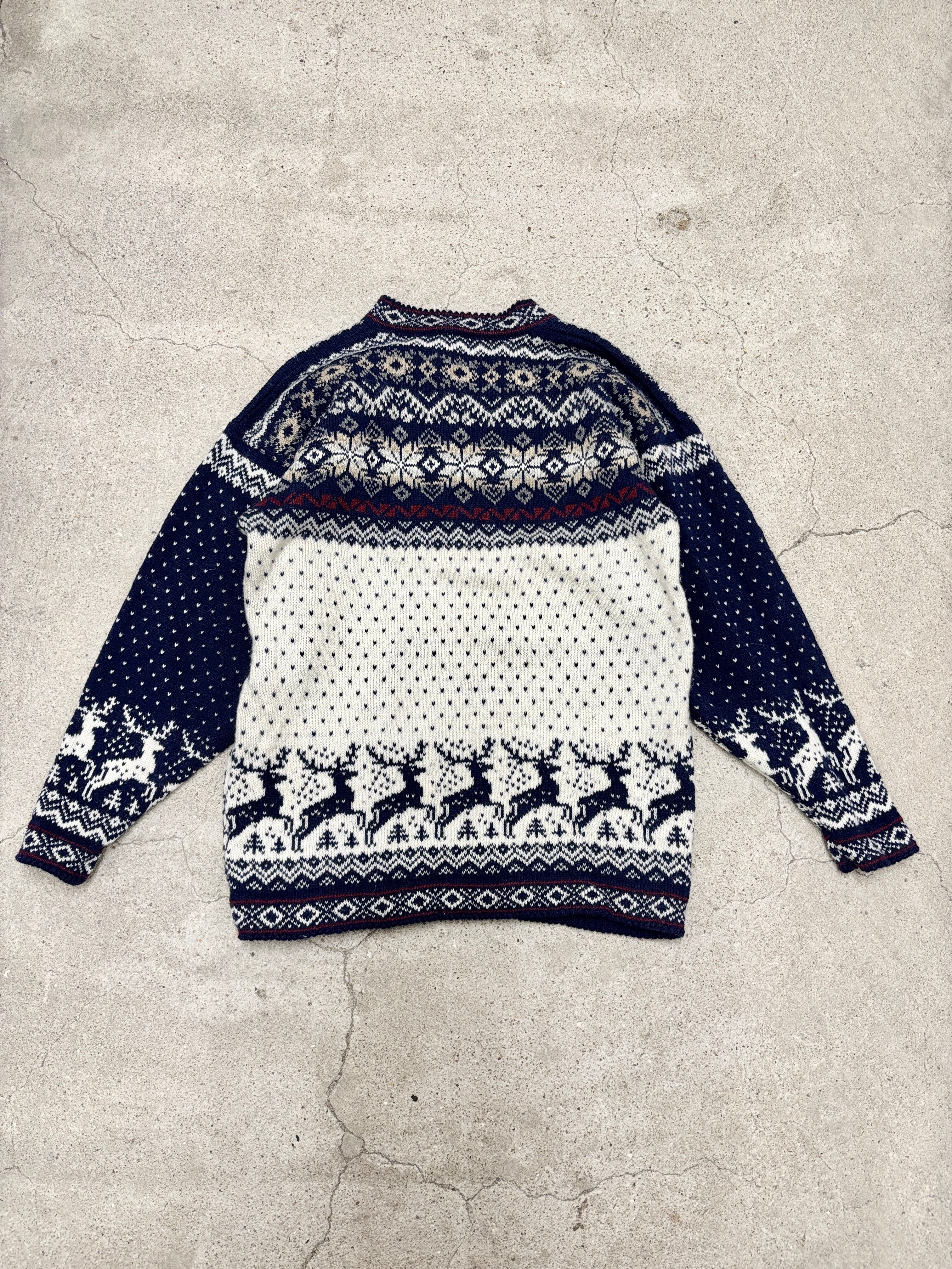 Native design Sweater/S-M相当/ノルディック柄ニットセ-タ-/総柄/メタルフック/ネイティブ/ネイビ-/ホワイト/古着