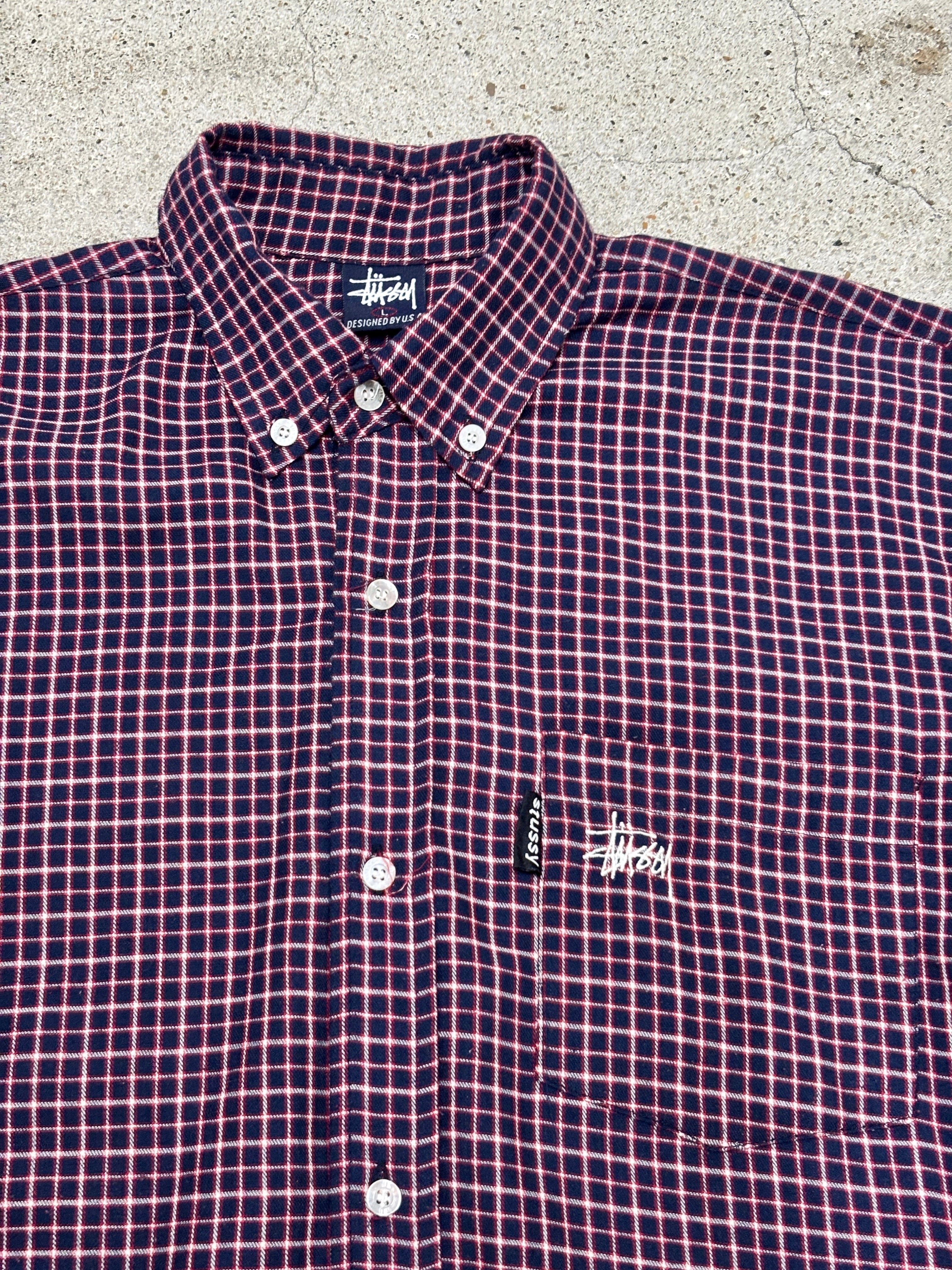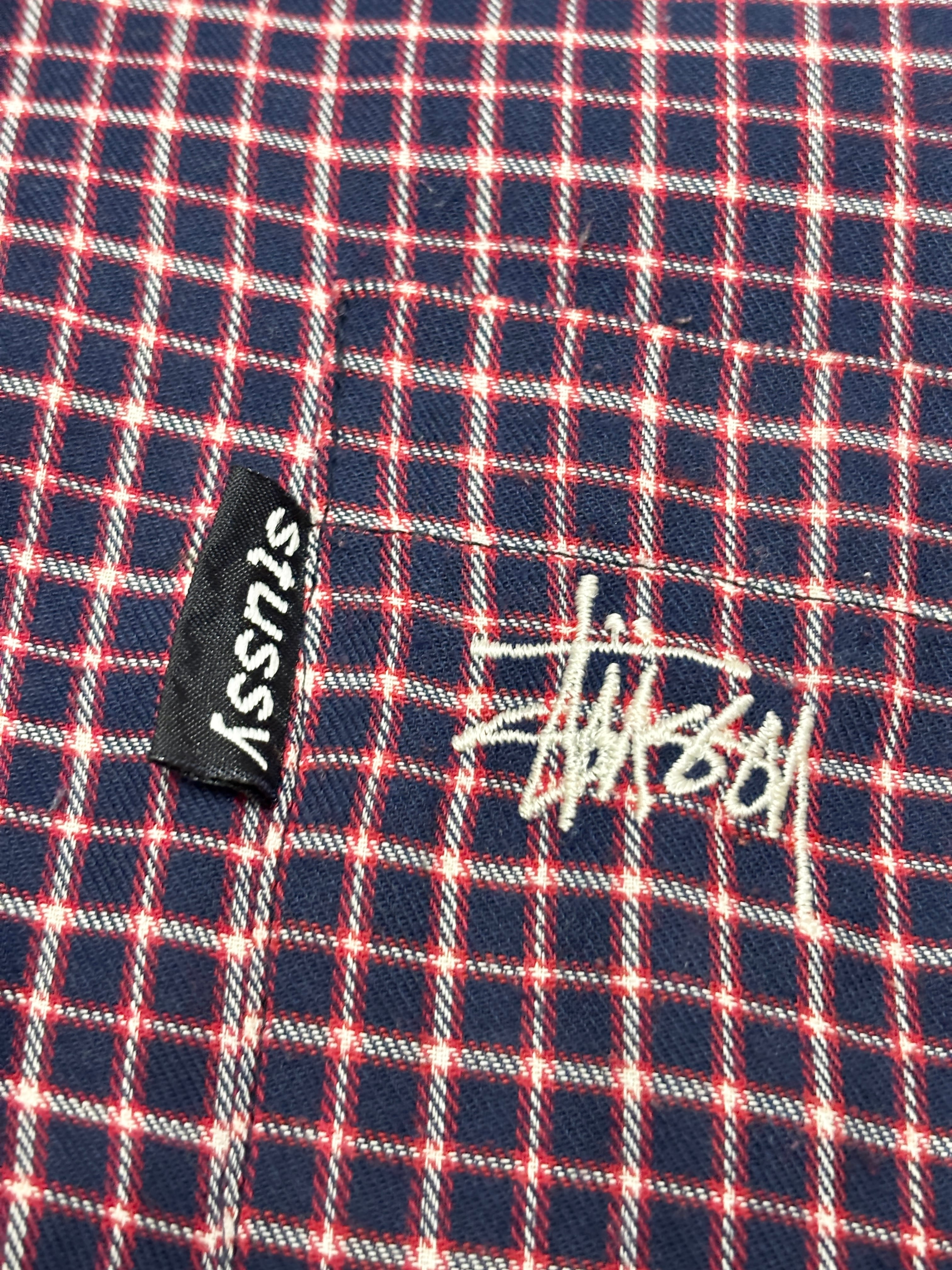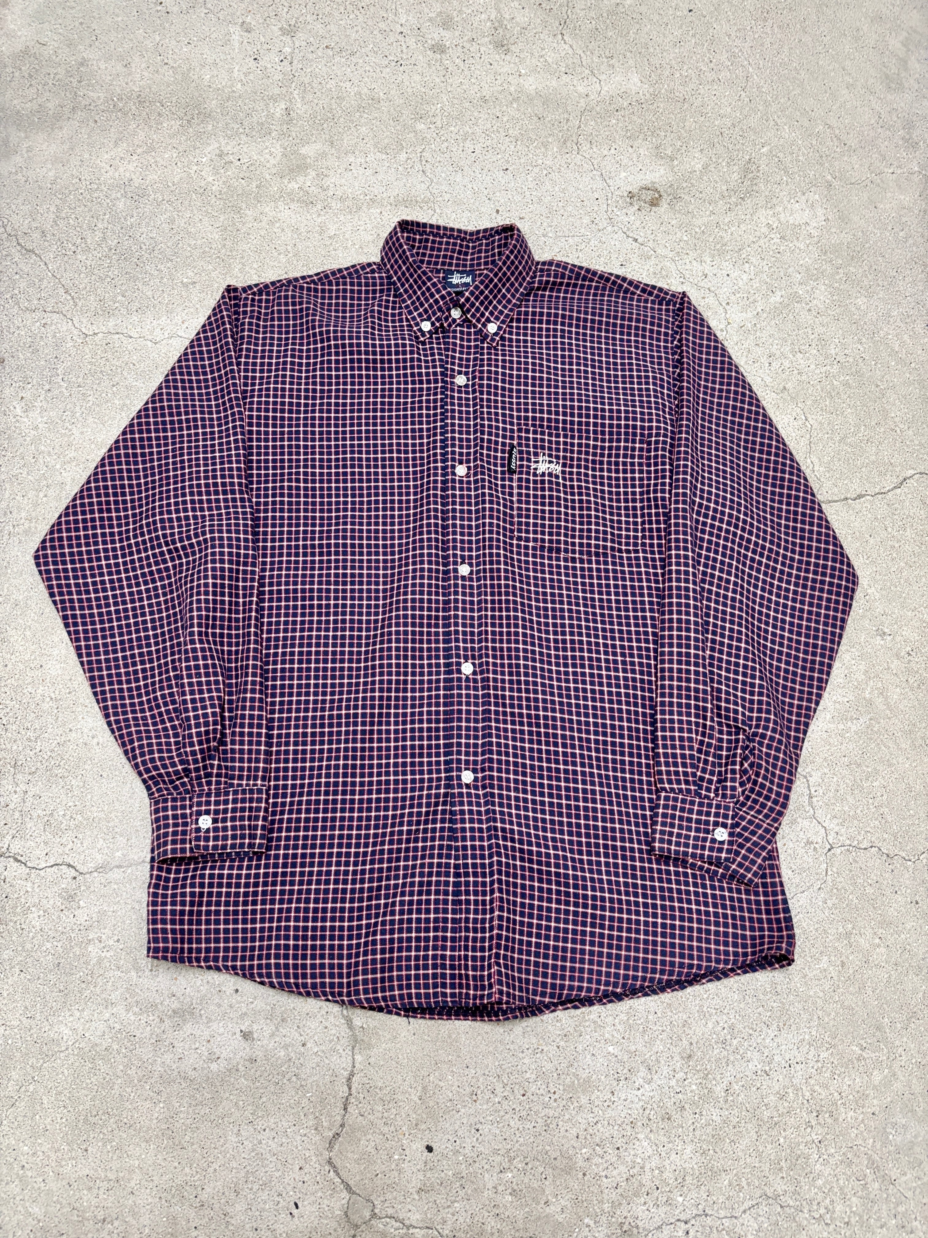 90~00s OLD STUSSY/Check L/S Shirt/Designed by USA/紺タグ/L/チェック柄ボタンダウンシャツ/刺繡ロゴ/ストックロゴ/ネイビ-/レッド/ステューシー/オ-ルドステューシー