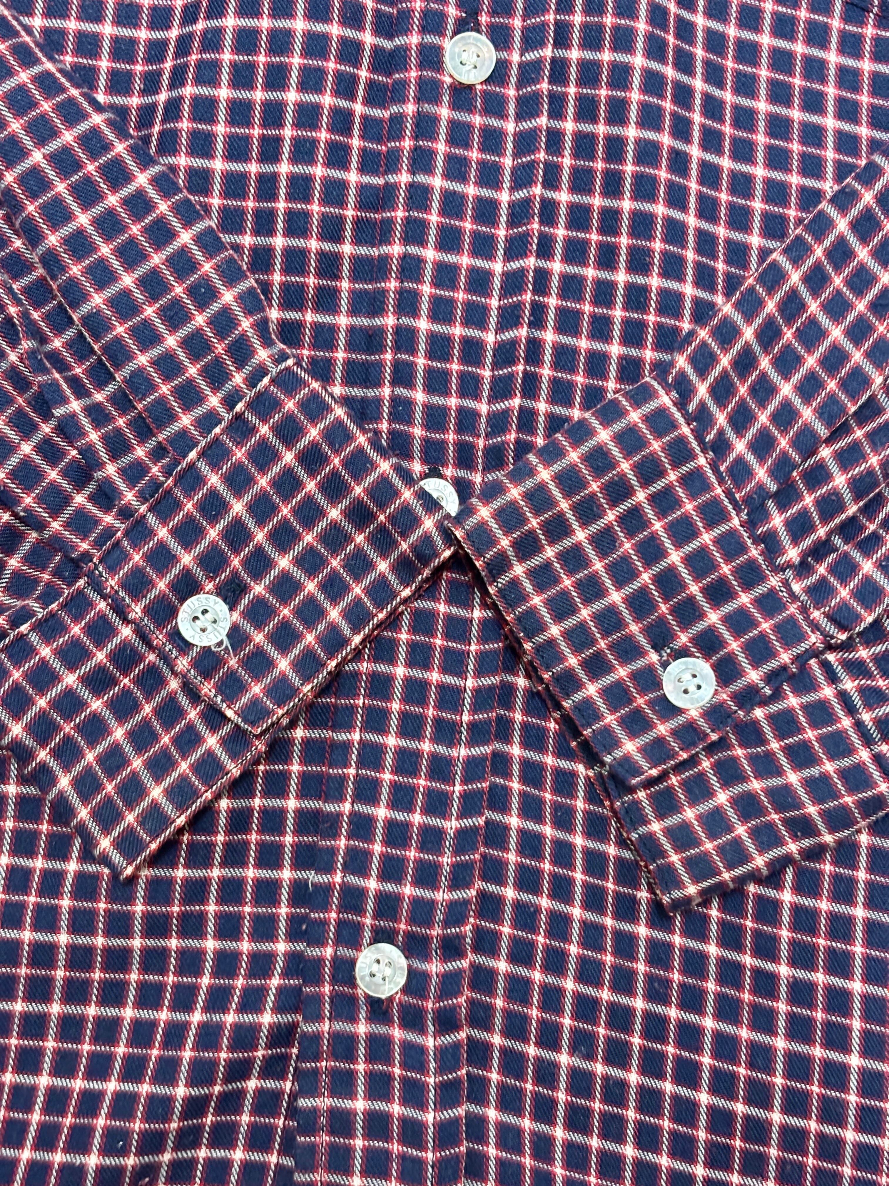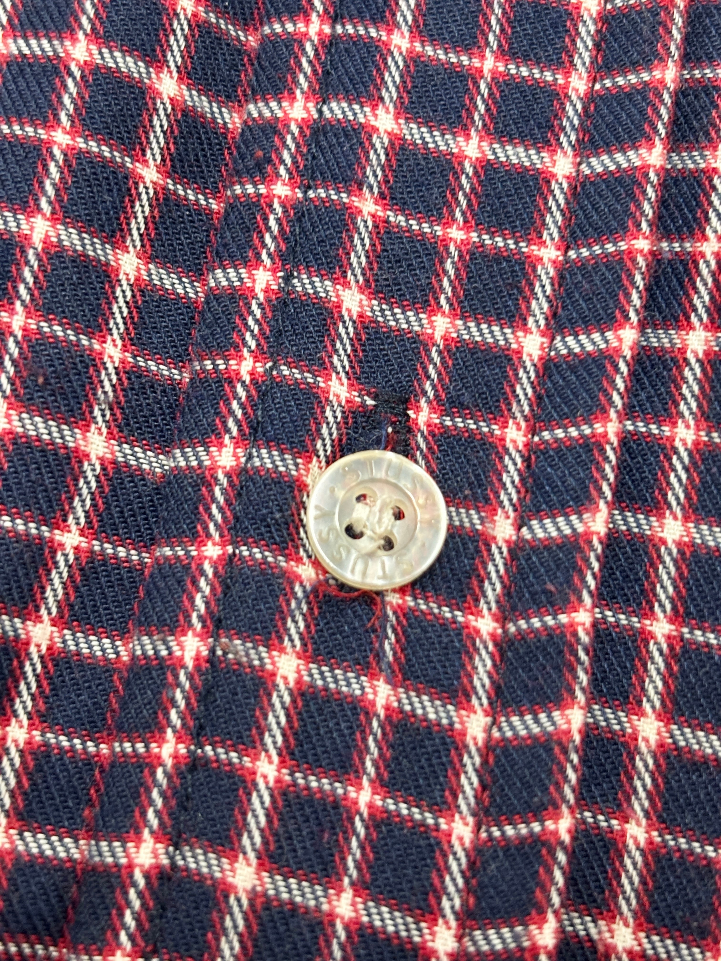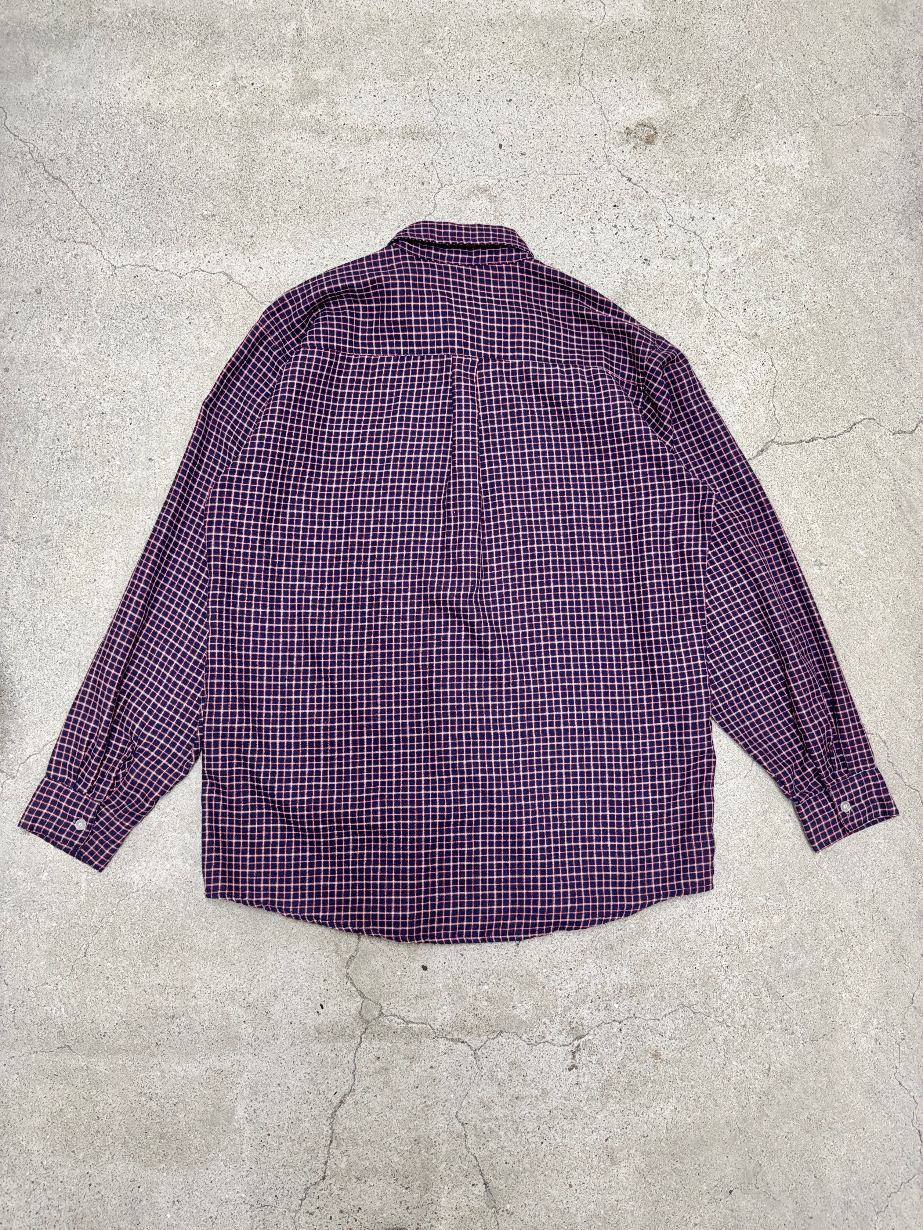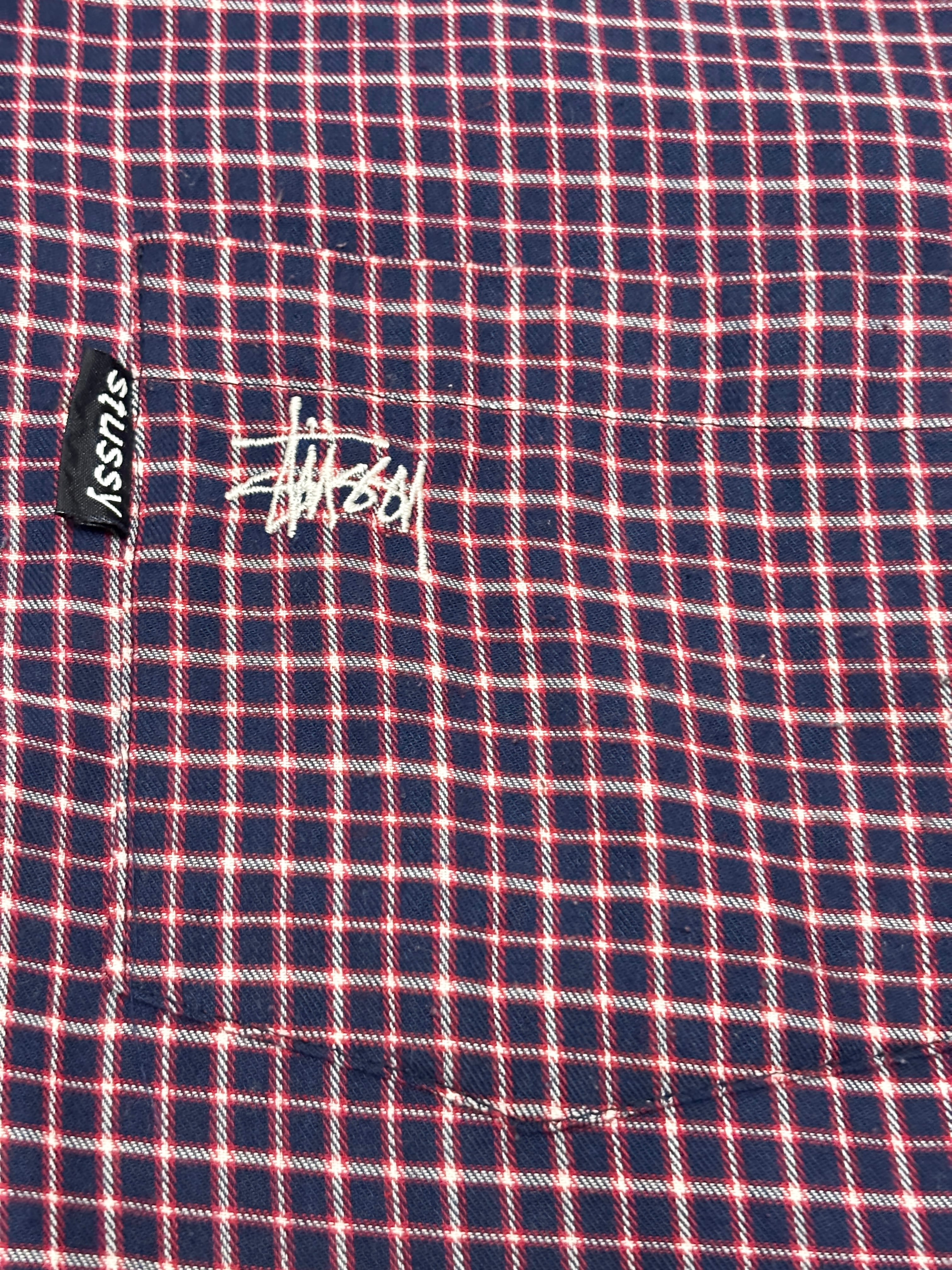 90~00s OLD STUSSY/Check L/S Shirt/Designed by USA/紺タグ/L/チェック柄ボタンダウンシャツ/刺繡ロゴ/ストックロゴ/ネイビ-/レッド/ステューシー/オ-ルドステューシー