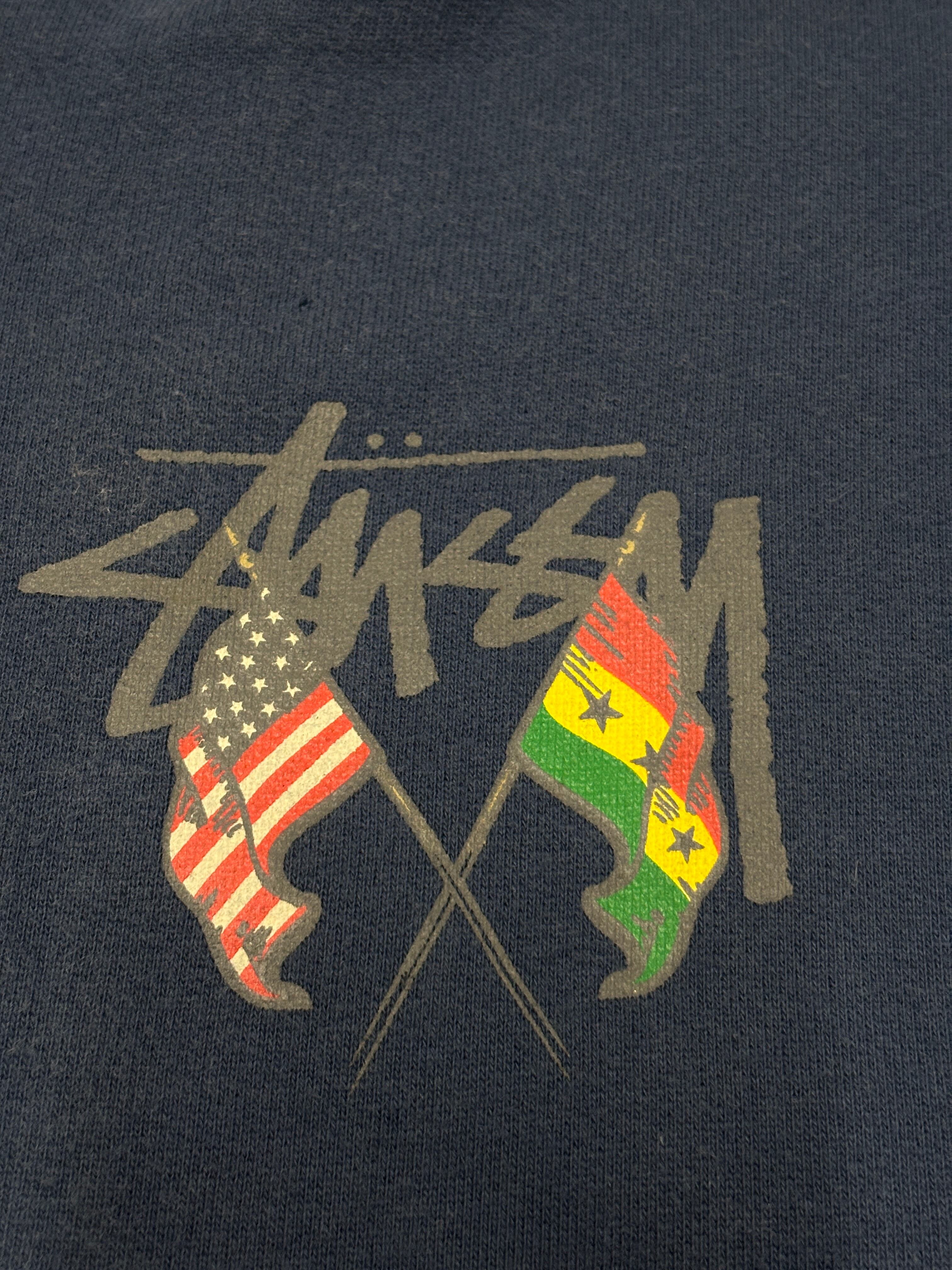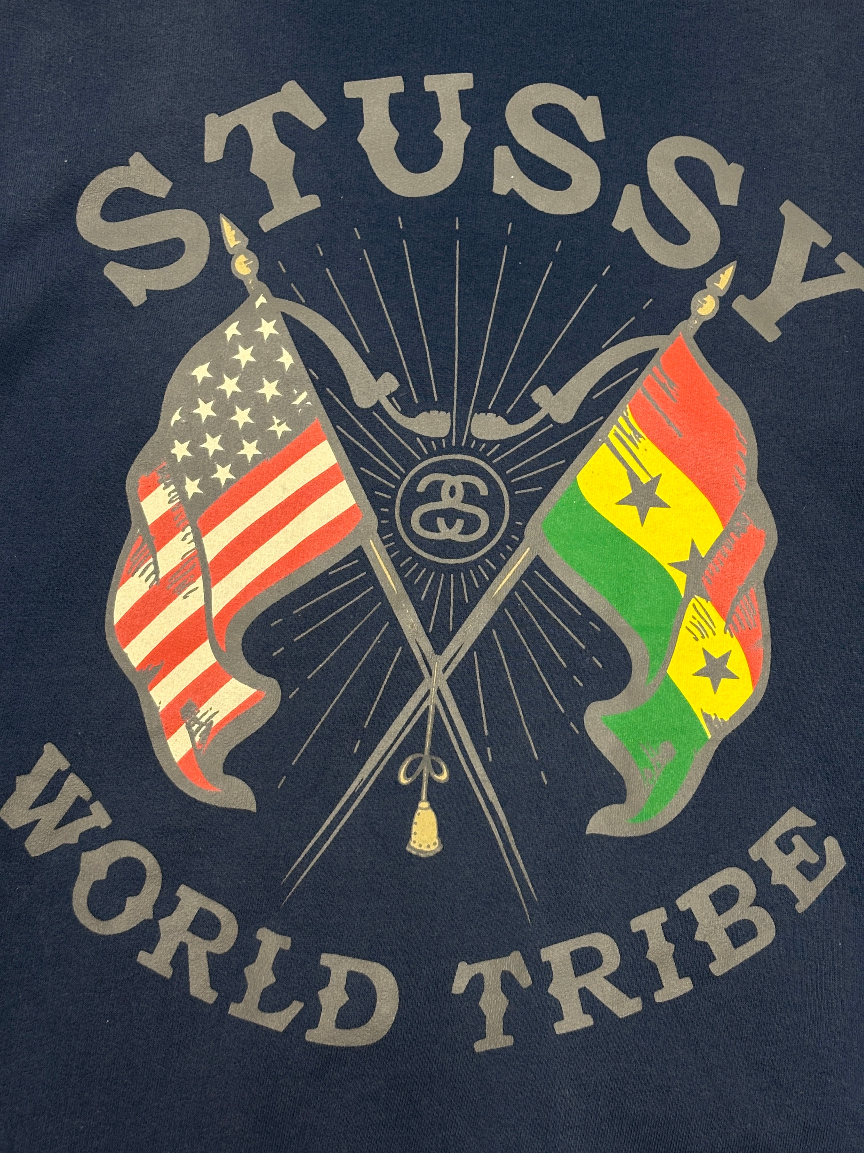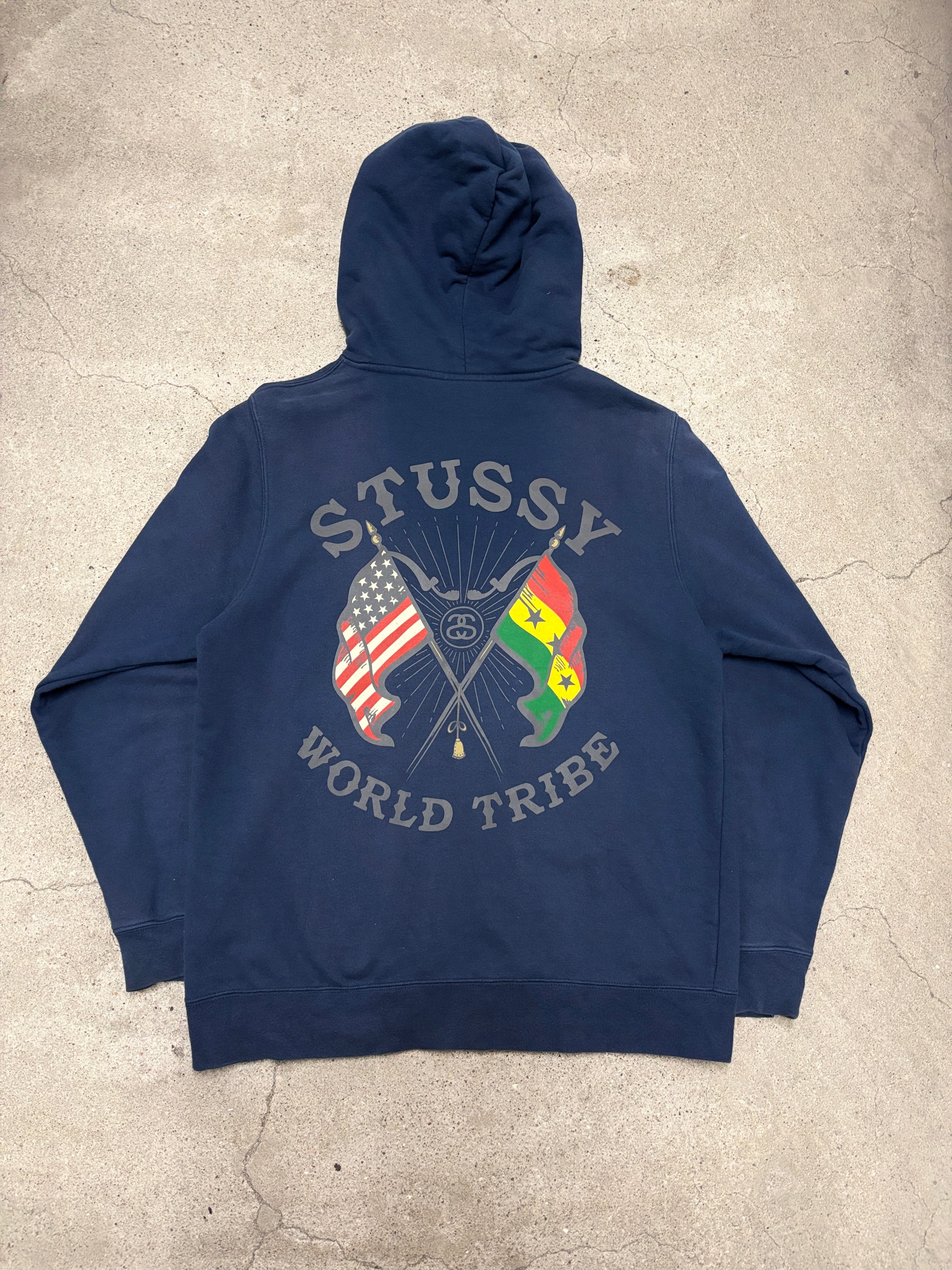 00s OLD STUSSY/WORLD TRIBE print zip Hoodie/M/ロゴプリントジップフ-ディ-/パ-カ-/国旗/アメリカ/ガ-ナ-/ネイビ-/ステューシー/オ-ルドステューシー/古着/ア―カイブ