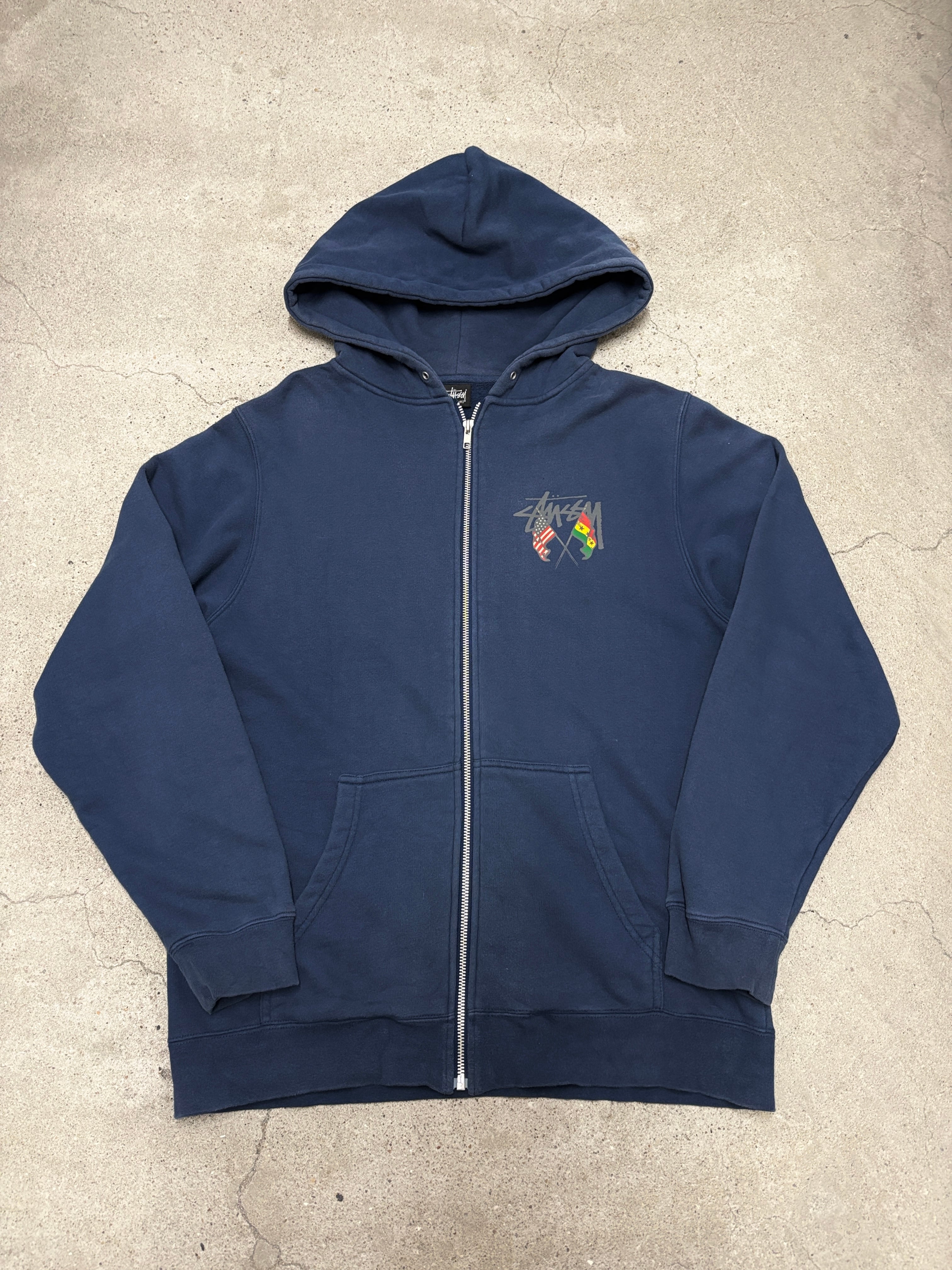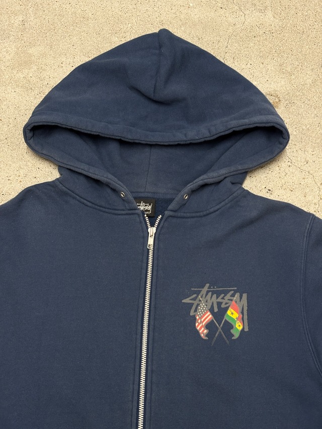 00s OLD STUSSY/WORLD TRIBE print zip Hoodie/M/ロゴプリントジップフ-ディ-/パ-カ-/国旗/アメリカ/ガ-ナ-/ネイビ-/ステューシー/オ-ルドステューシー