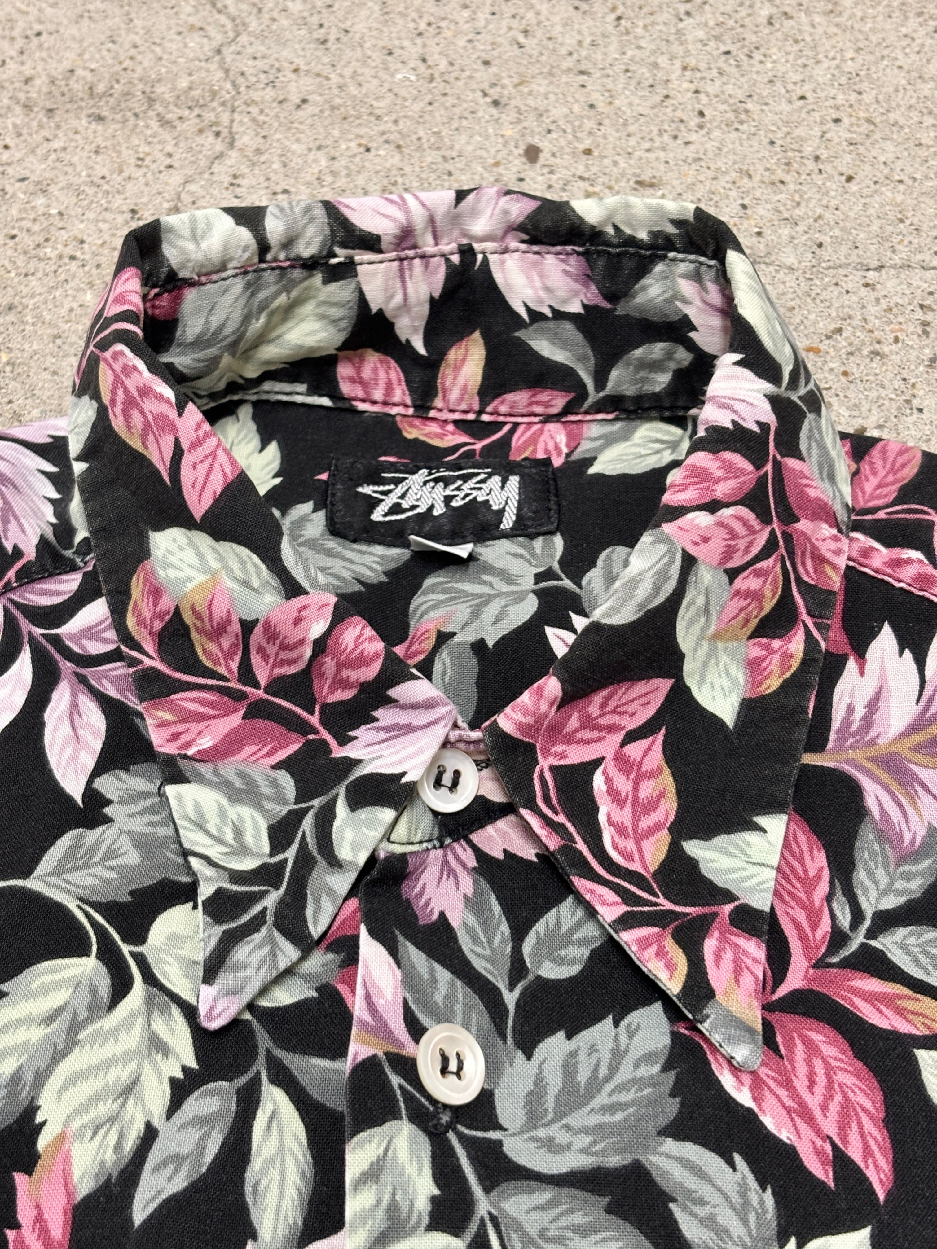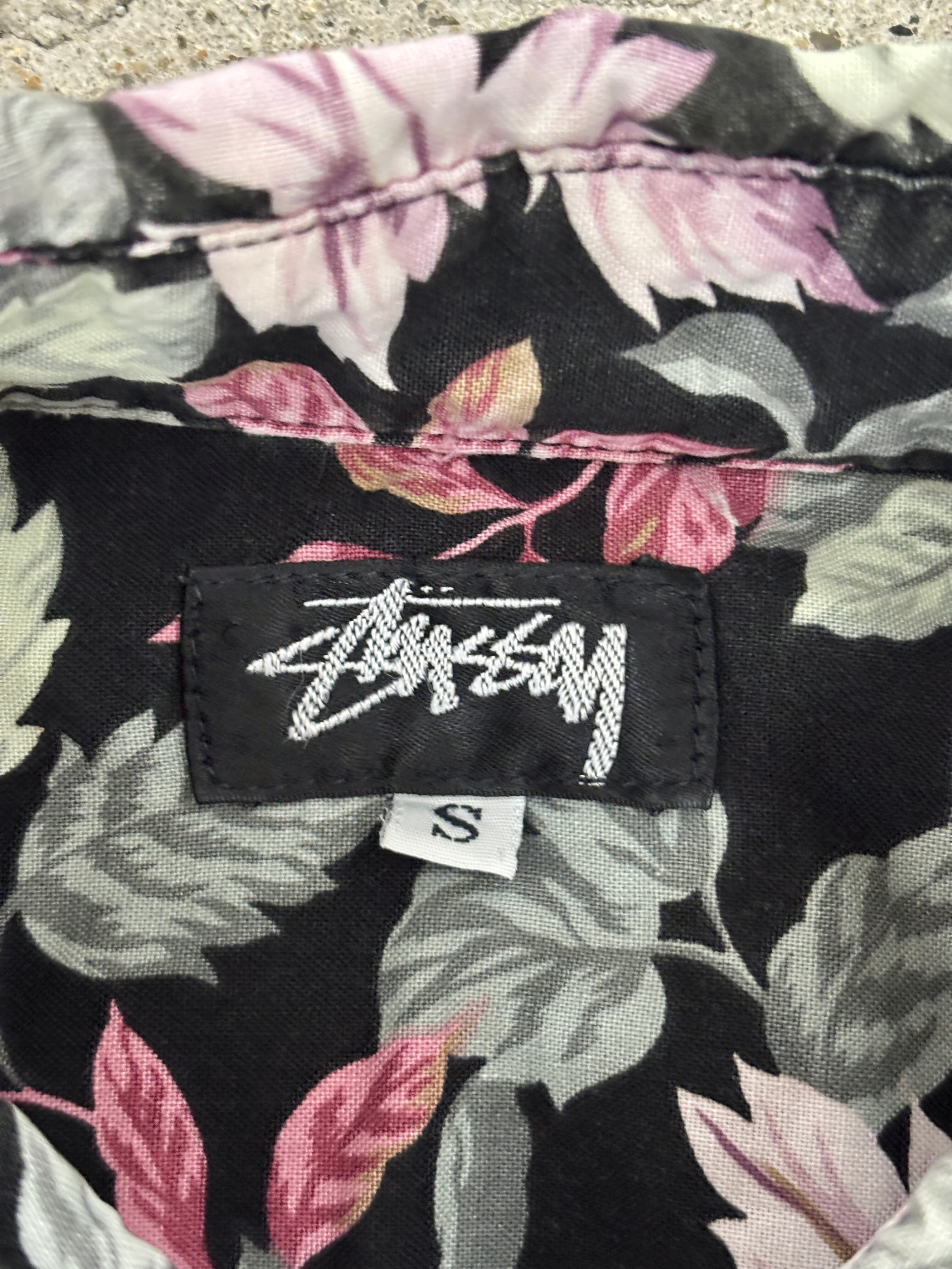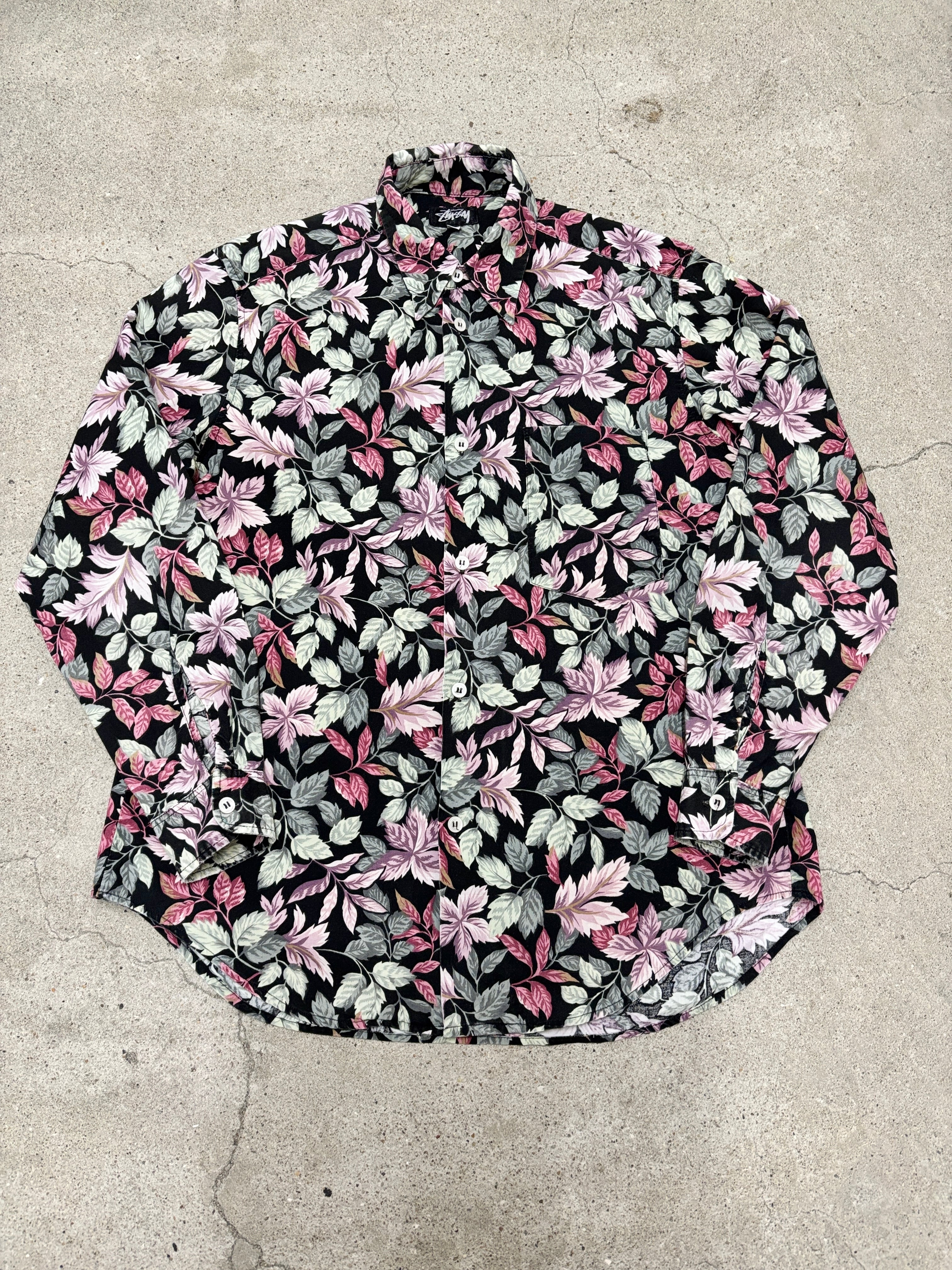 80s OLD STUSSY/Leaf print L/S Shirt/USA製/黒タグ/S (実寸M相当)/葉プリントシャツ/総柄/ブラック/長袖シャツ/ステューシー/オ-ルドステューシー
