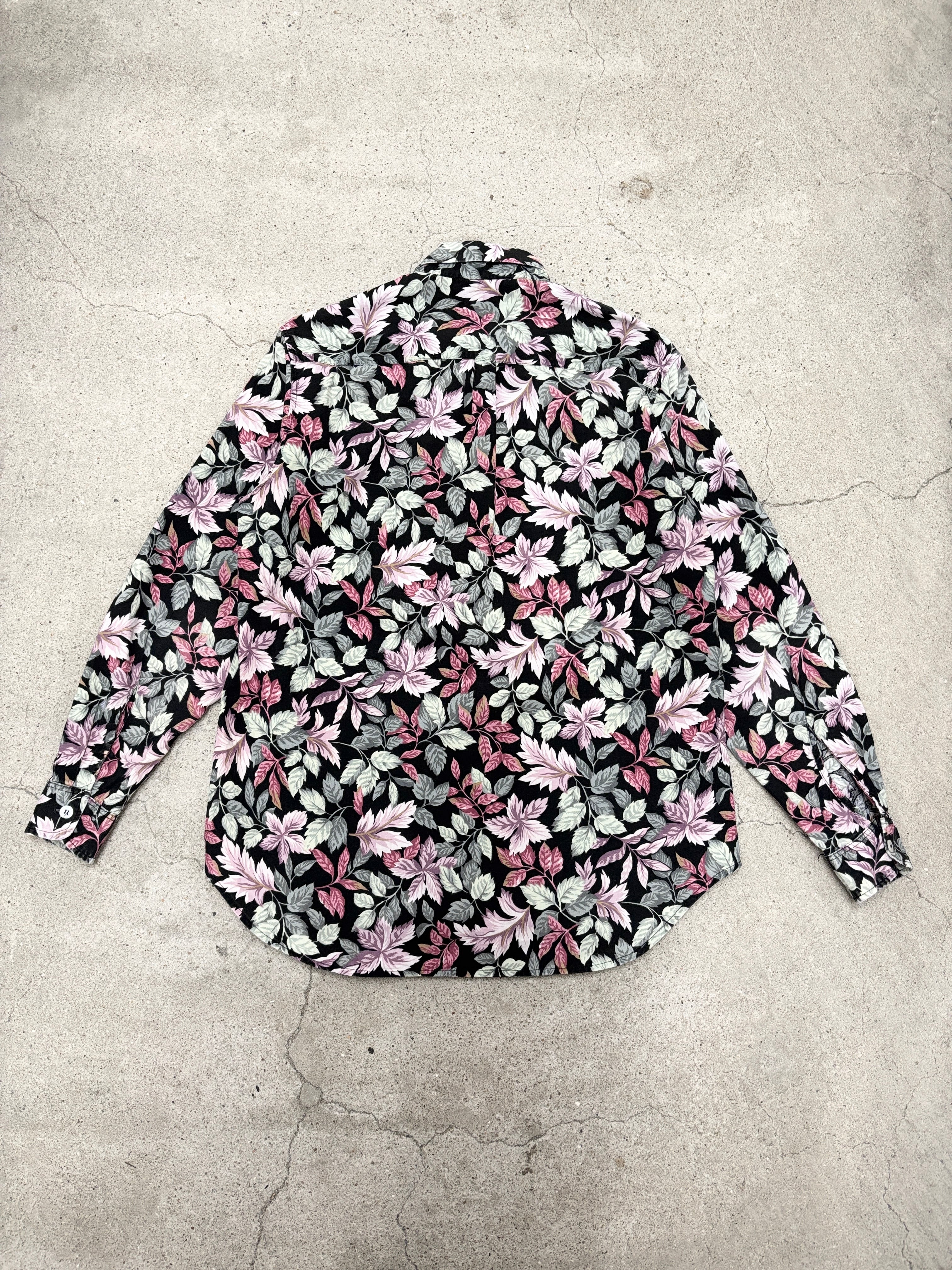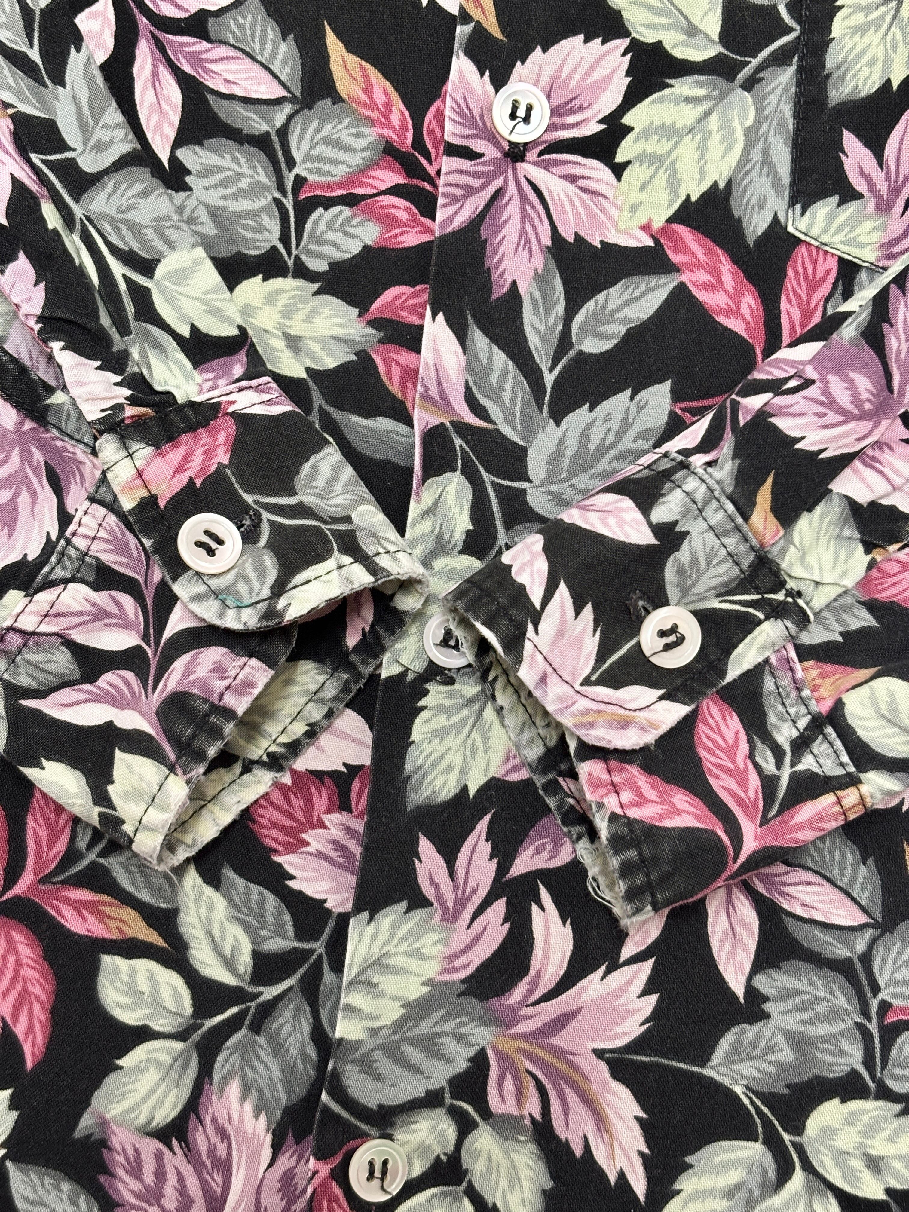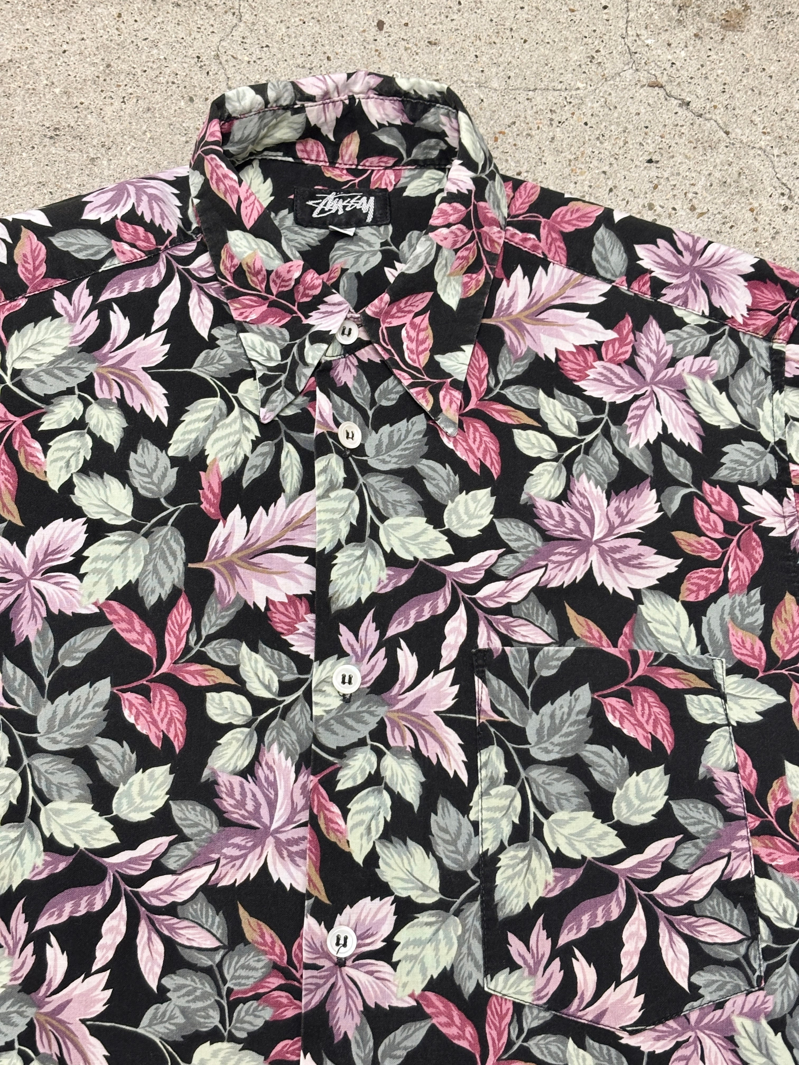 80s OLD STUSSY/Leaf print L/S Shirt/USA製/黒タグ/S (実寸M相当)/葉プリントシャツ/総柄/ブラック/長袖シャツ/ステューシー/オ-ルドステューシー