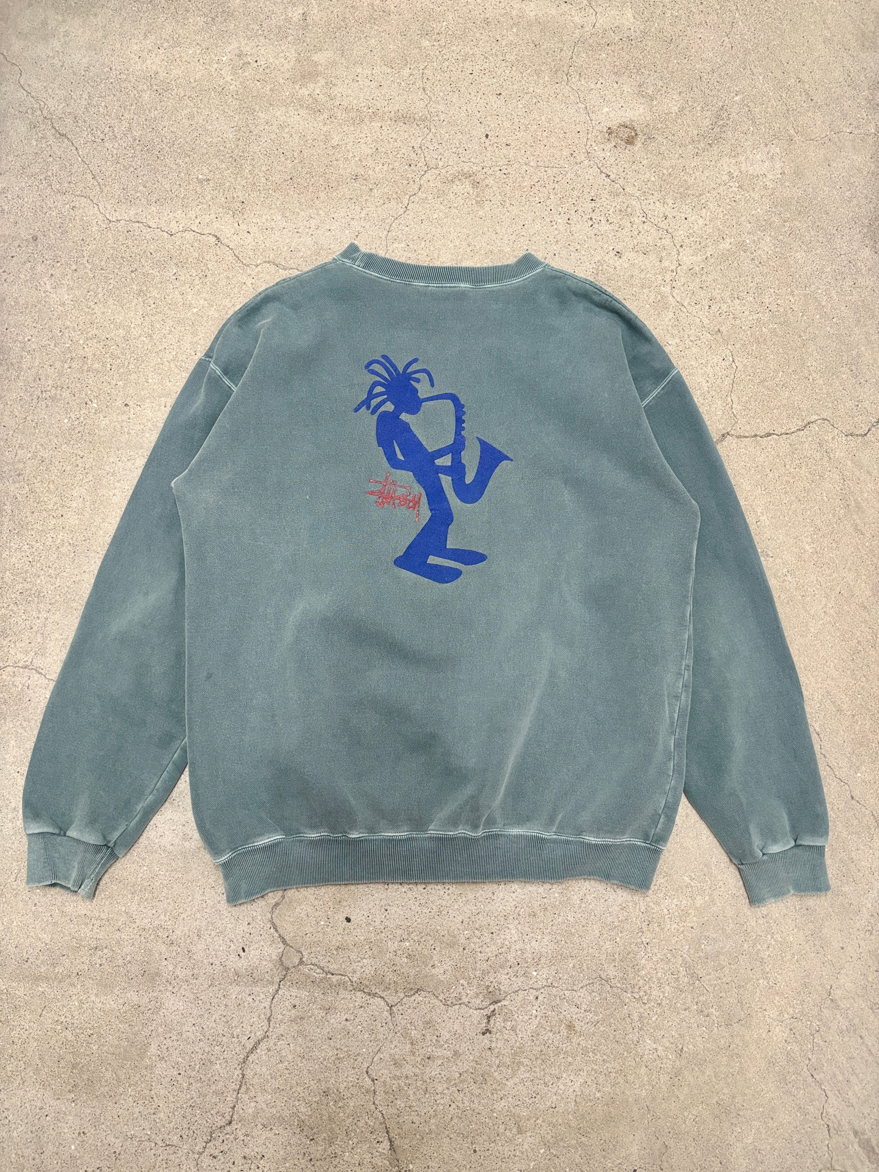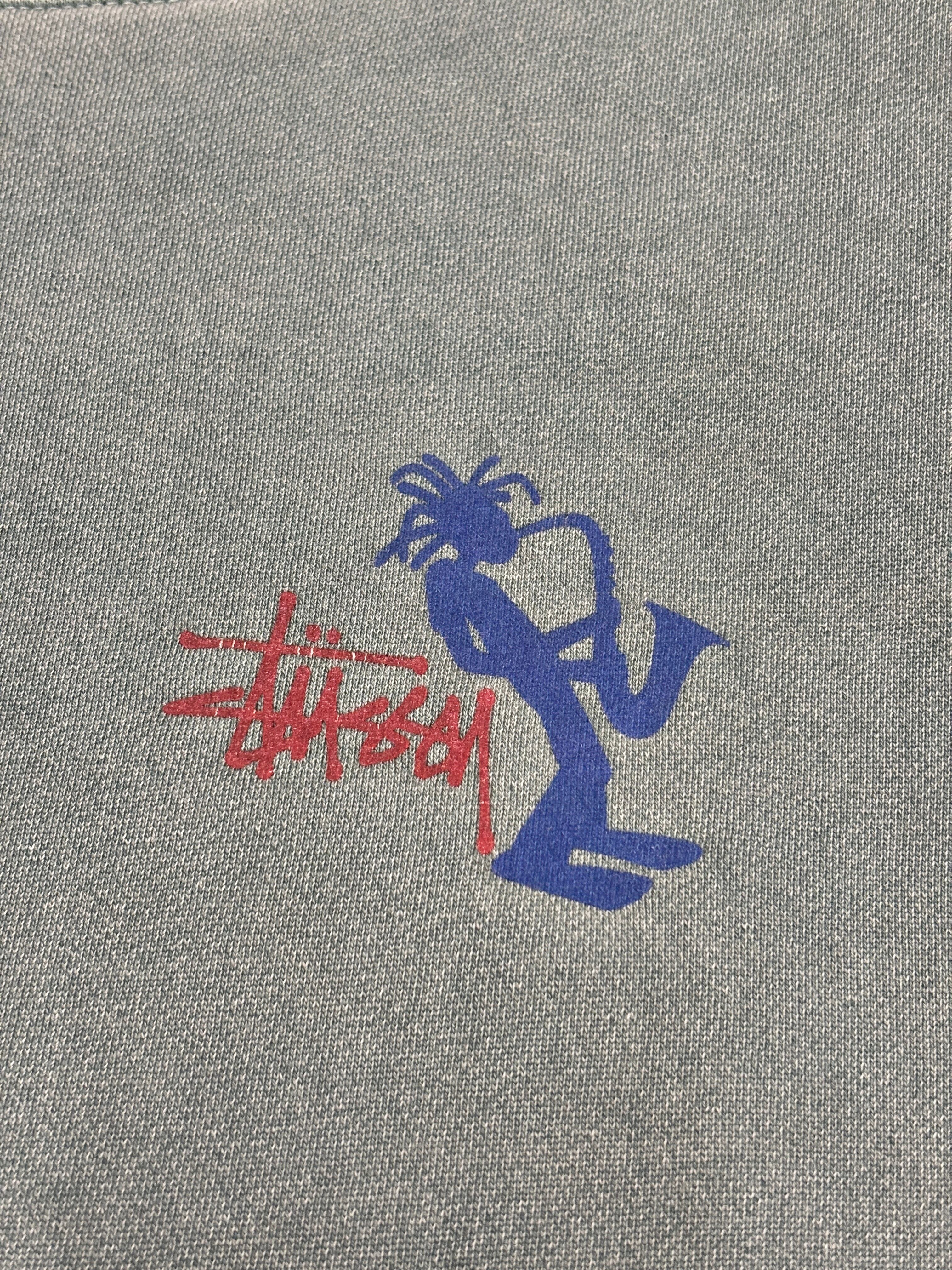 90s OLD STUSSY/Jazz Shadowman print Sweat/USA製/白タグ/L/ジャズシャド-マンプリントスウェット/ロゴプリント/ストックロゴ/グリ-ン/グレ-/ステューシー/オ-ルドステューシー/古着/ア-カイブ
