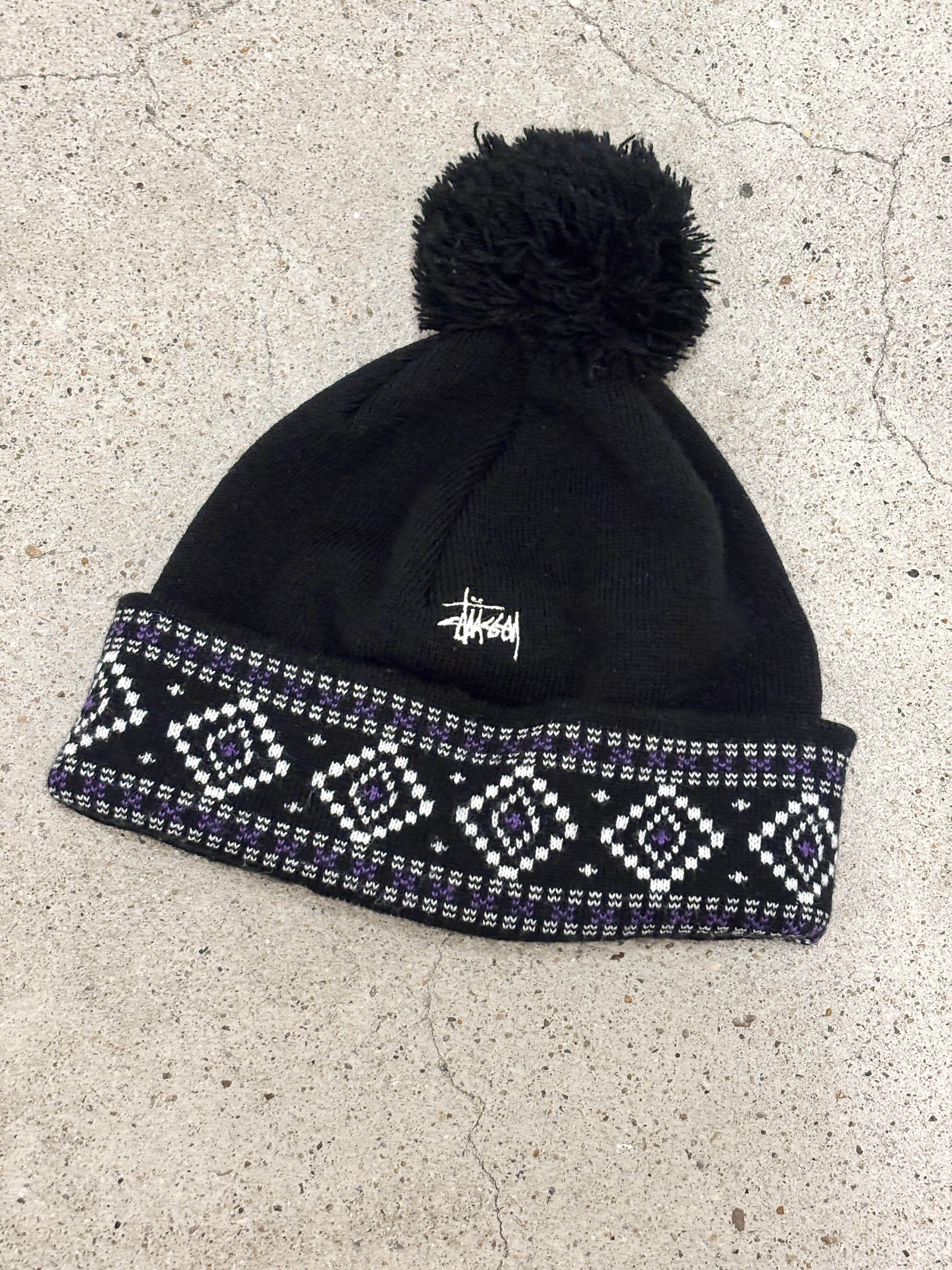 00s STUSSY/Bon Bon Beanie/Free/ビ-ニ-/ボンボンニット帽/刺繍ロゴ/ストックロゴ/ブラック/ステューシー