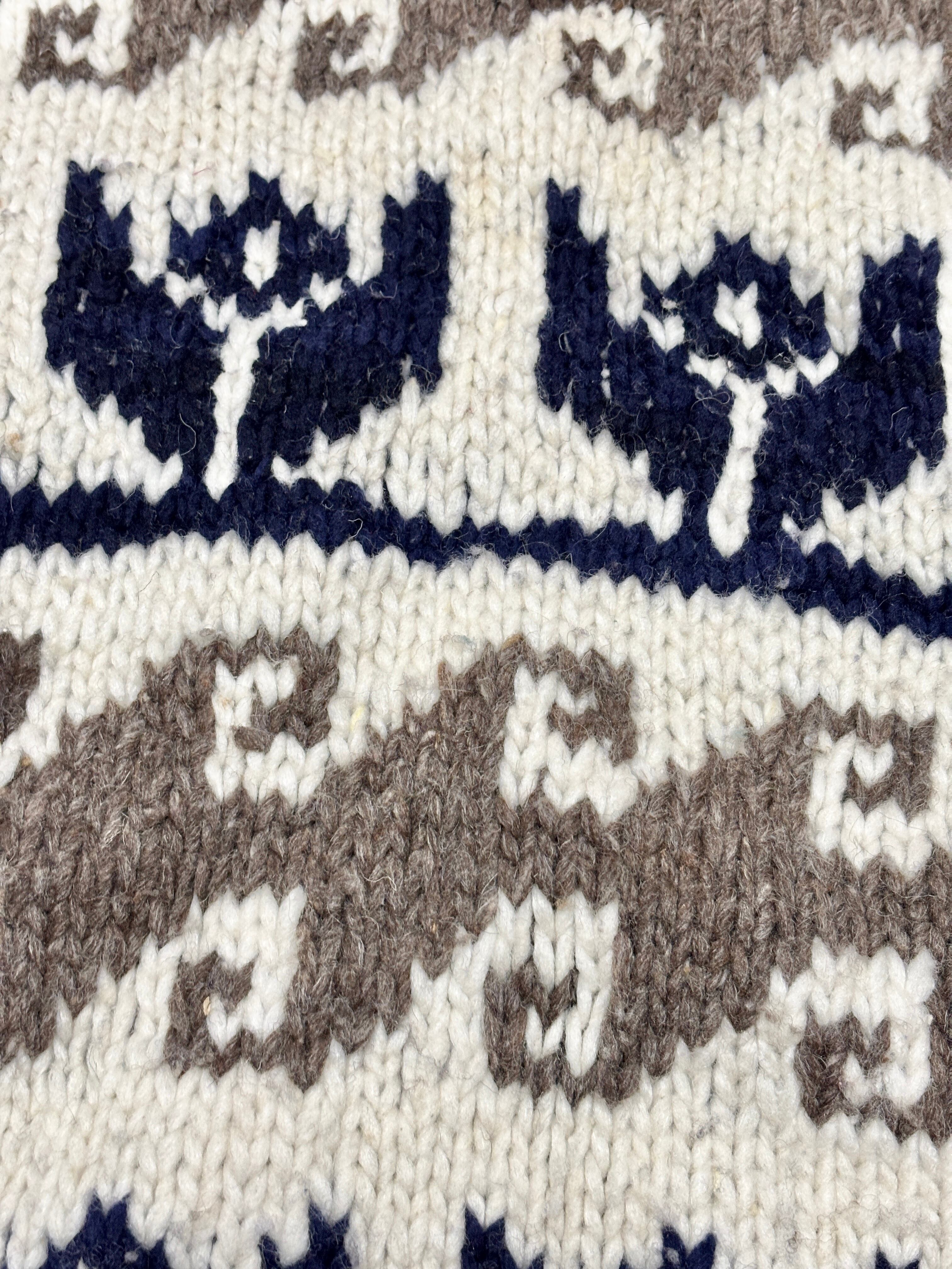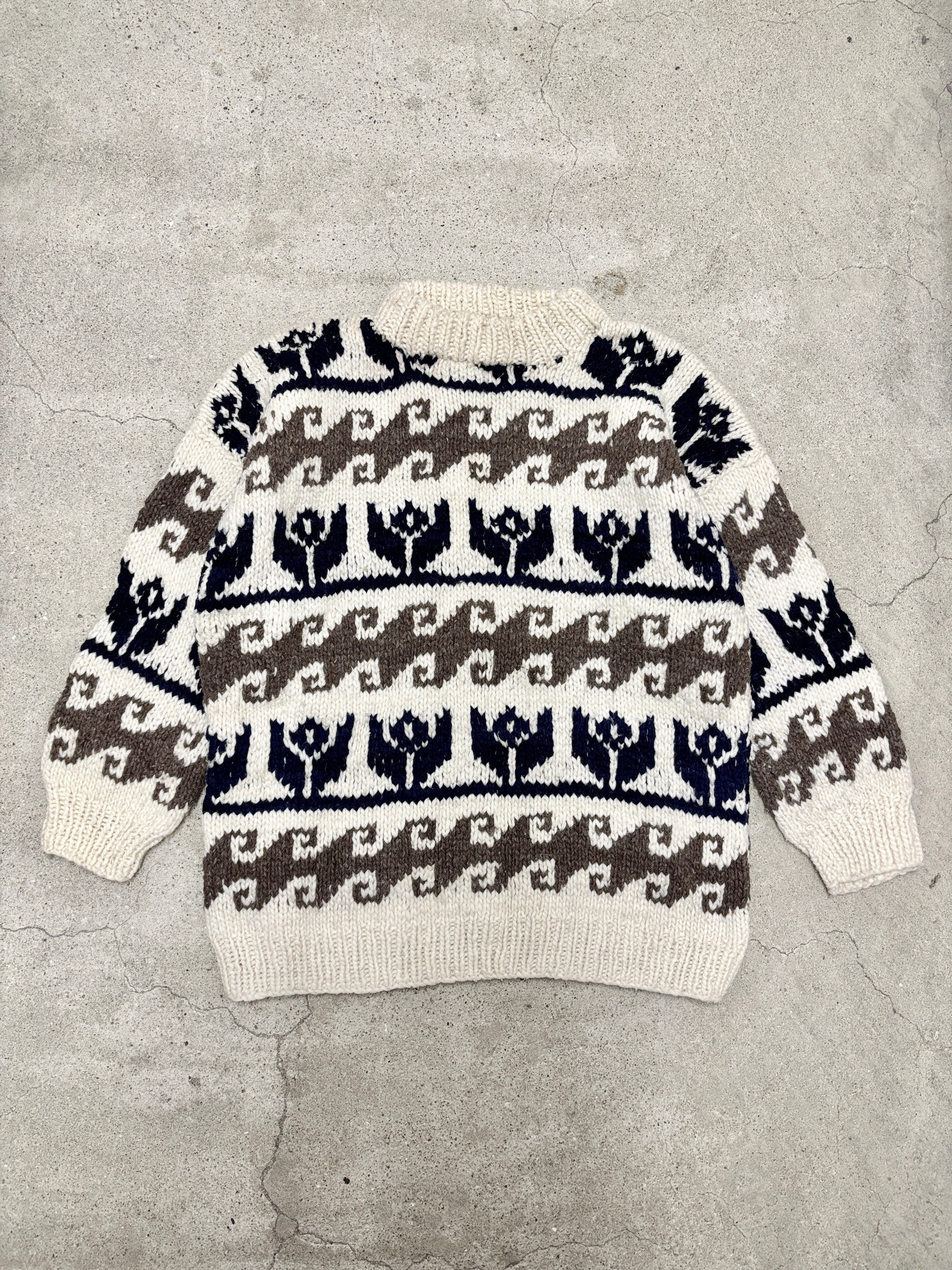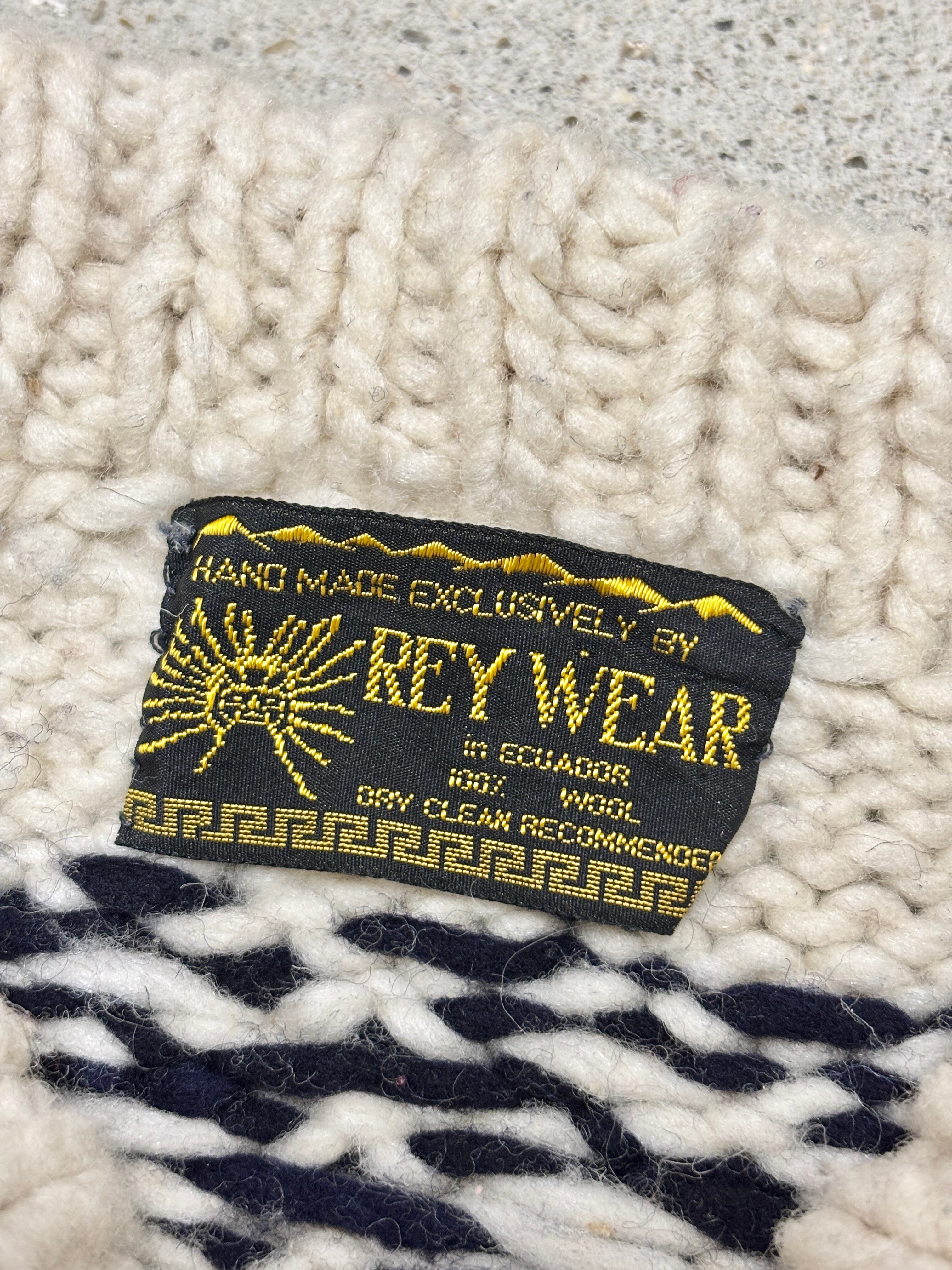 REY WEAR/Ecuador Knit Sweater/L-XL相当/エクアドルニット/セ-タ-/ウェ-ブ柄/ネイティブ柄/ホワイト/ネイビ-/レイウェア/ハンドメイド/古着