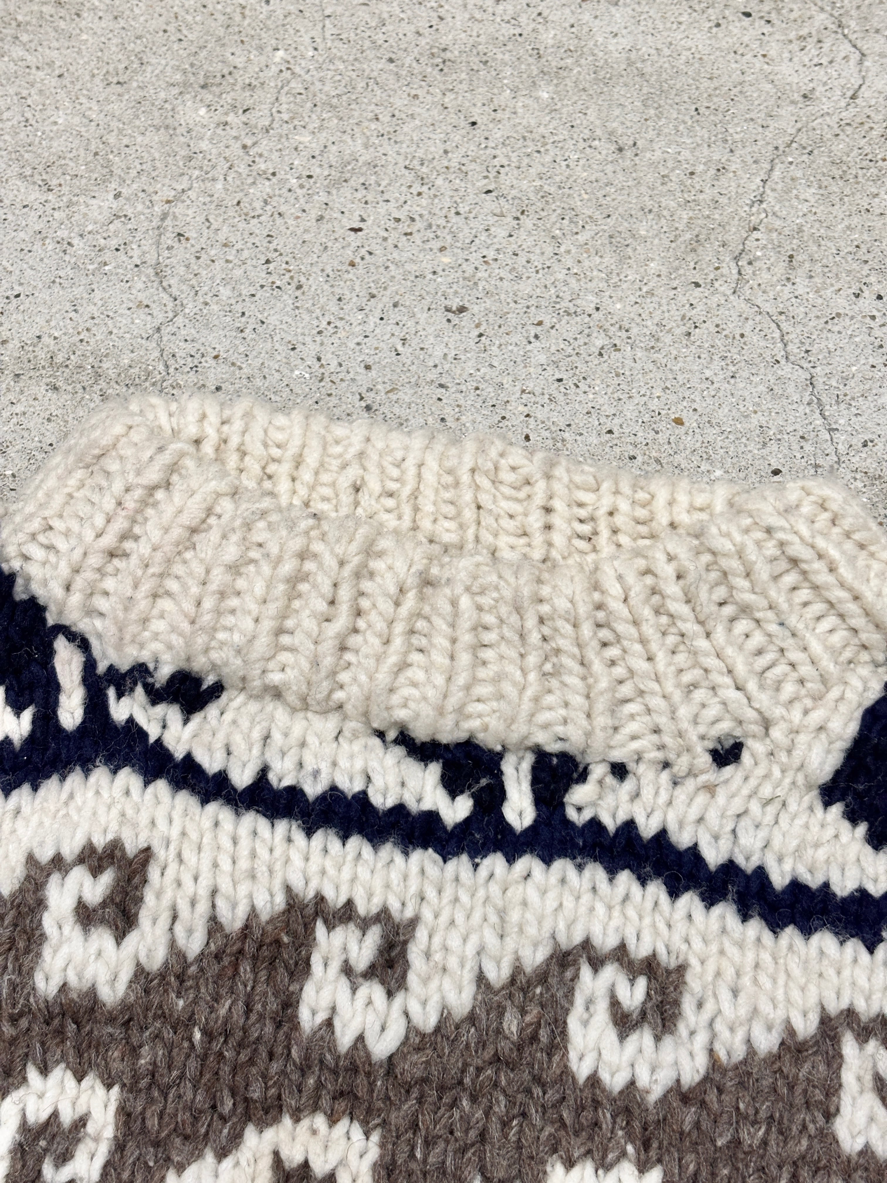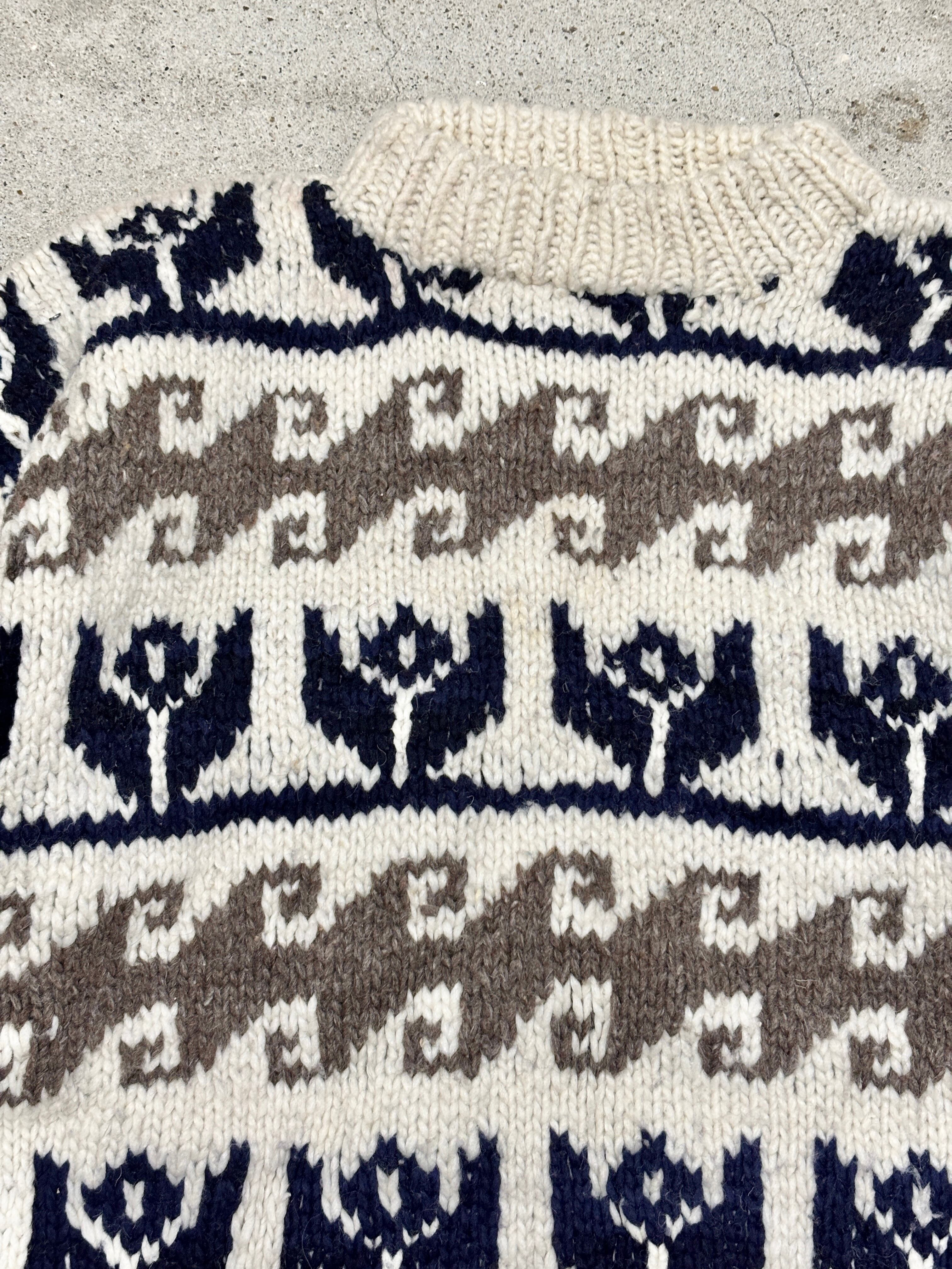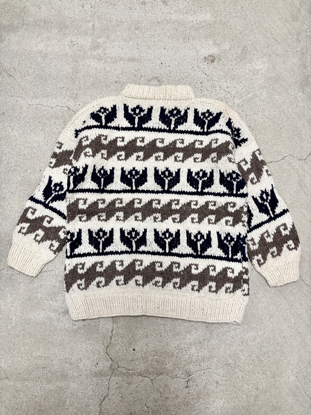 REY WEAR/Ecuador Knit Sweater/L-XL相当/エクアドルニット/セ-タ-/ウェ-ブ柄/ネイティブ柄/ホワイト/ネイビ-/レイウェア/ハンドメイド/古着
