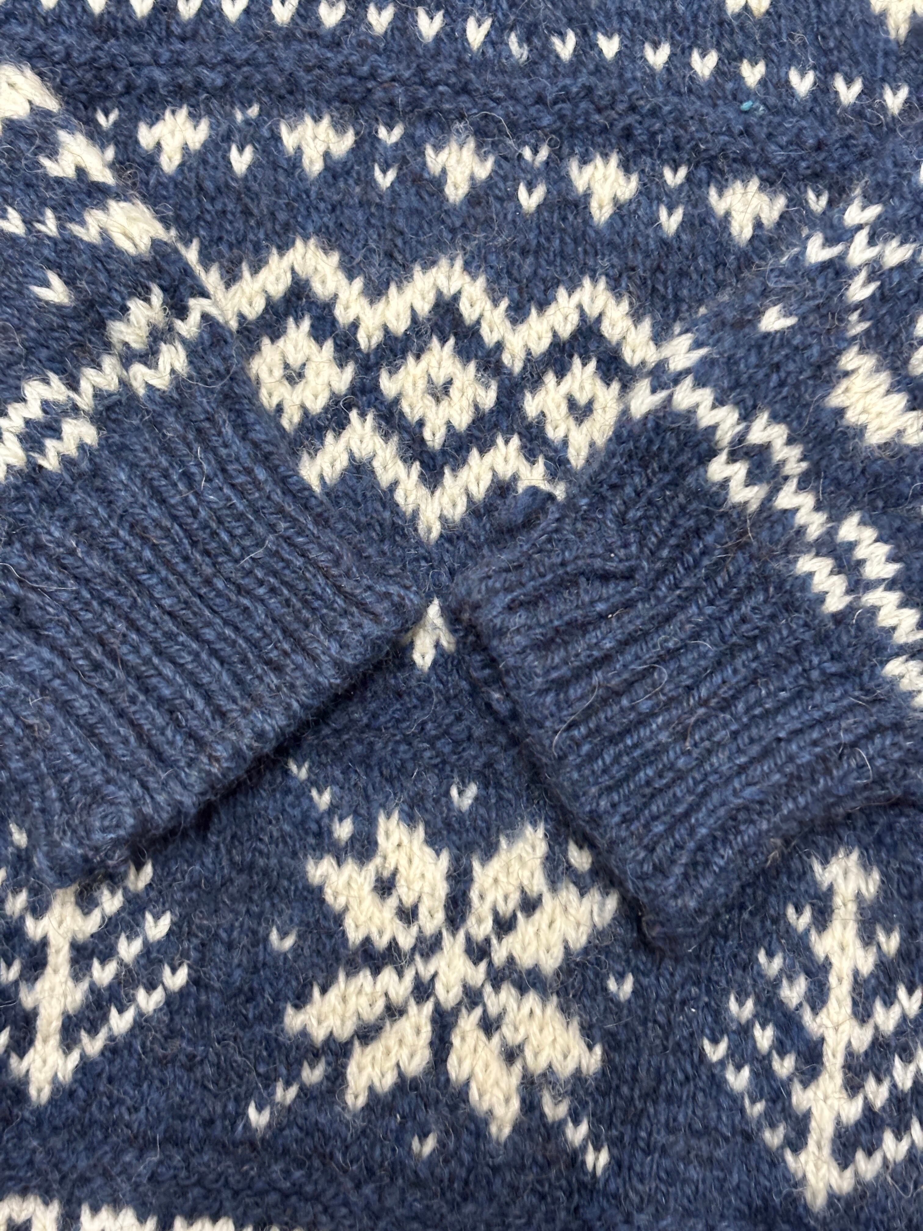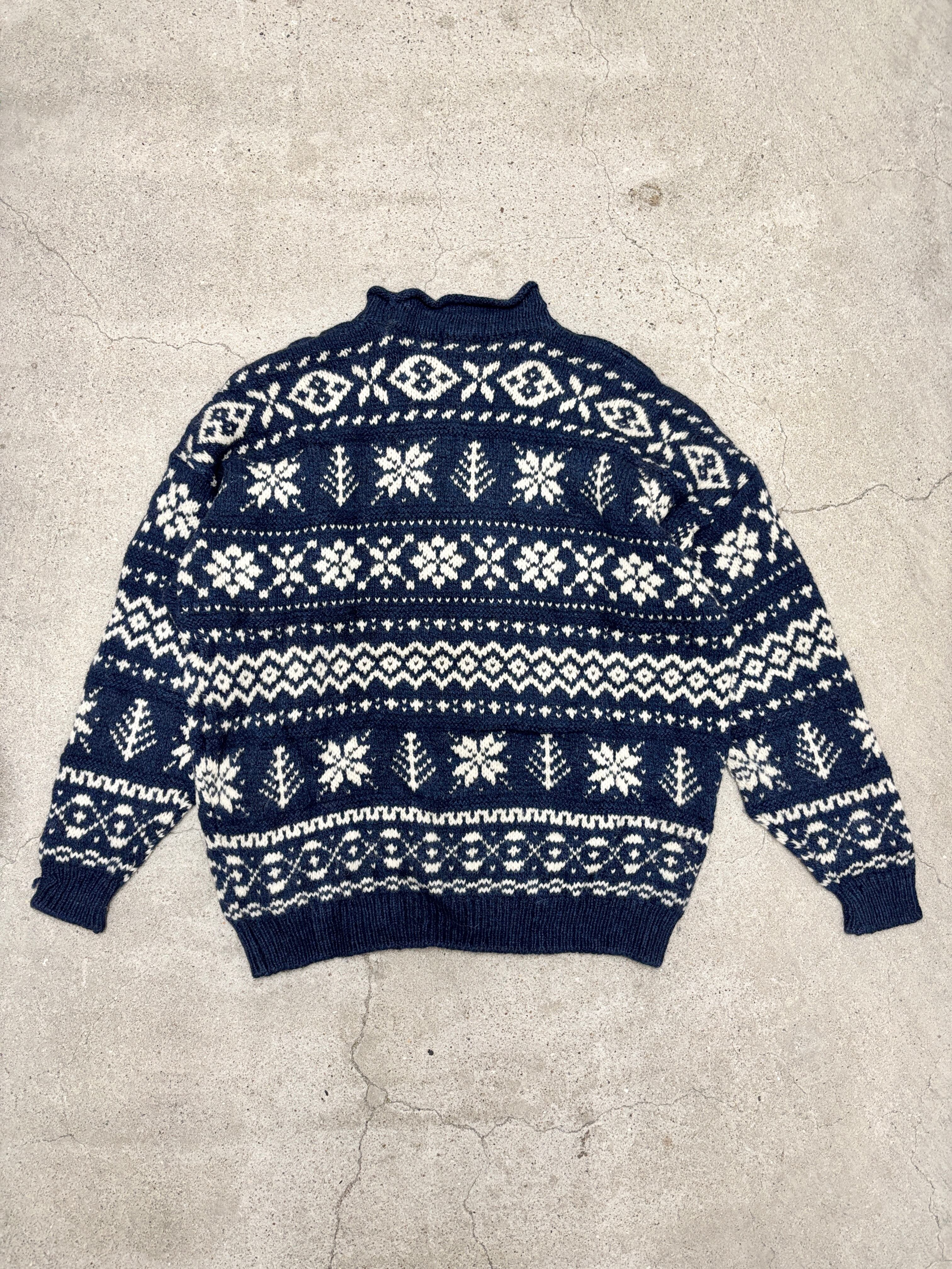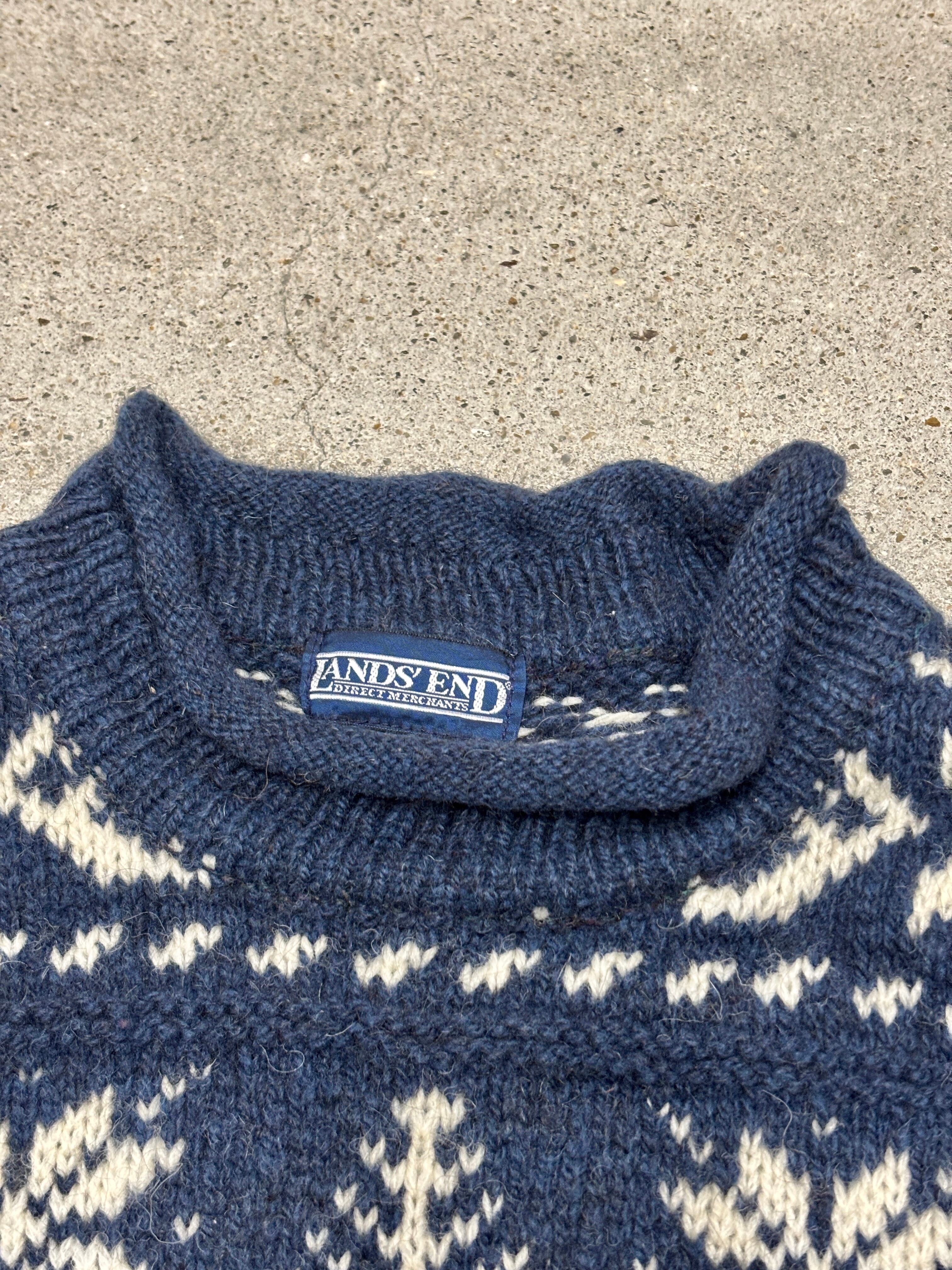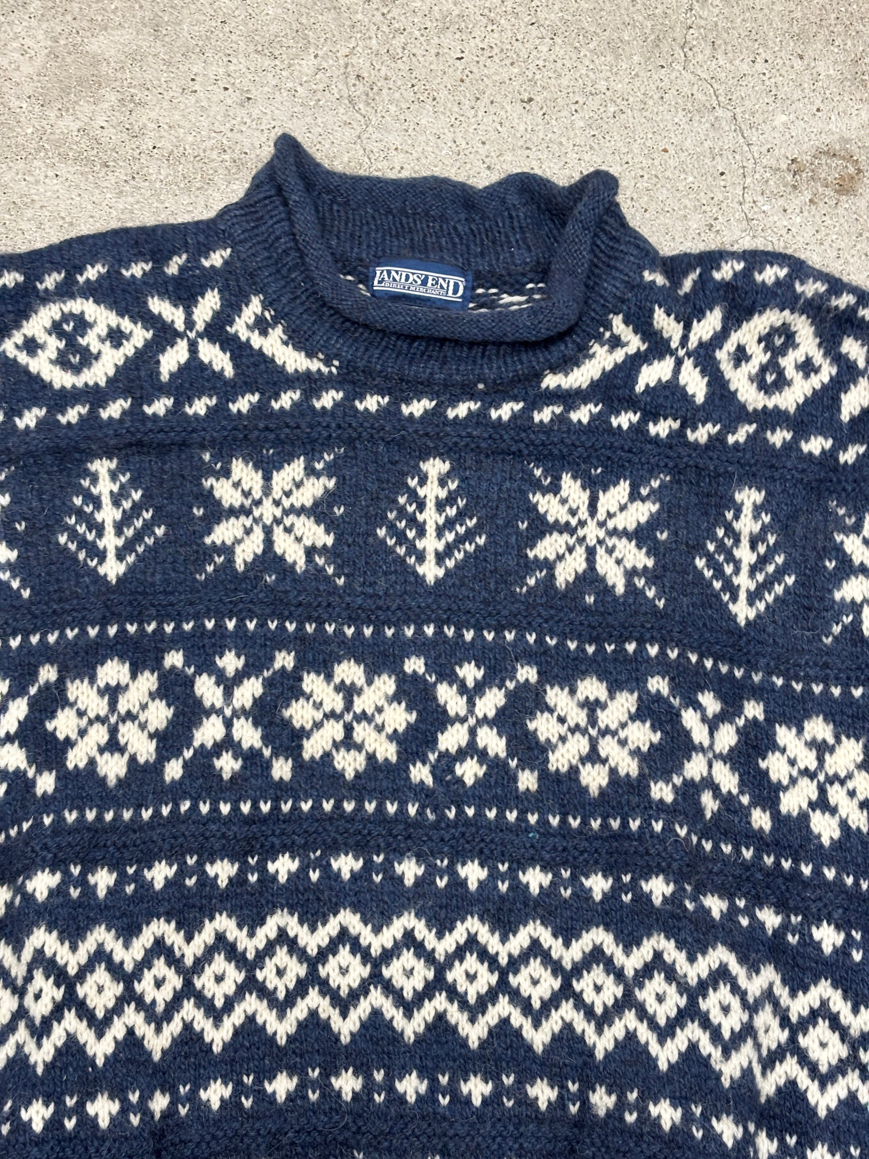 90~00s LANDS`END/Nordic Knit Sweater/SCOTLAND製/XL/ノルディック柄ニットセ-タ-/総柄/ネイビ-/ランズエンド