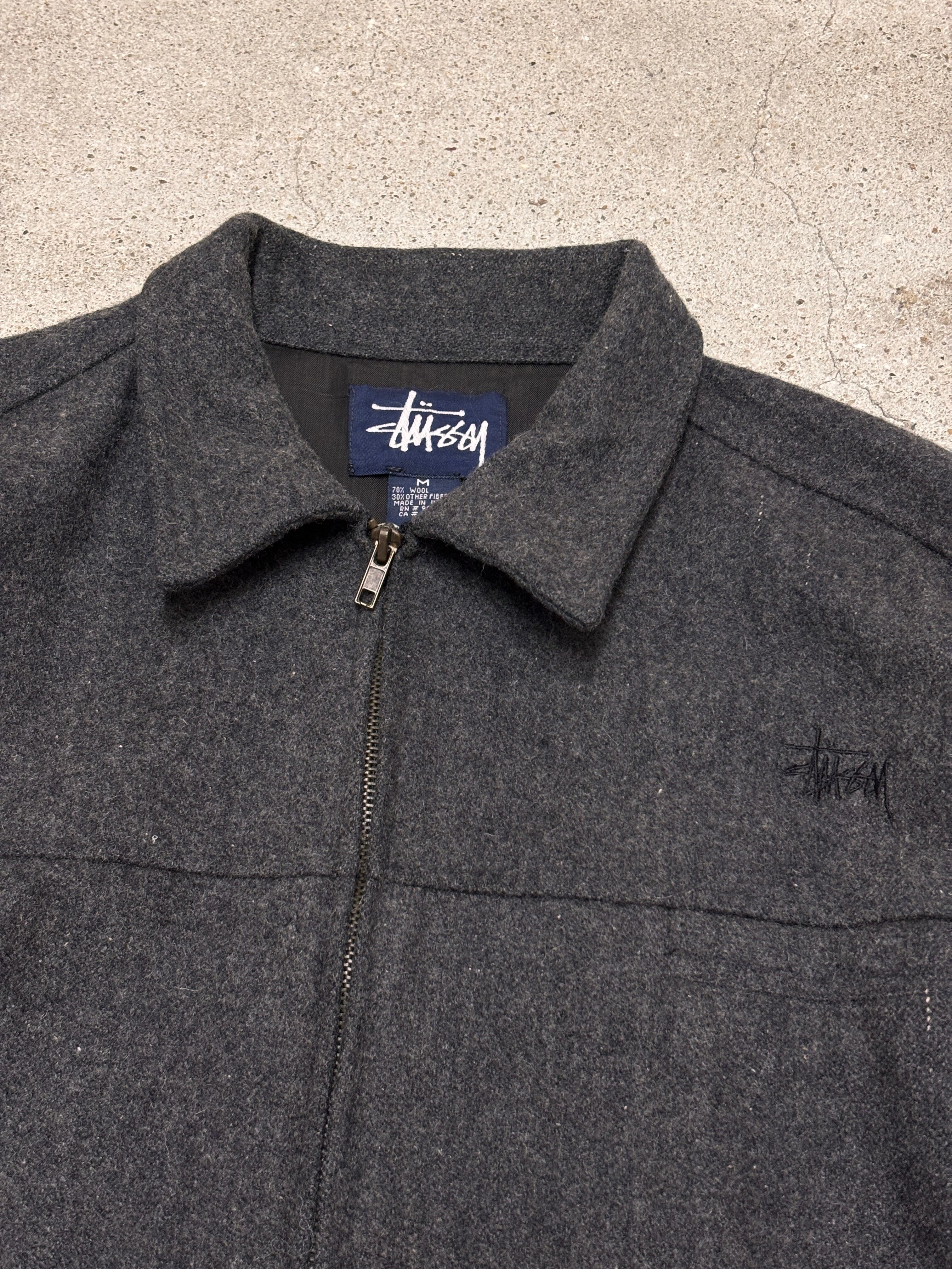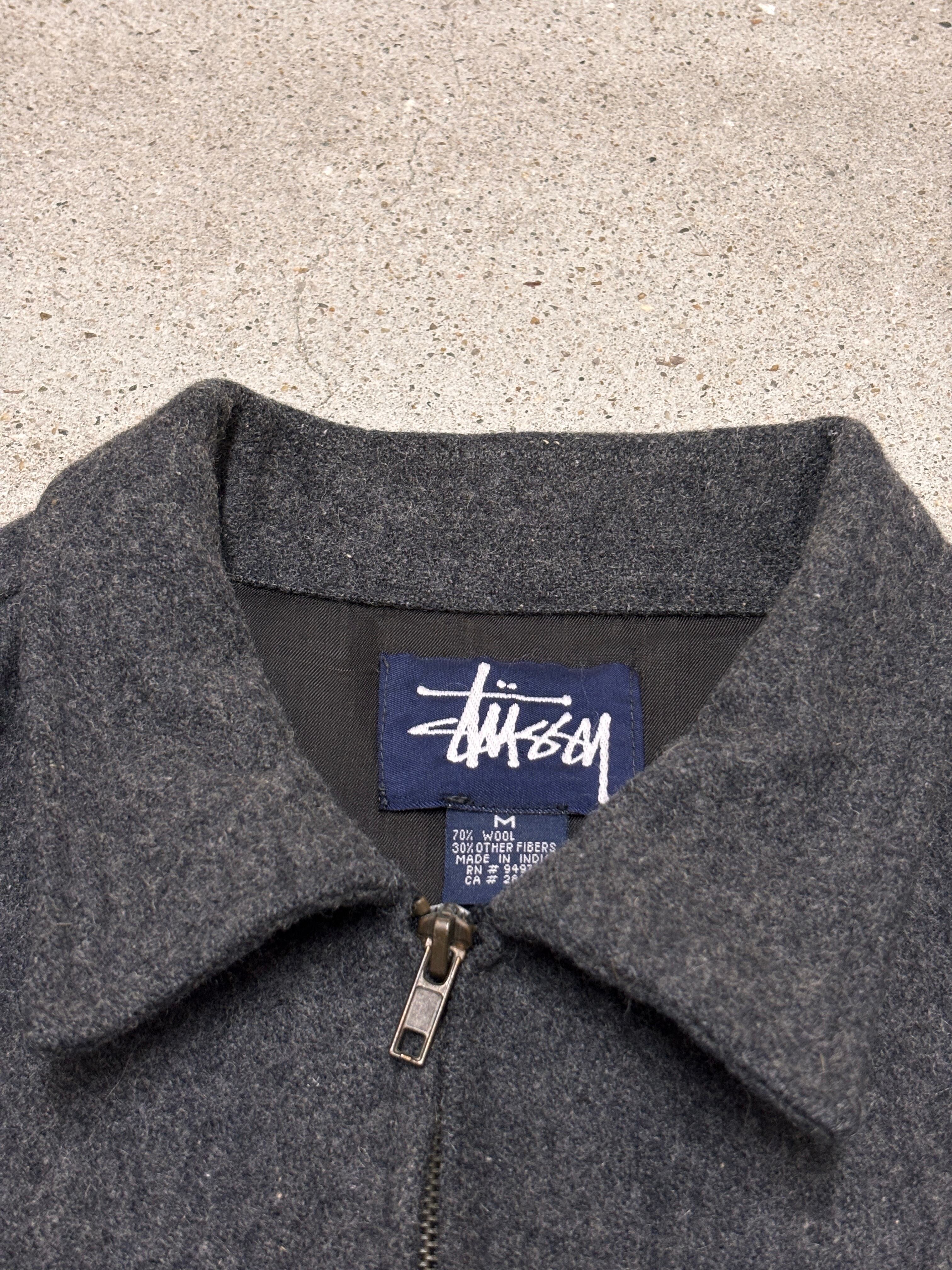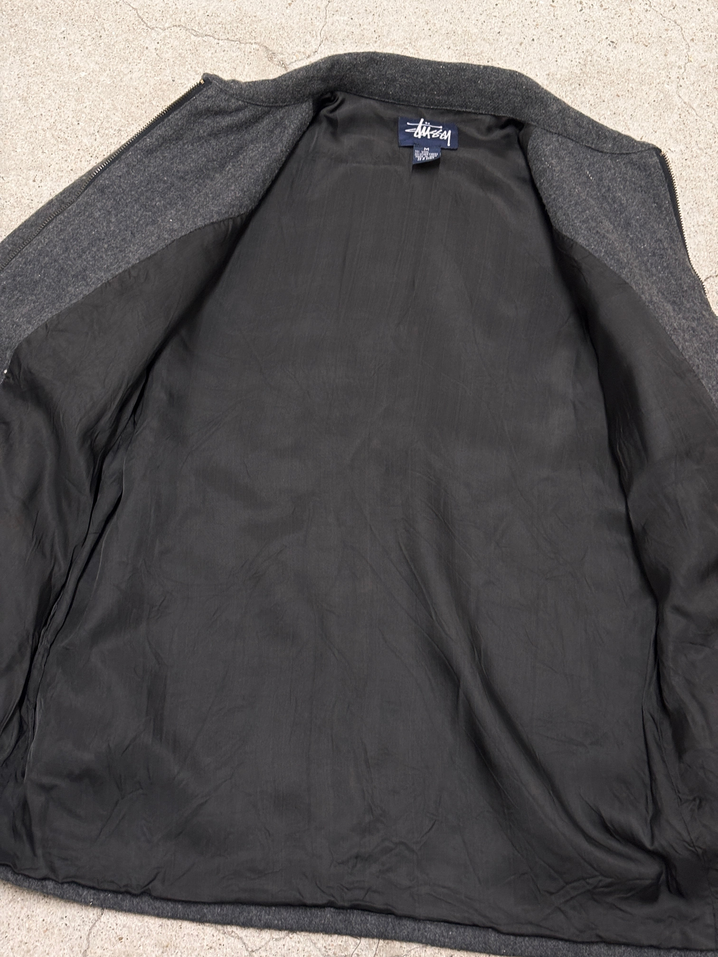 90~00s OLD STUSSY/Logo embroidery Wool Jacket/紺タグ/INDIA製/M (XL相当)/刺繍ロゴ/ウ-ルジャケット/ハ-フコ-ト/ストックロゴ/グレ-/ステューシー/オ-ルドステューシー