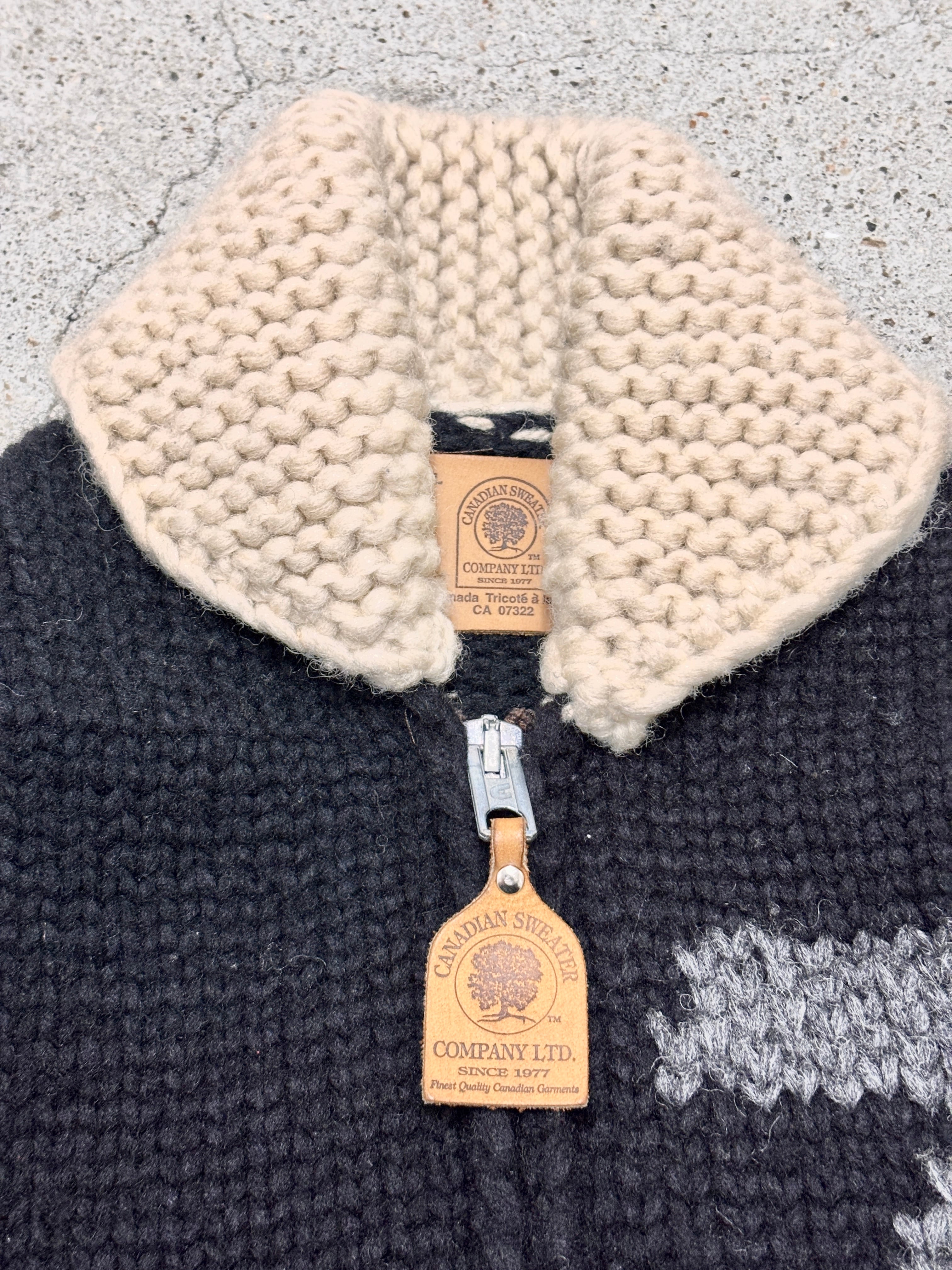 90s OLD STUSSY×CANADIAN SWEATER/Cowichan Sweater/Canada製/M相当/カウチンセ-タ-/カ-ディガン/SSリンクロゴ/ネイビ-/クリ-ム/カナディアンセ-タ-コラボ/ステューシー/オ-ルドステューシー/古着/ア―カイブ