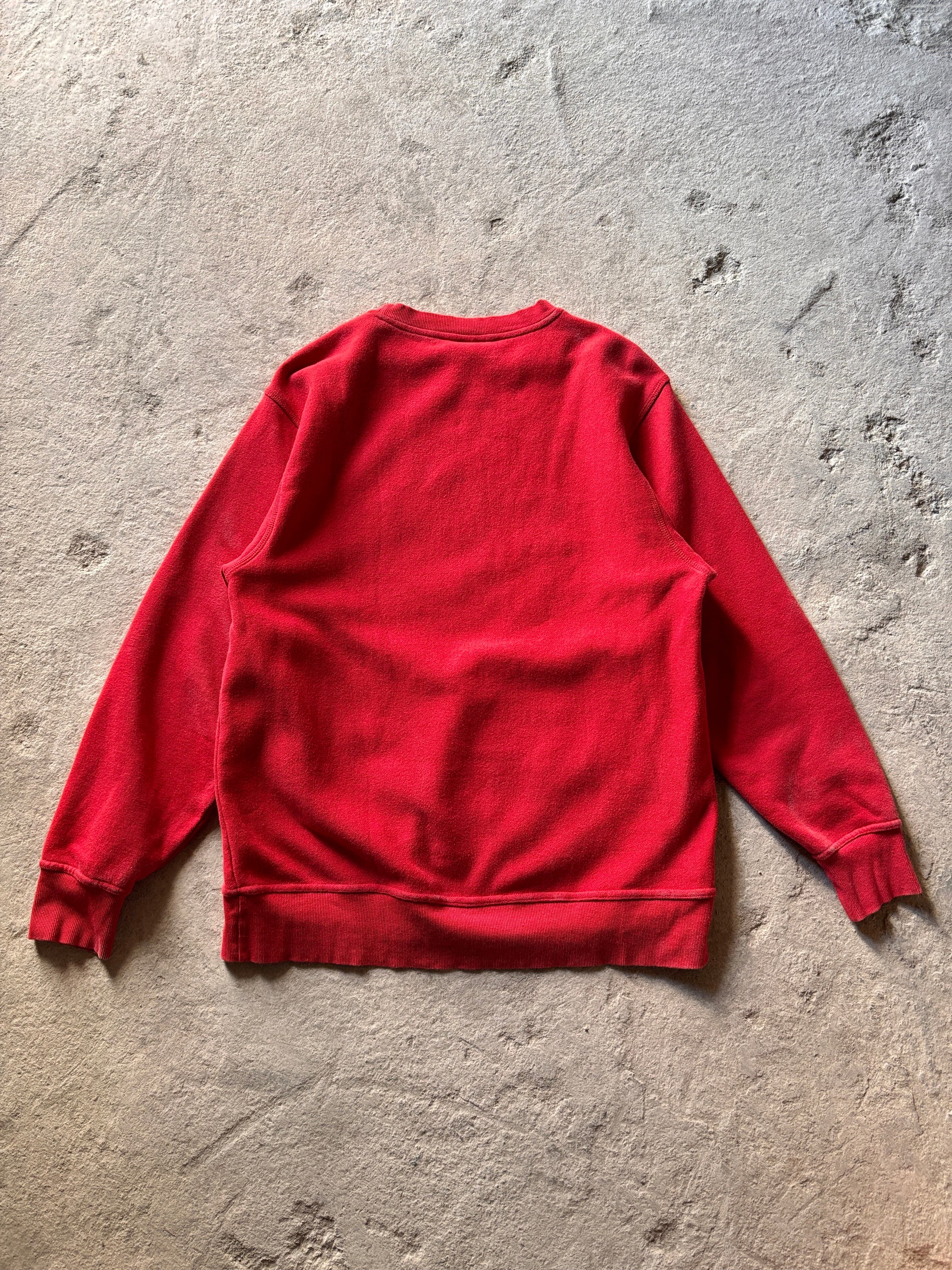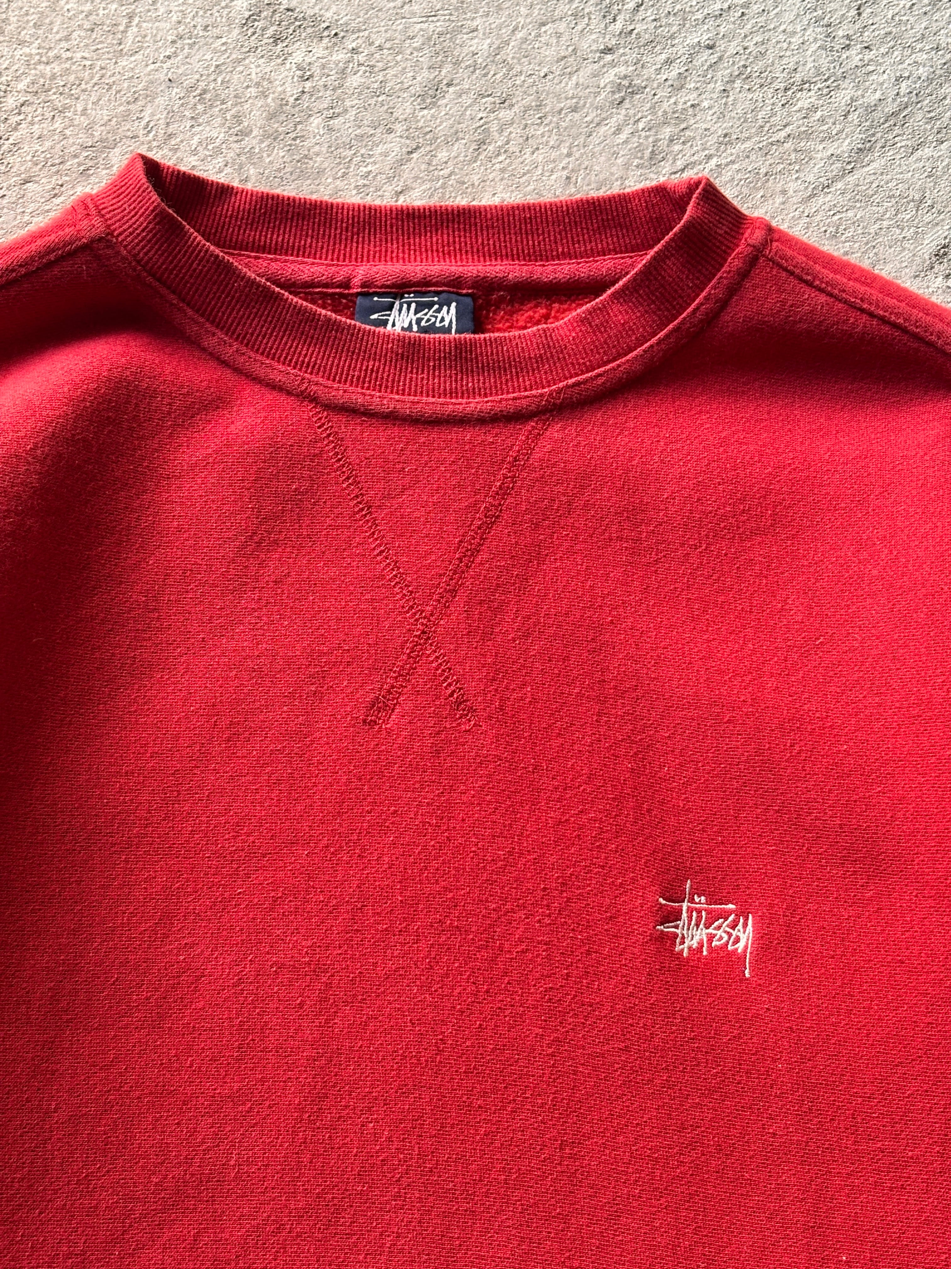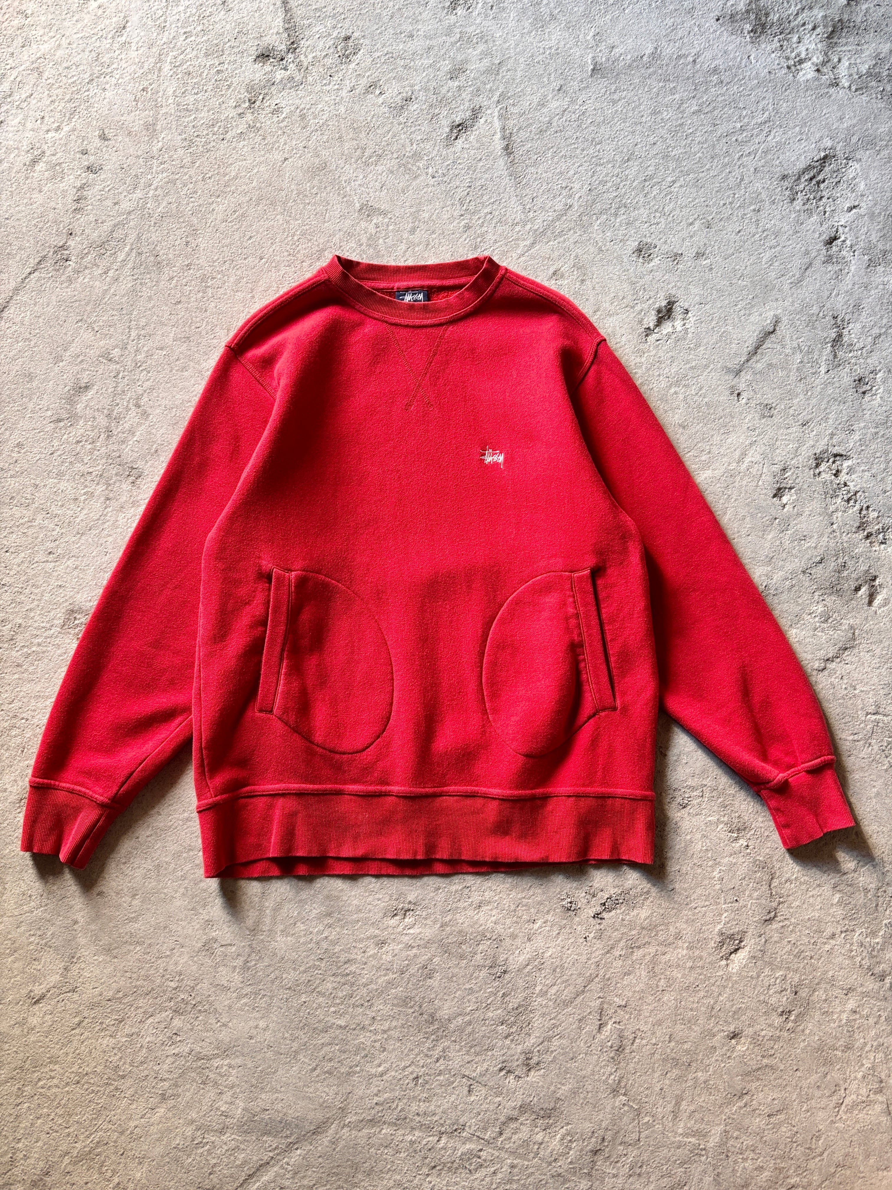 90s OLD STUSSY/Logo embroidery Sweat/紺タグ/1996年/M/刺繍ロゴスウェット/ストックロゴ/丸ポケット/レッド/ステューシー/オ-ルドステューシー