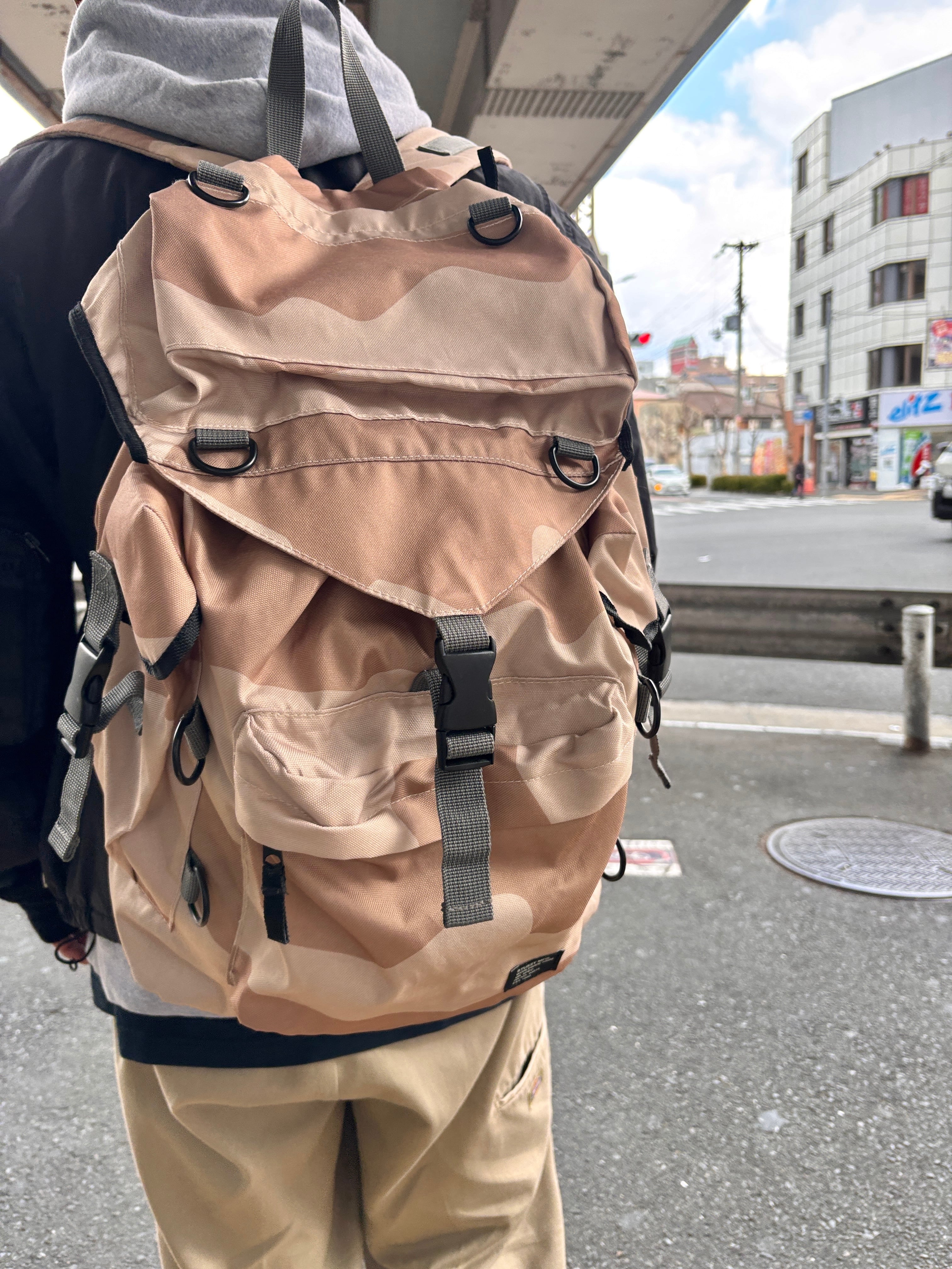 ステューシーのカモフラ柄バックパック。