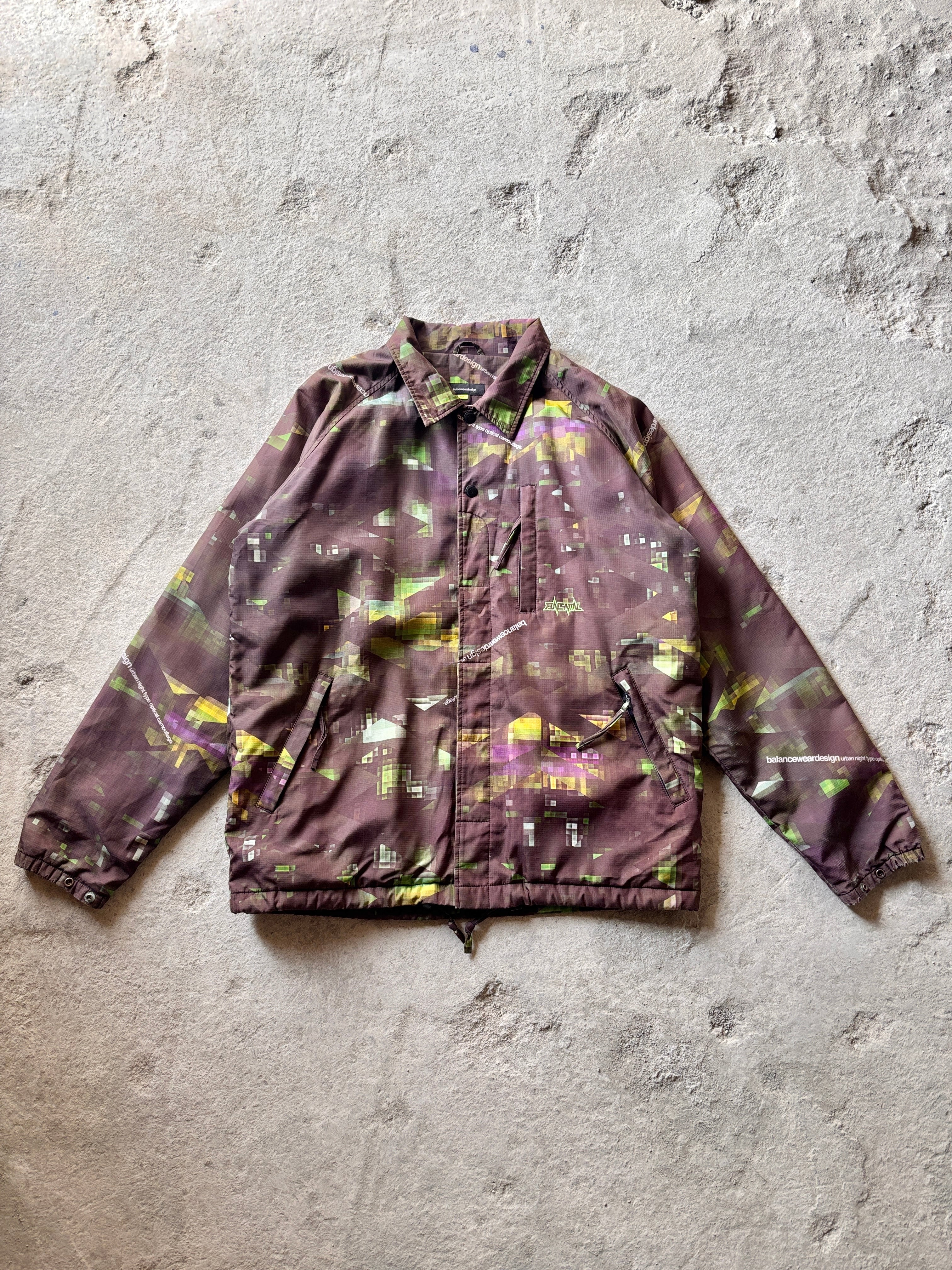 00s balanceweardesign/Night camo Coach Jacket/L/ナイトカモ柄コ-チジャケット/デジカモ/刺繍ロゴ/ロゴプリント/ナイロンジャケット/総柄/カ-キ/バランスウェアデザイン/古着/ア-カイブ