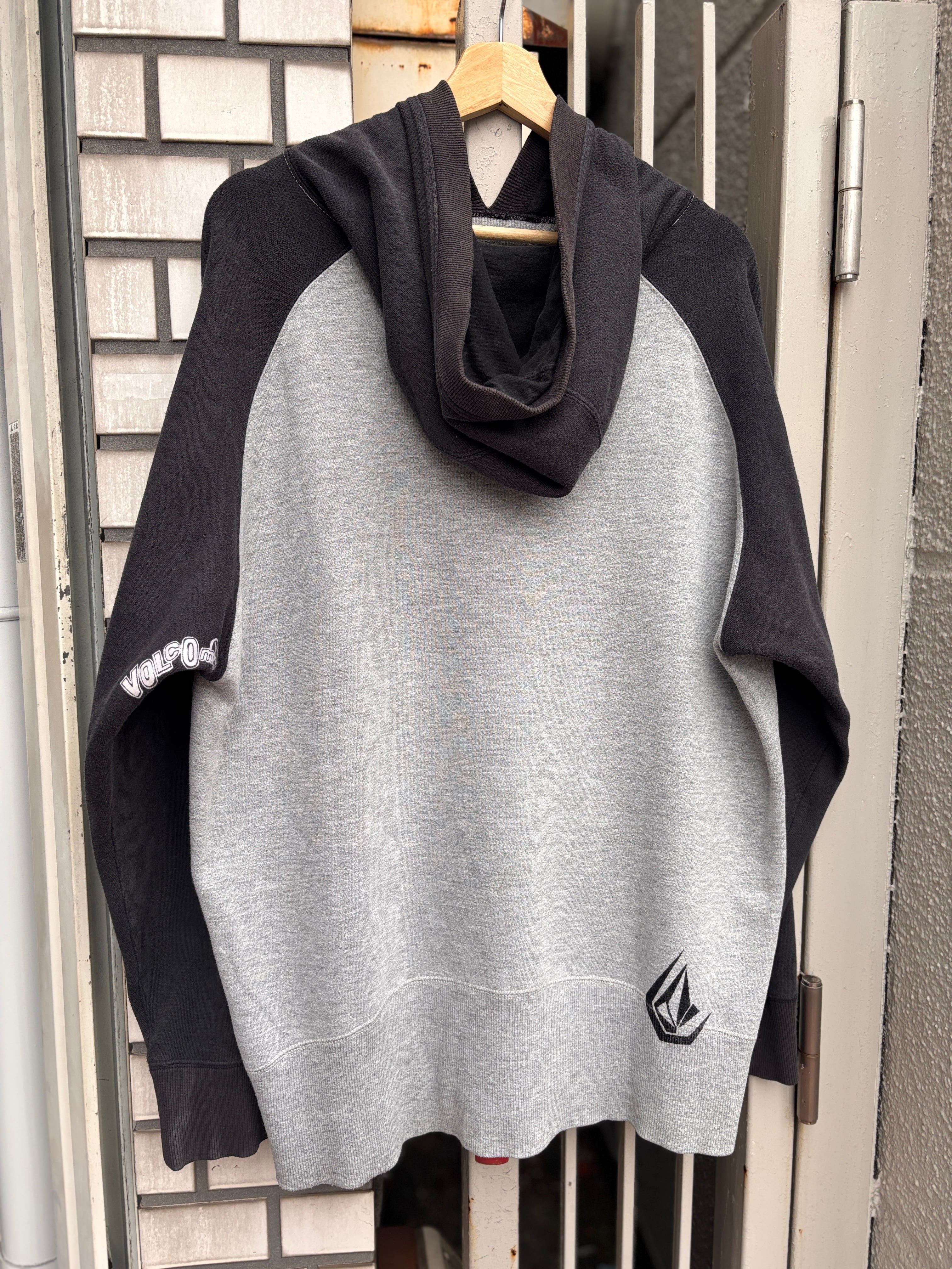 00s VOLCOM/Logo print Hoodie/XL/ロゴプリントフ-ディ-/パ-カ-/ラグラン/グレ-/ブラック/ボルコム/サーフ/スノーボード/古着