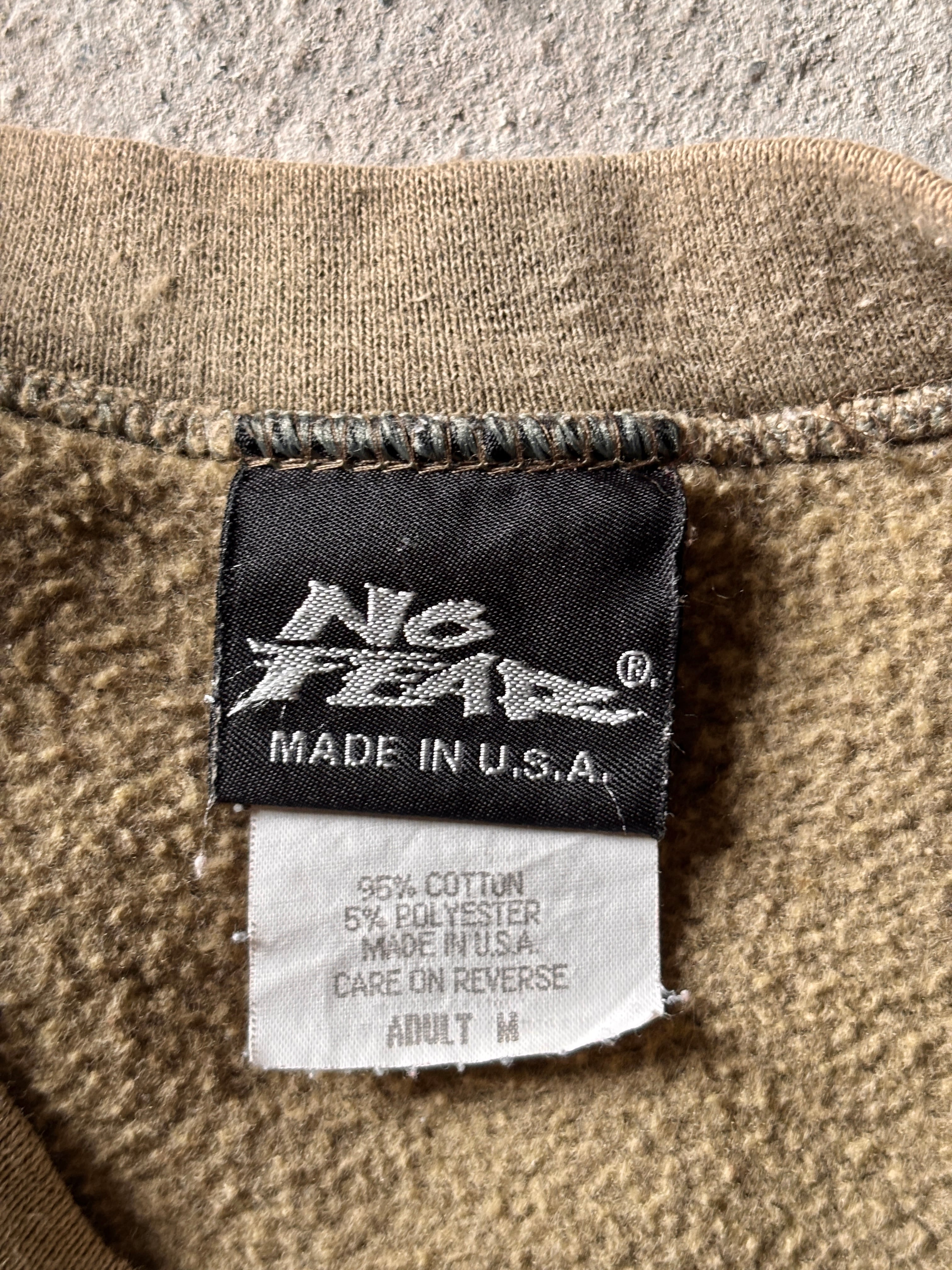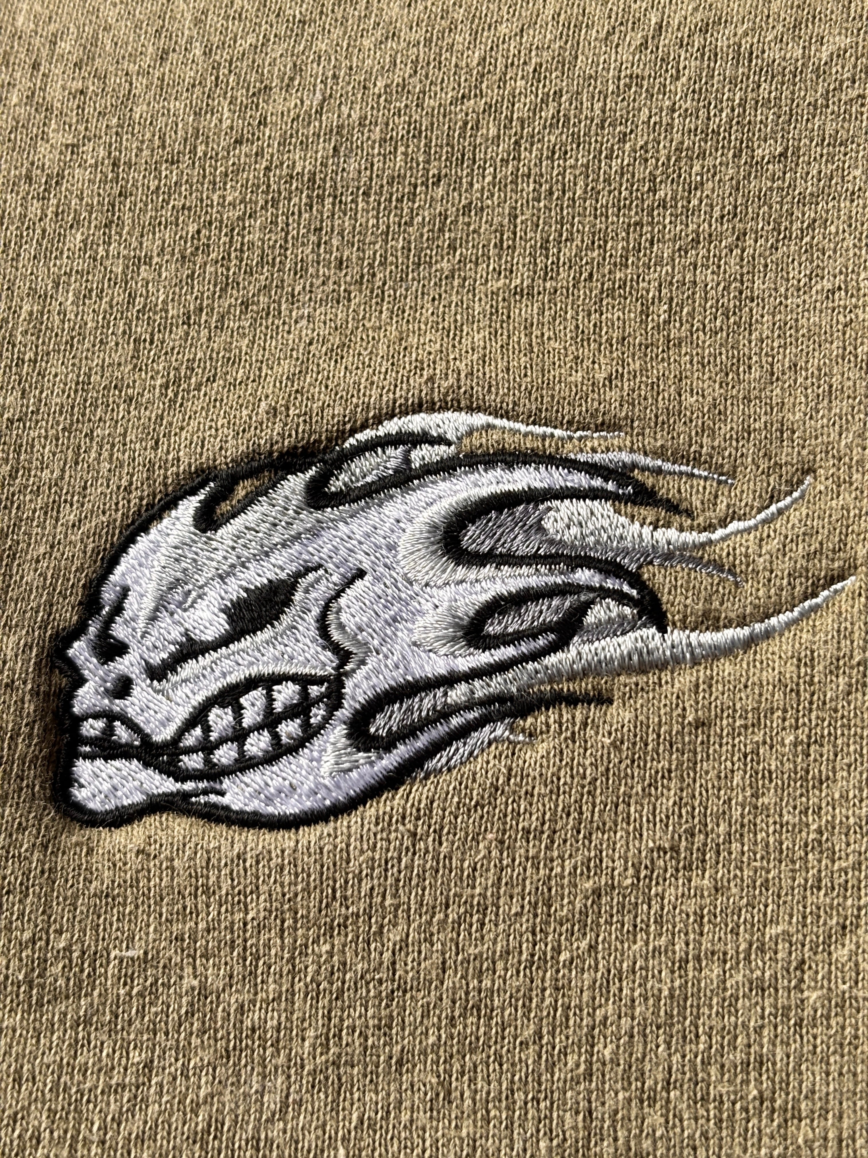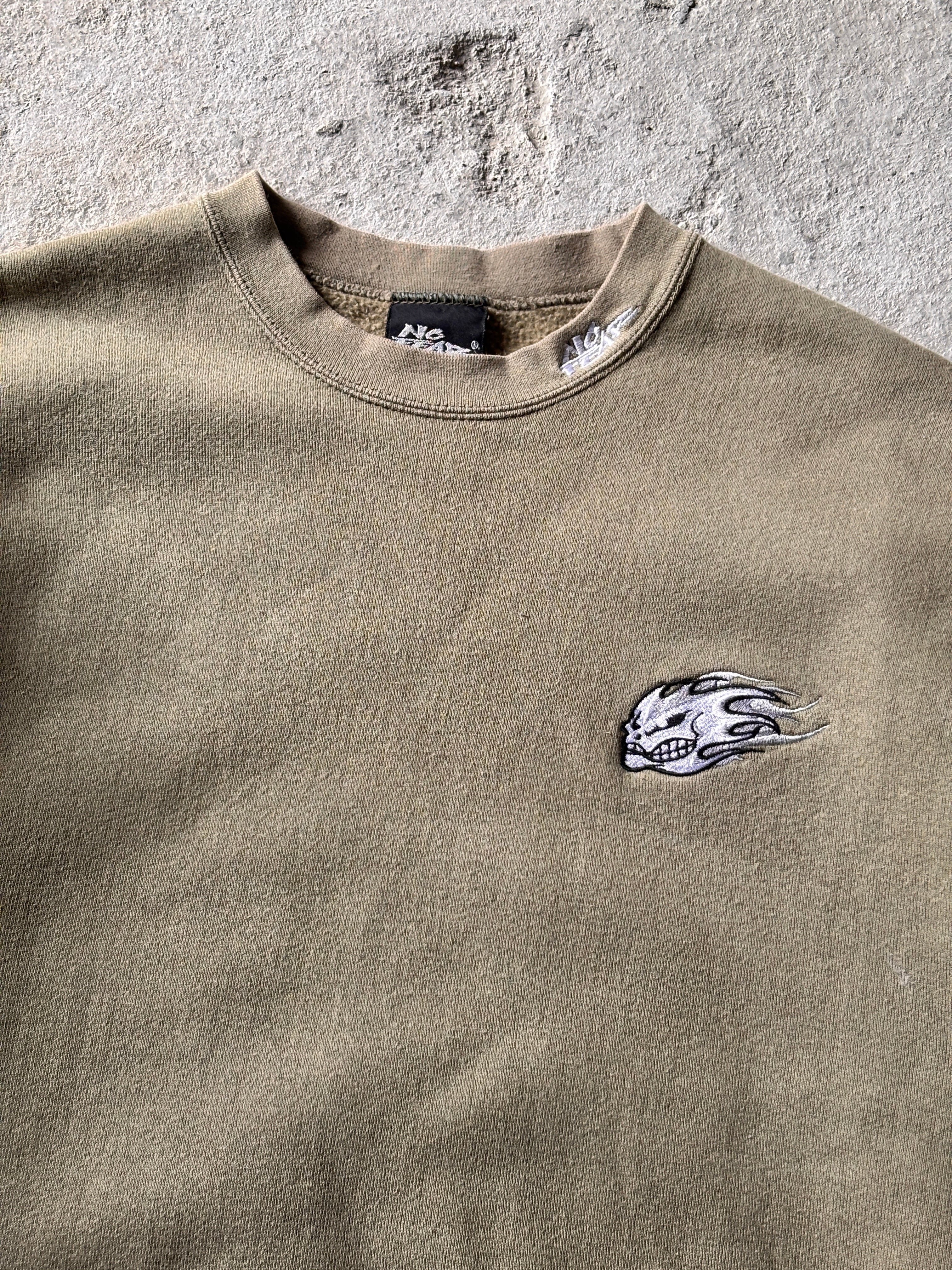 90s NO FEAR/Skull embroidery Sweat/USA製/M/スカル刺繍スウェット/フレイム/カ-キ/ノ-フィア-/SURF/SKATEBOARDS/スケ-ト/スケートボード/古着