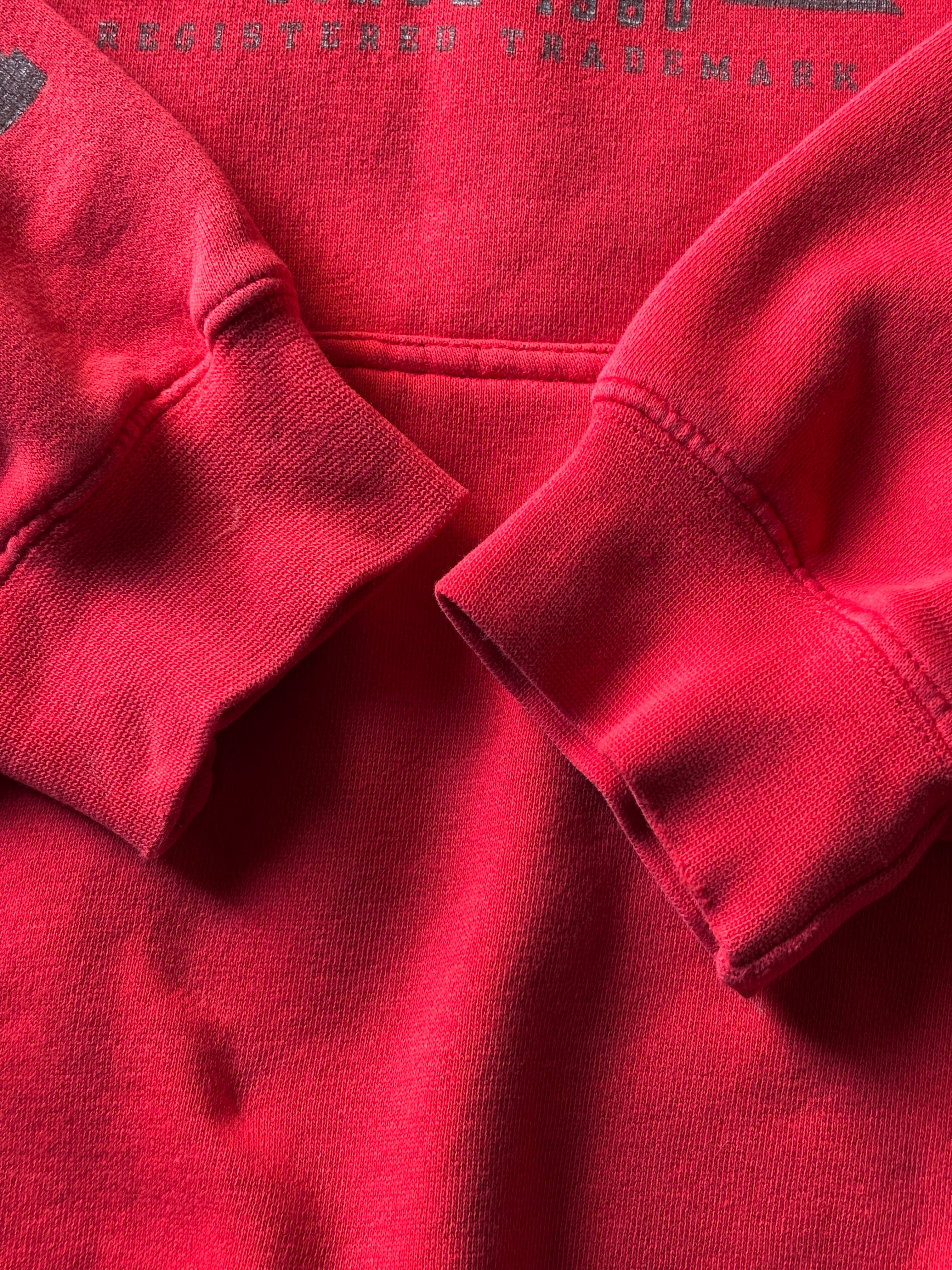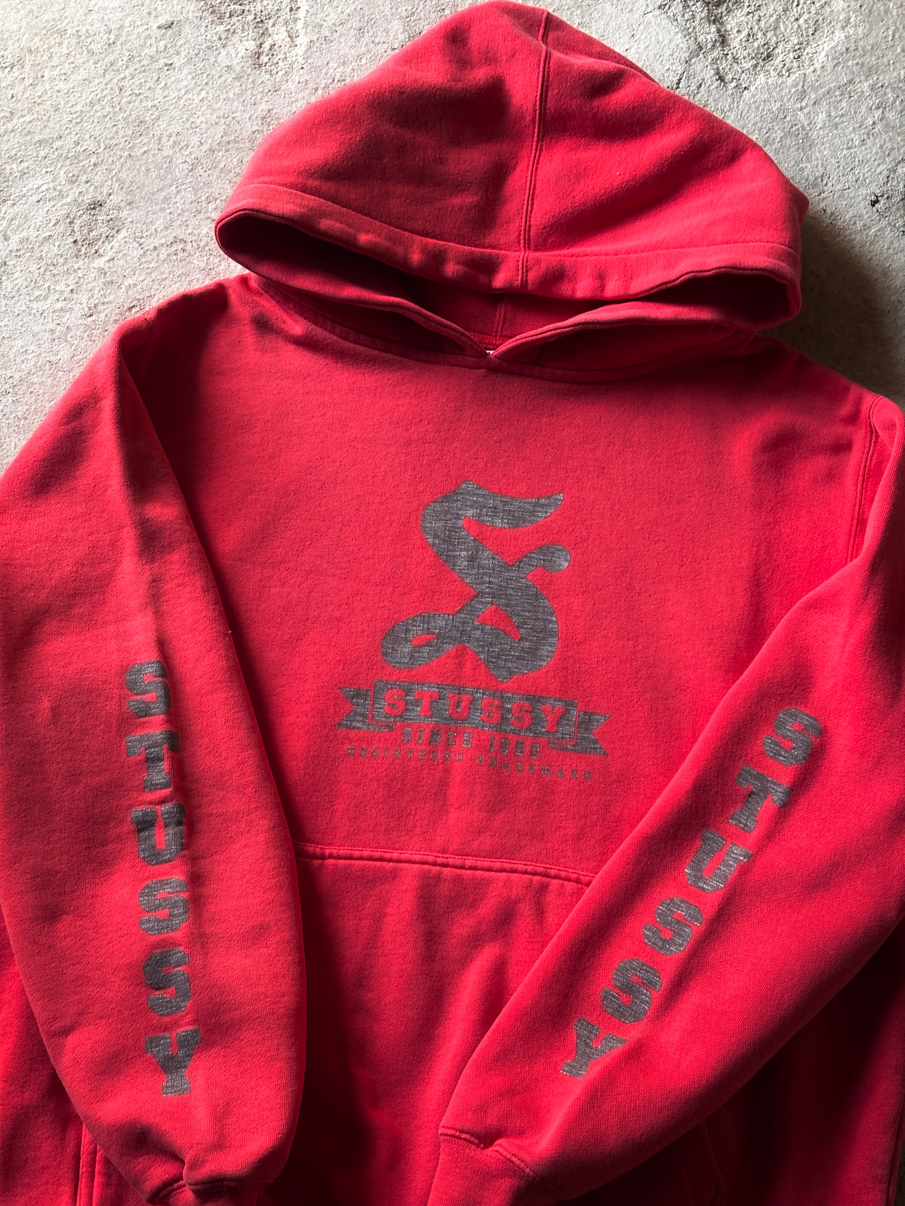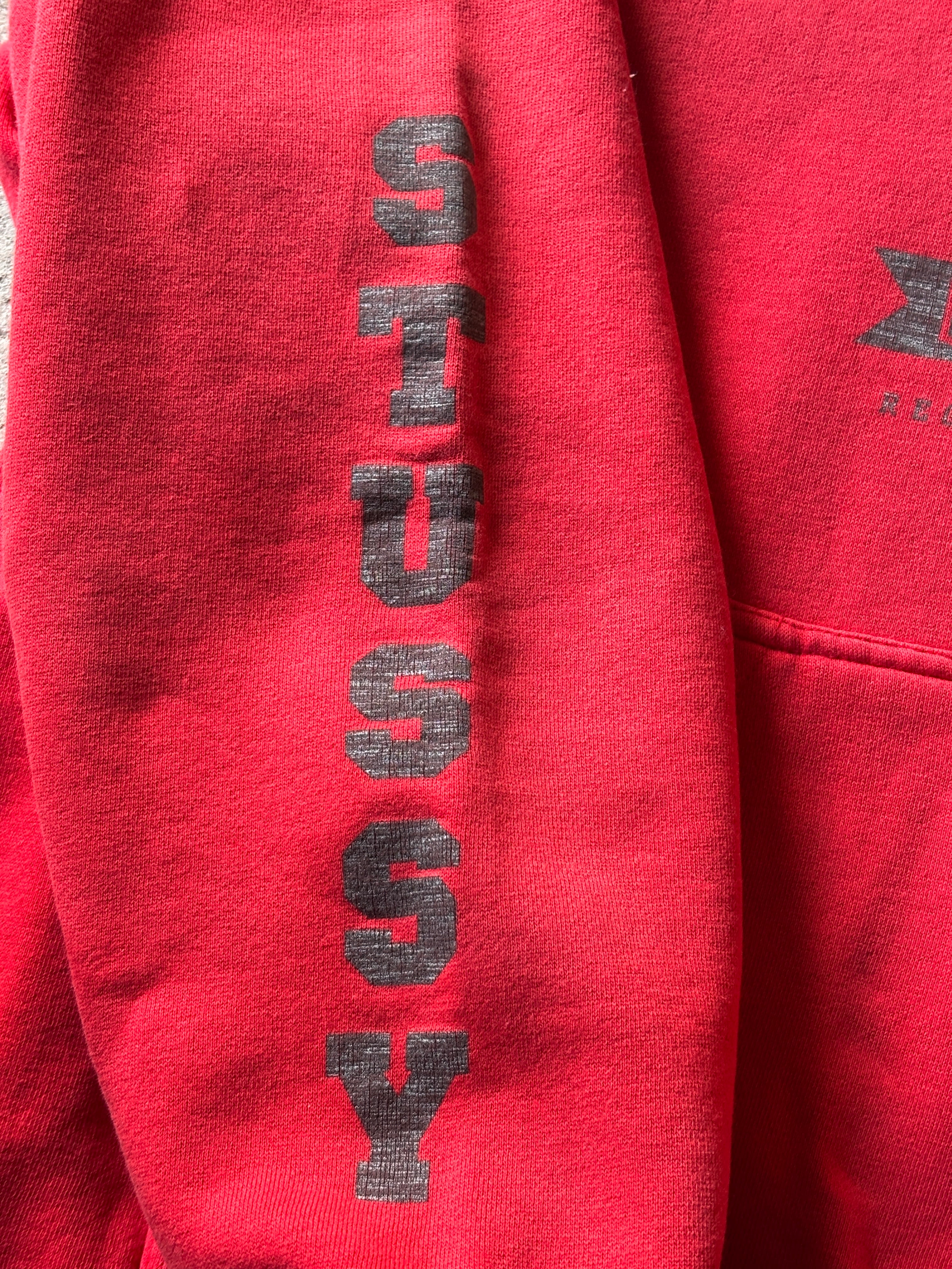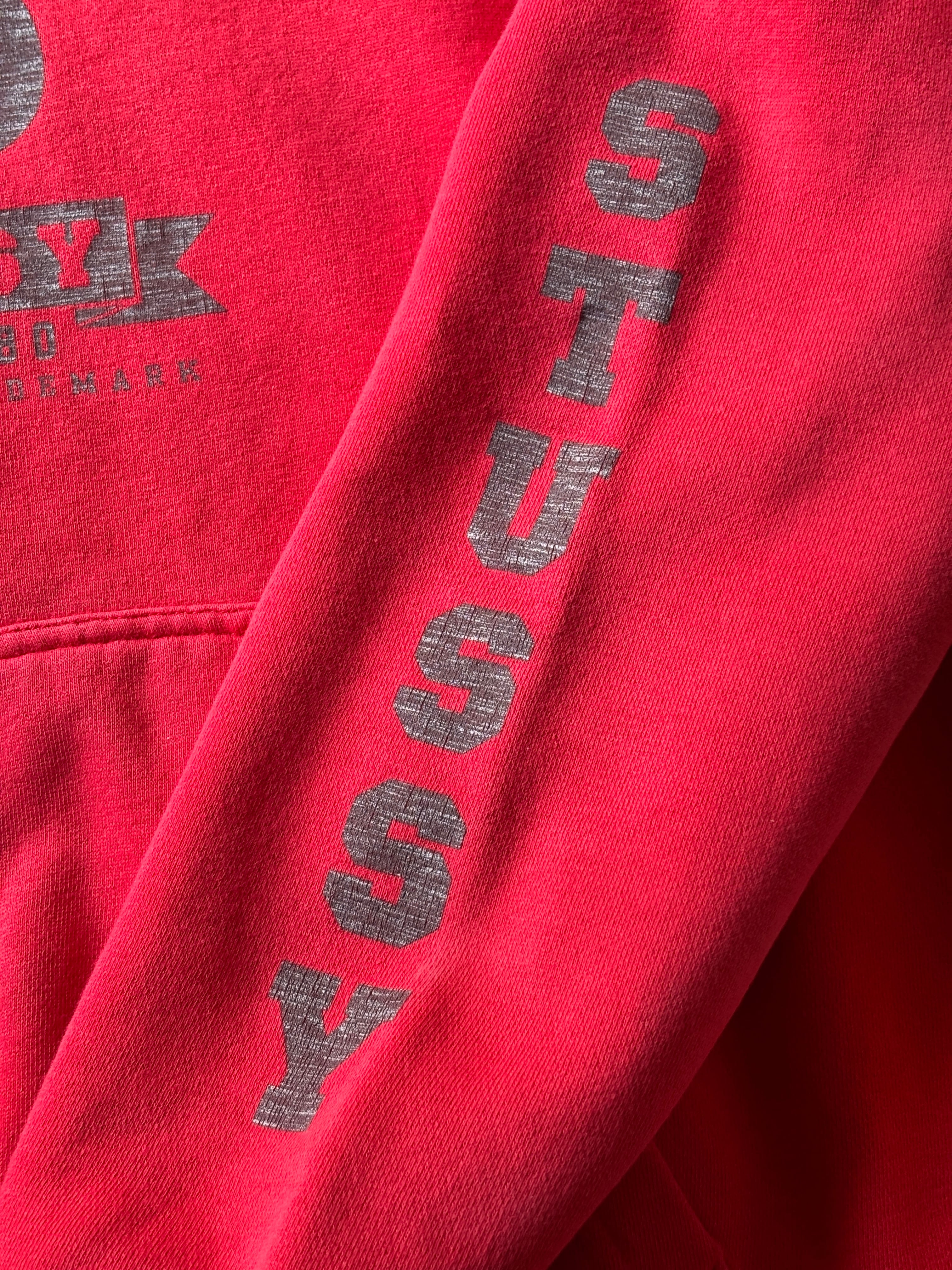 90~00s OLD STUSSY/Logo print Hoodie/紺タグ/S(M相当)/ロゴプリントフ-ディ-/パ-カ-/袖プリ/レッド/ステューシー/オ-ルドステューシー/古着/ア―カイブ