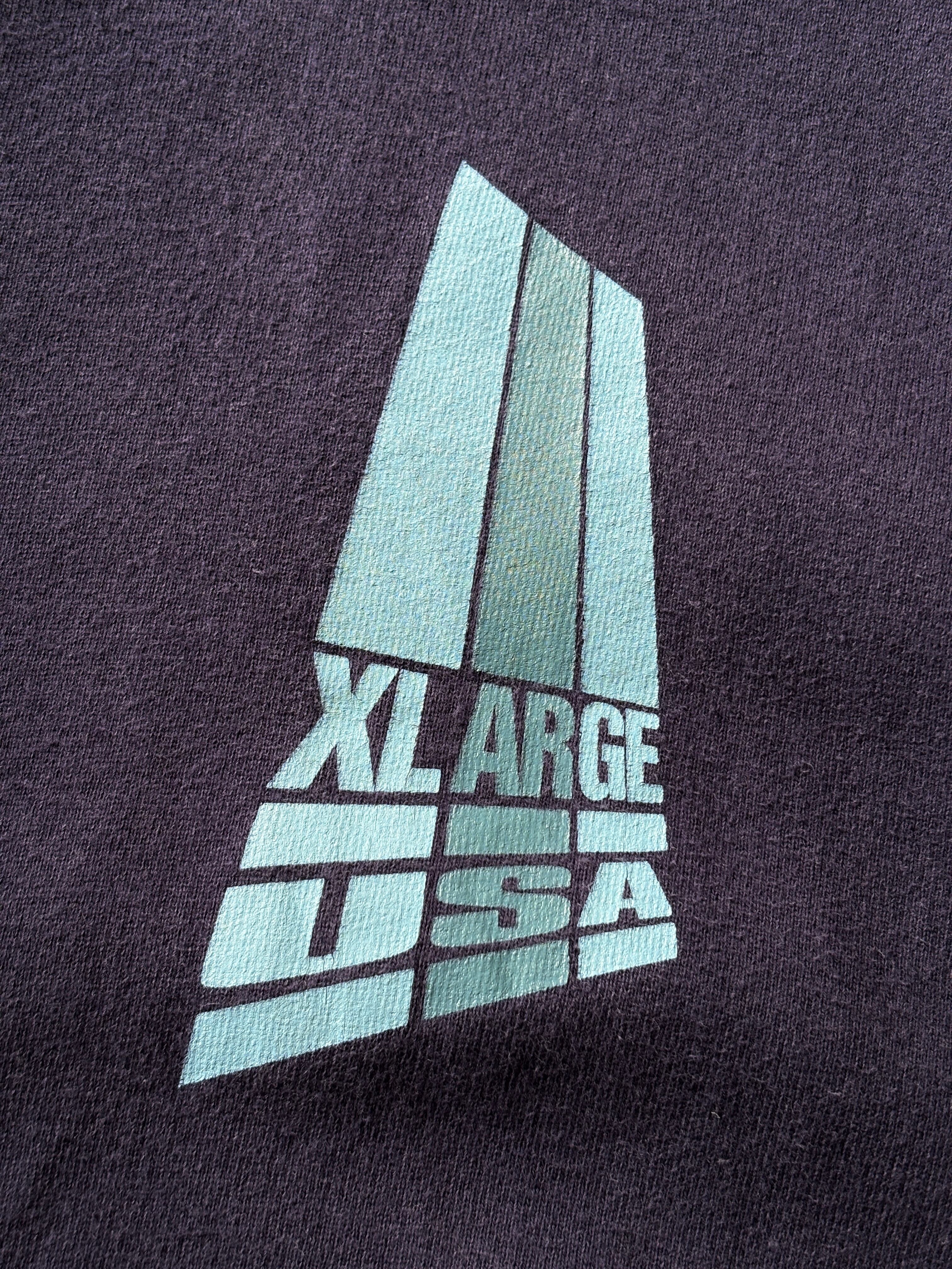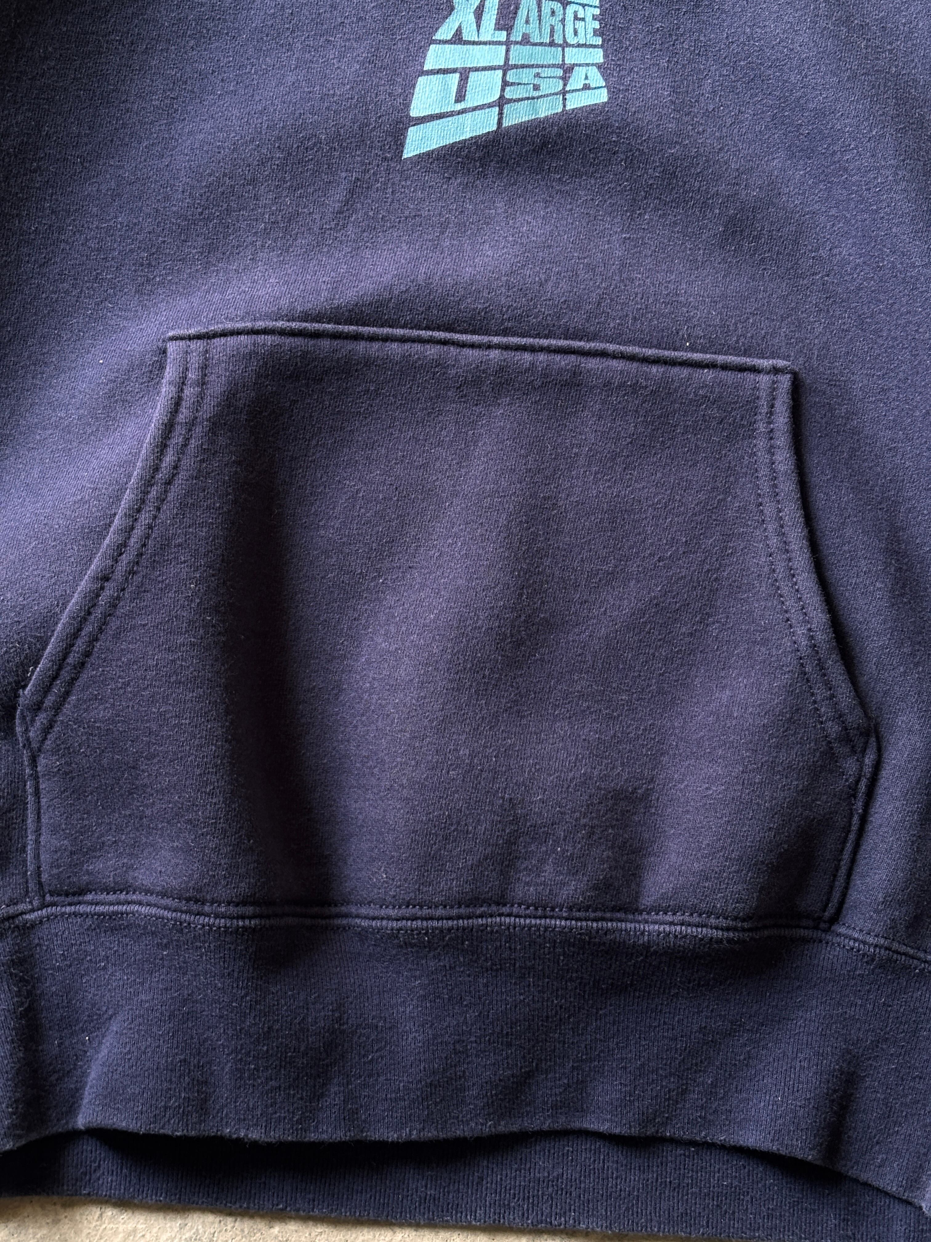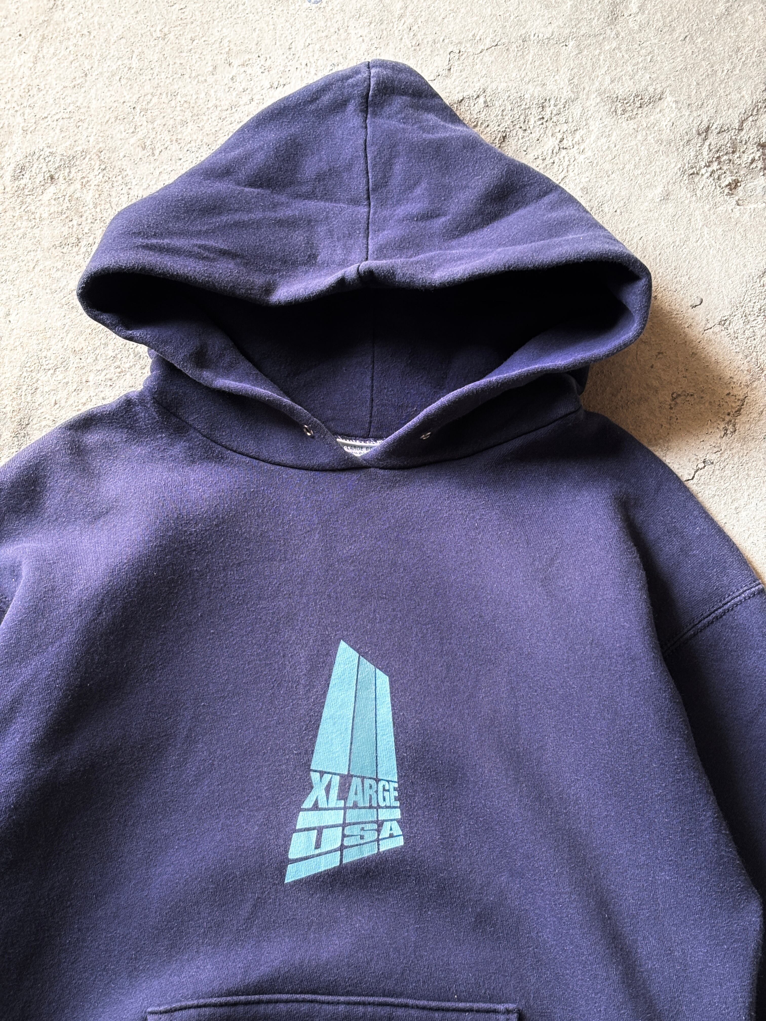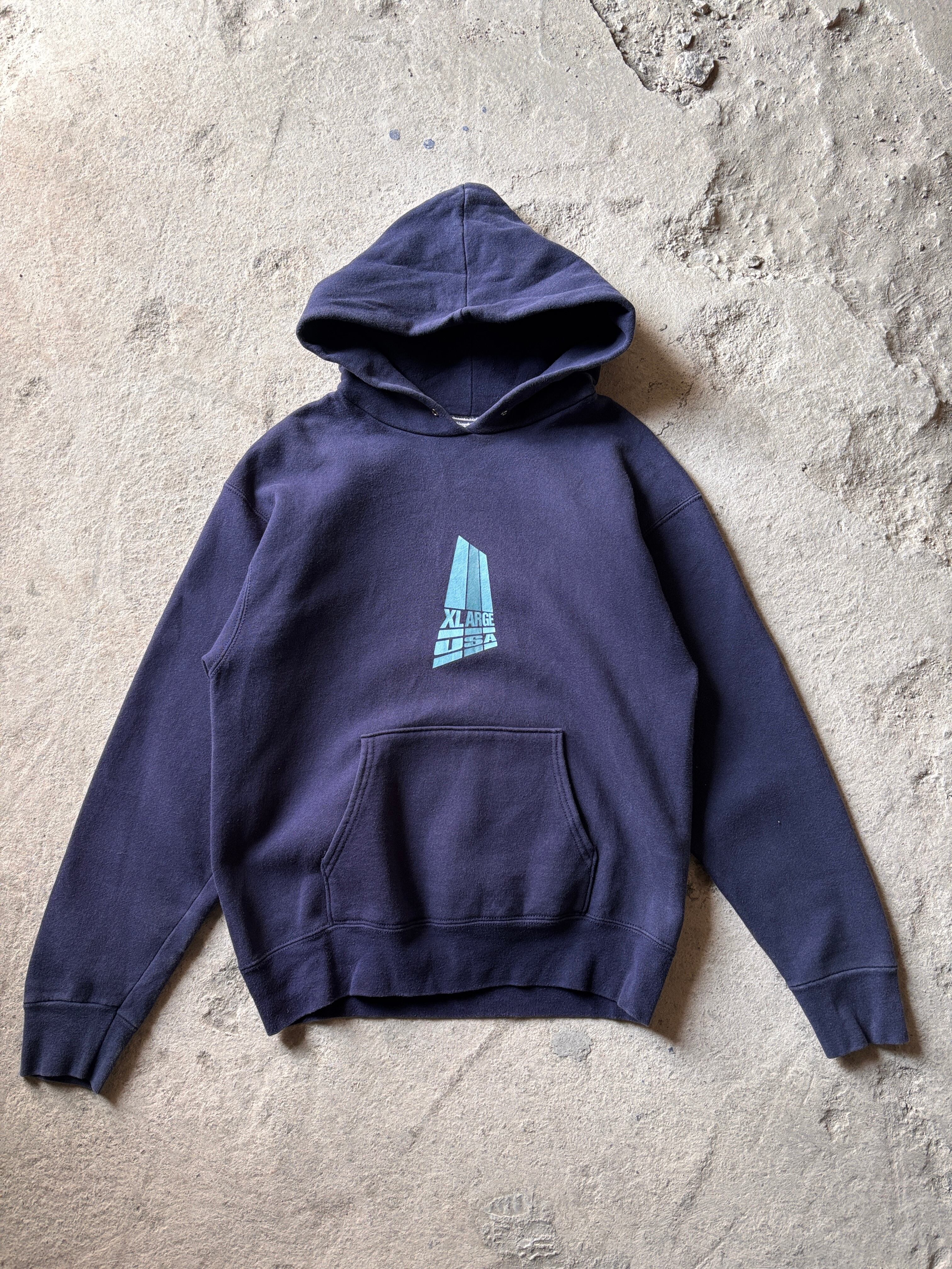 90s X-LARGE/Logo print Hoodie/USA製/M/ロゴプリントフ-ディ-/パ-カ-/ネイビ-/エクストララージ/古着/ア―カイブ