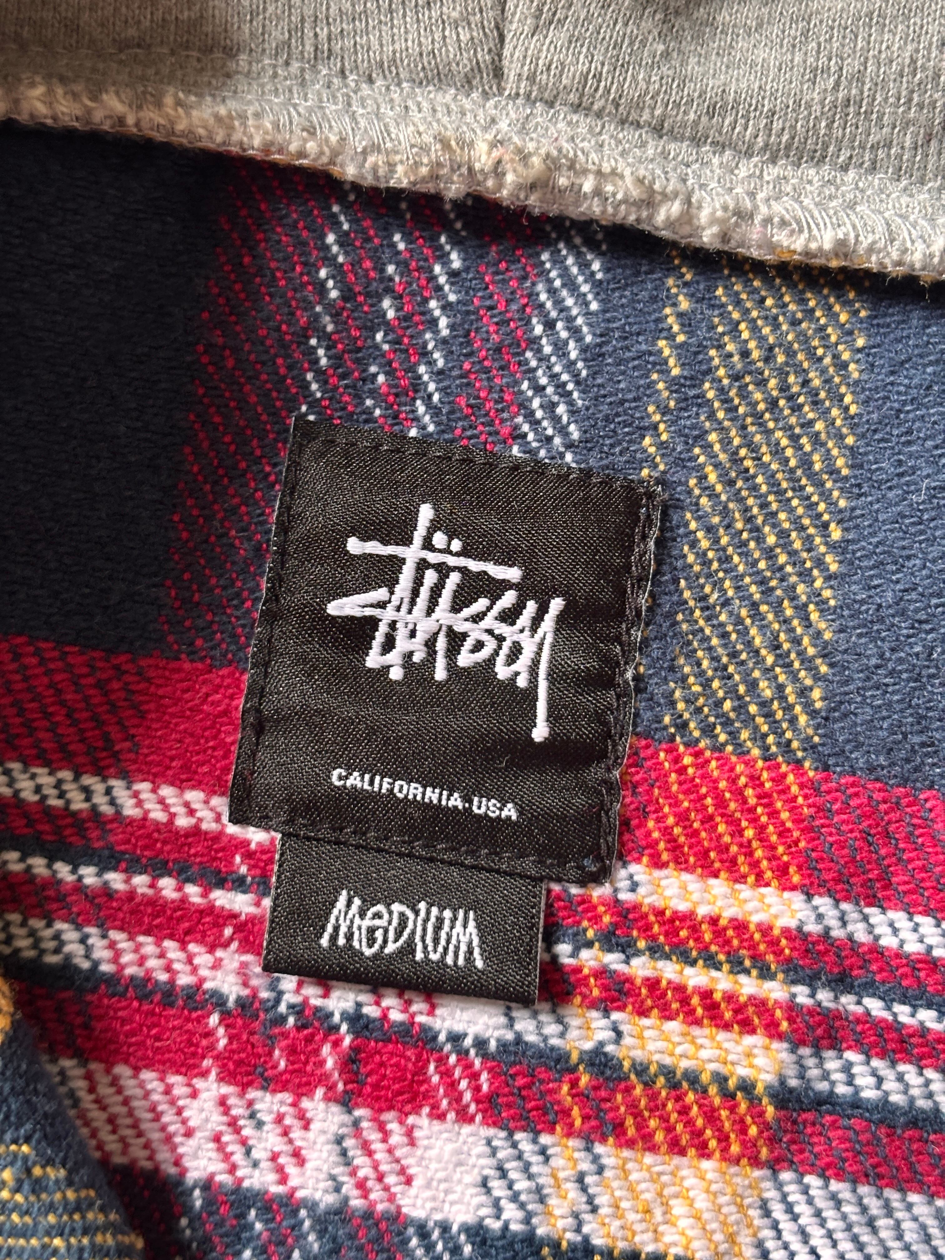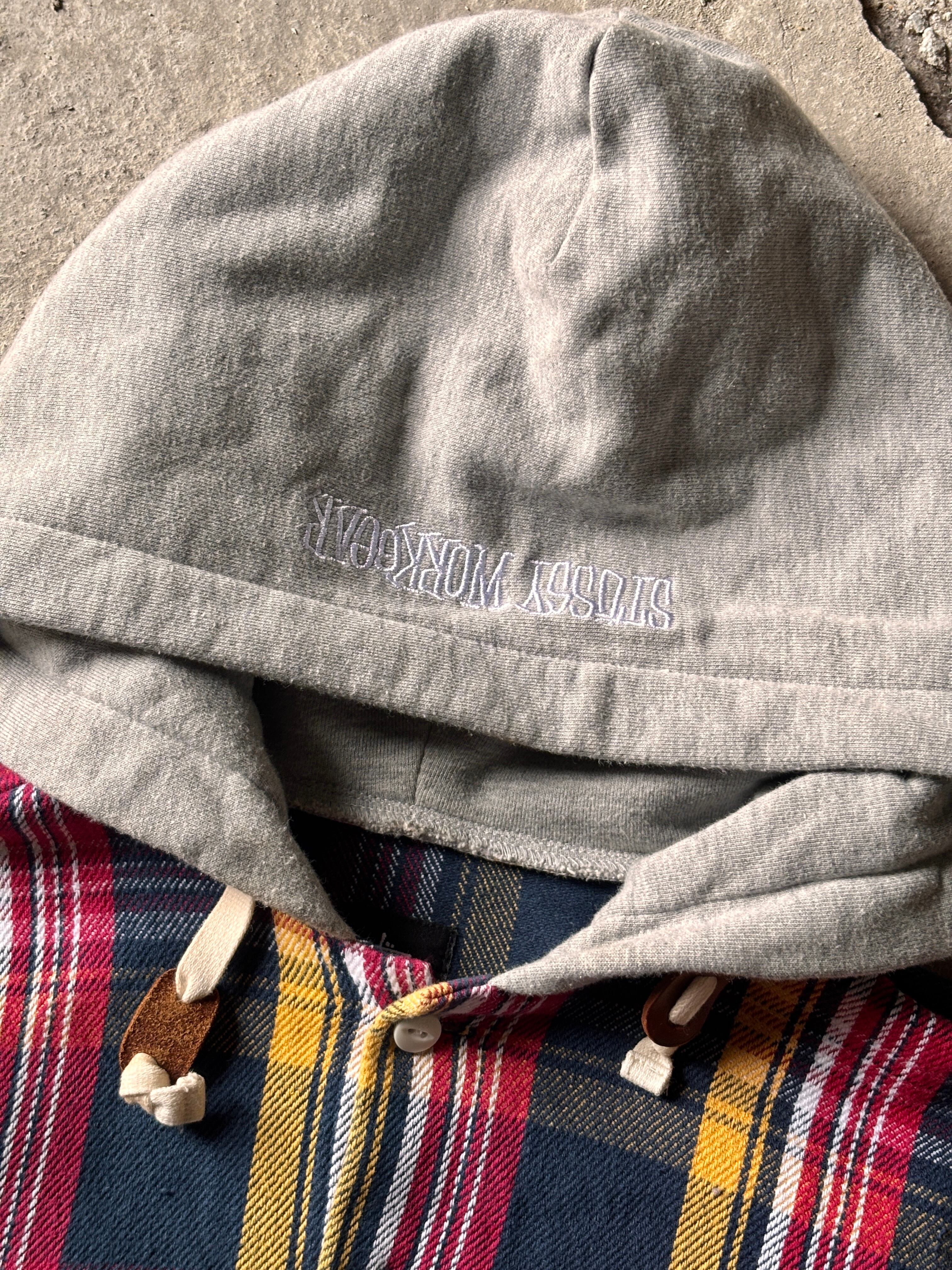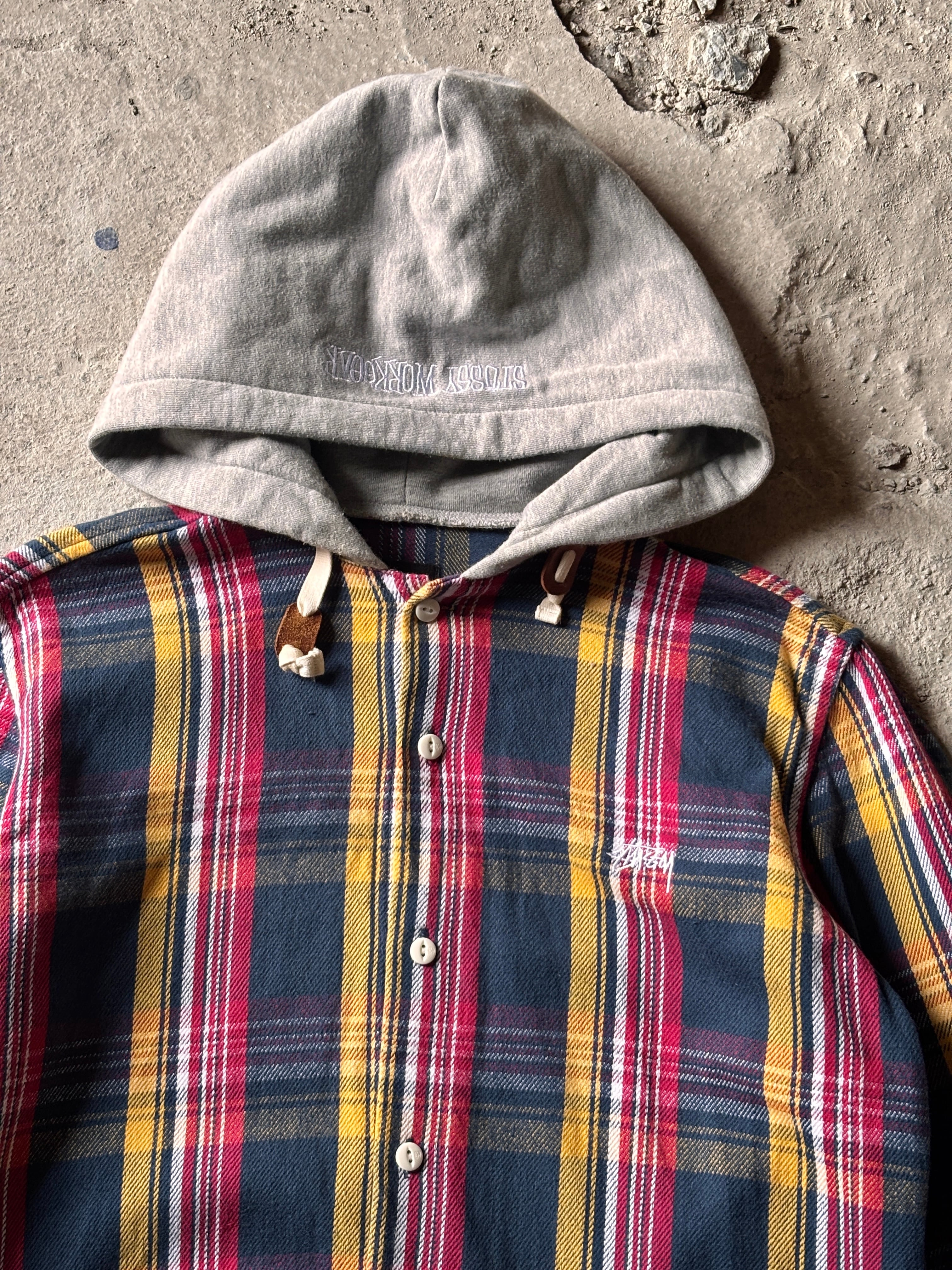 10s STUSSY/Hooded Flannel Shirt/M/フード付きネルシャツ/刺繍ロゴ/ストックロゴ/長袖シャツネイビ-/レッド/イエロ-/ステューシー