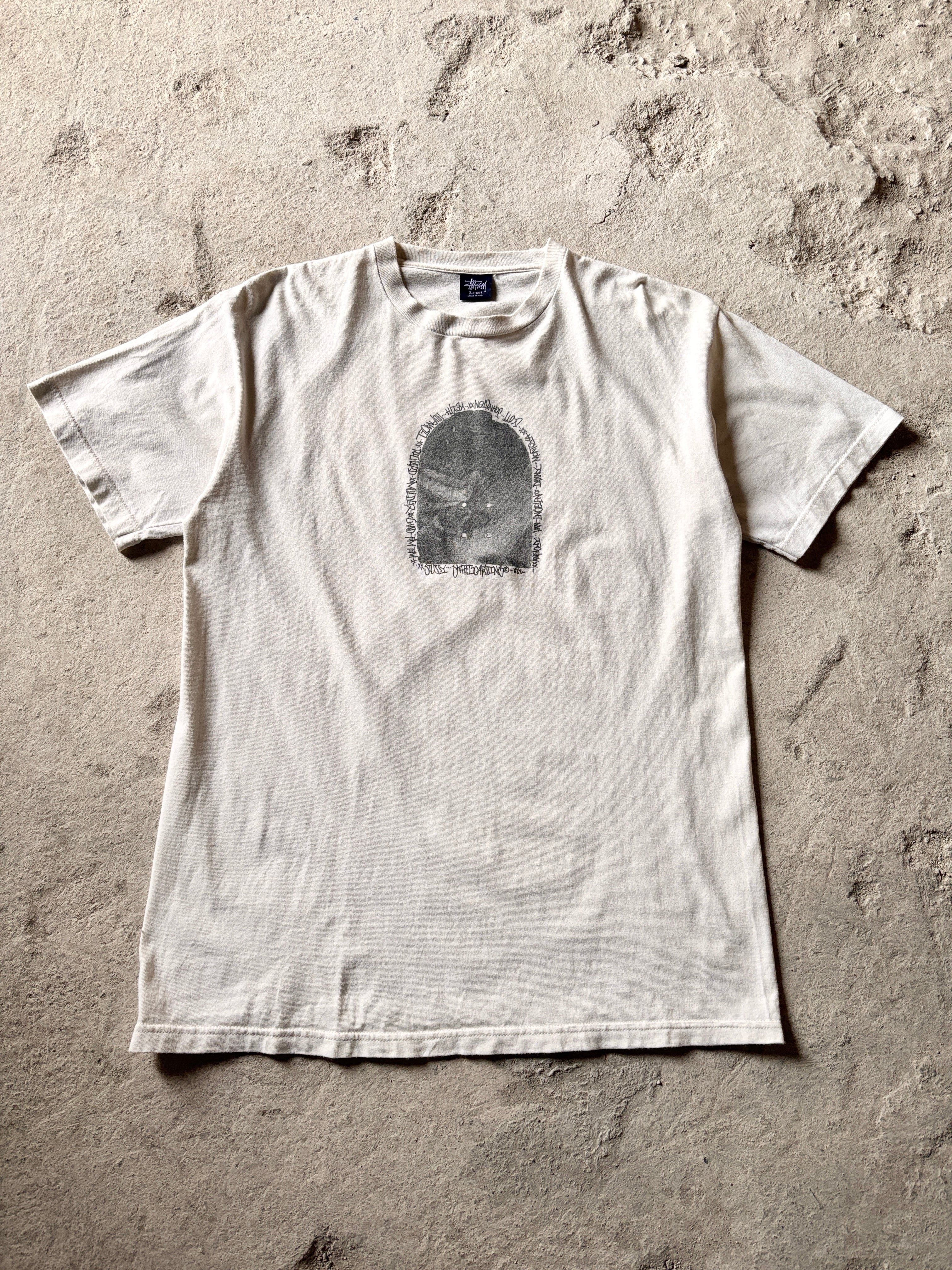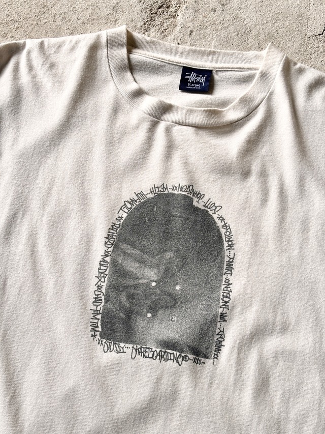 00s OLD STUSSY/STUSSY SKATEBOARDING Tee/USA製/L/ステューシースケ-トチ-ムプリントTシャツ/Keith Hufnagel/HUF/スケボ-/ホワイト/ステューシー/オ-ルドステューシー