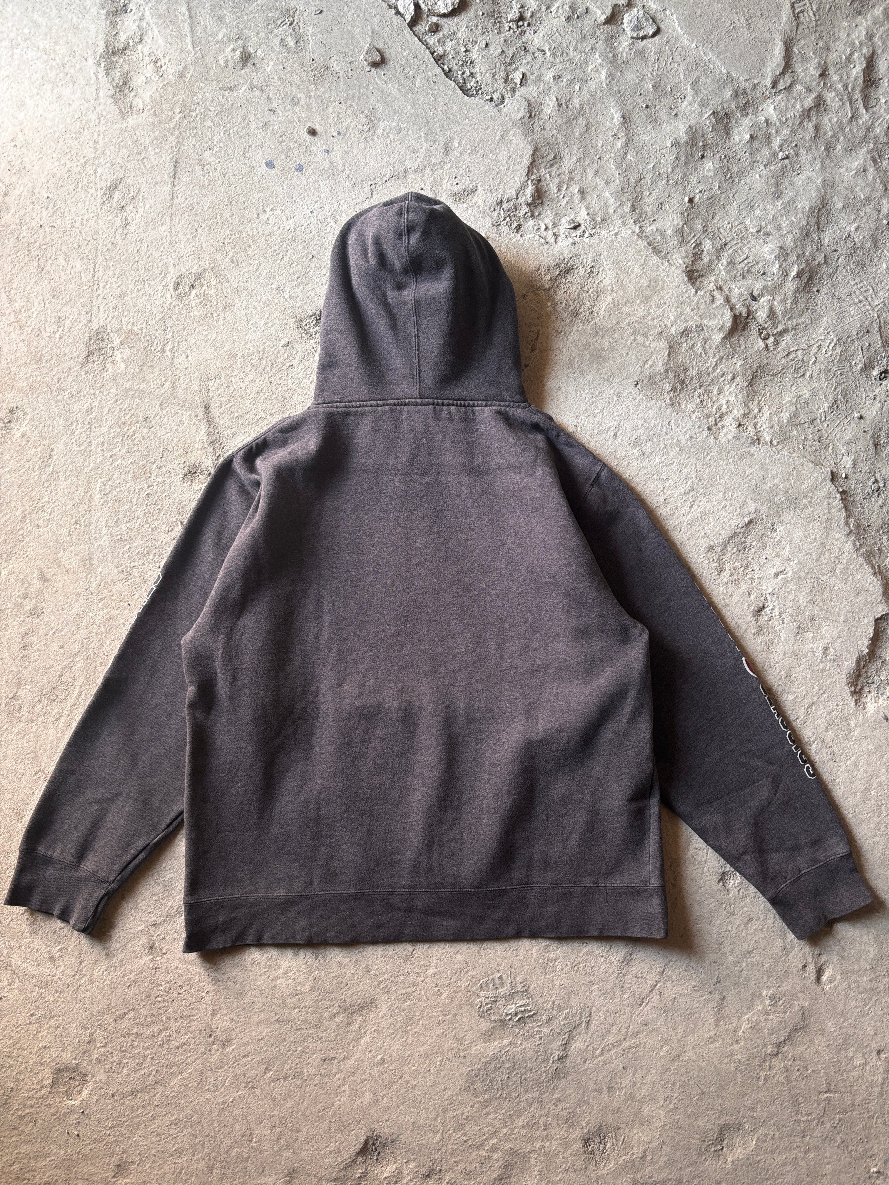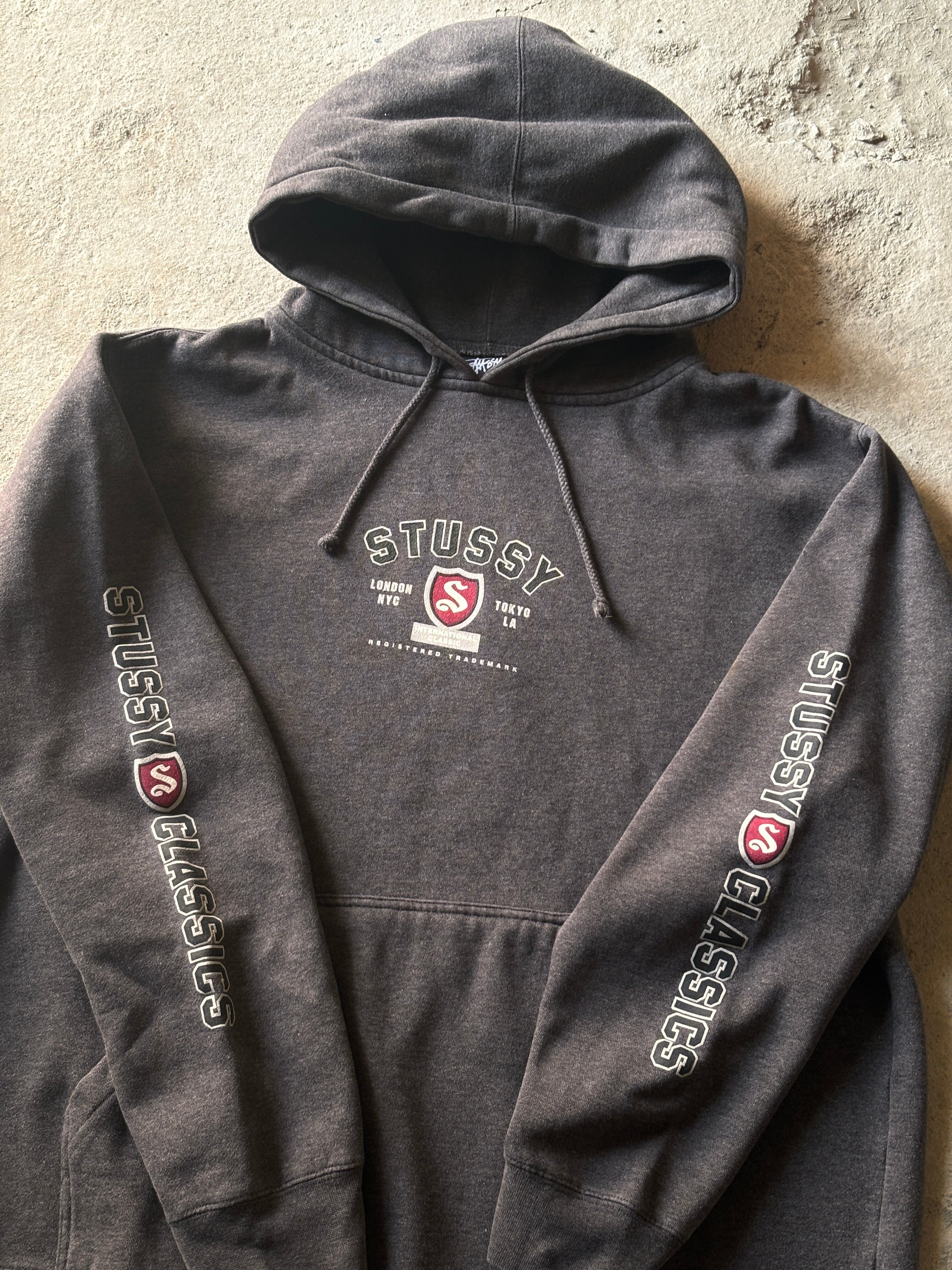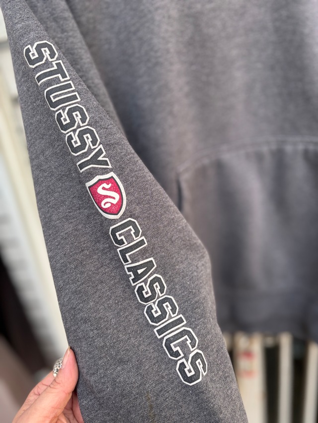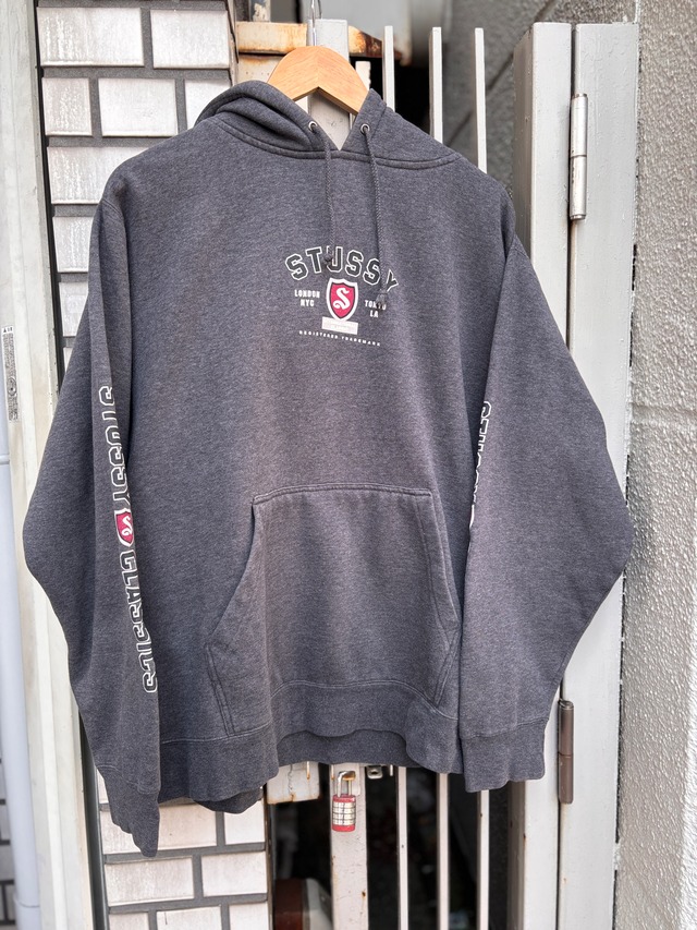 90~00s OLD STUSSY/Logo print Hoodie/紺タグ/L/ロゴプリントフィ-ディ-/パ-カ-/袖プリ/グレ-/ステューシー/オ-ルドステューシー/古着/ア―カイブ