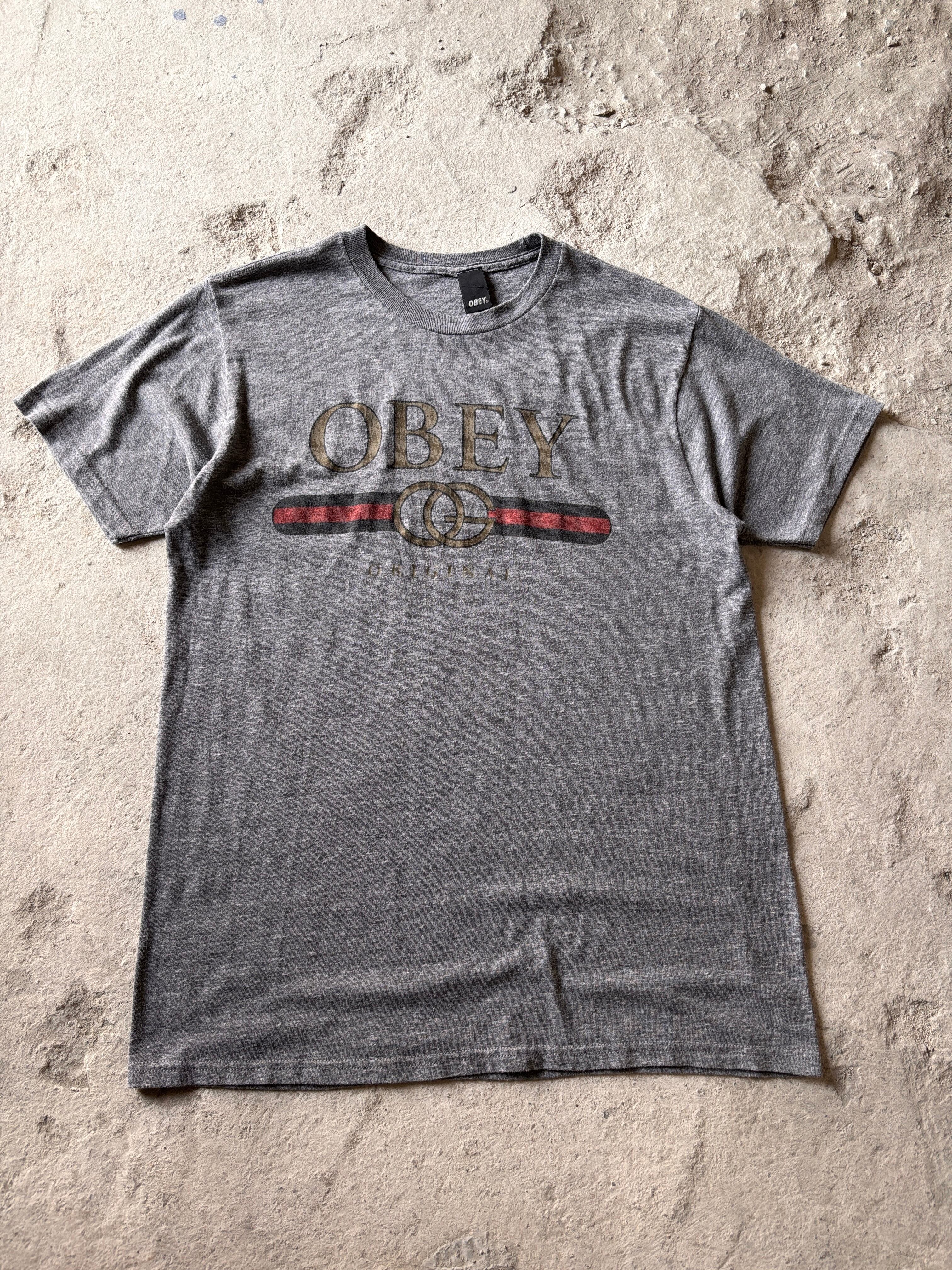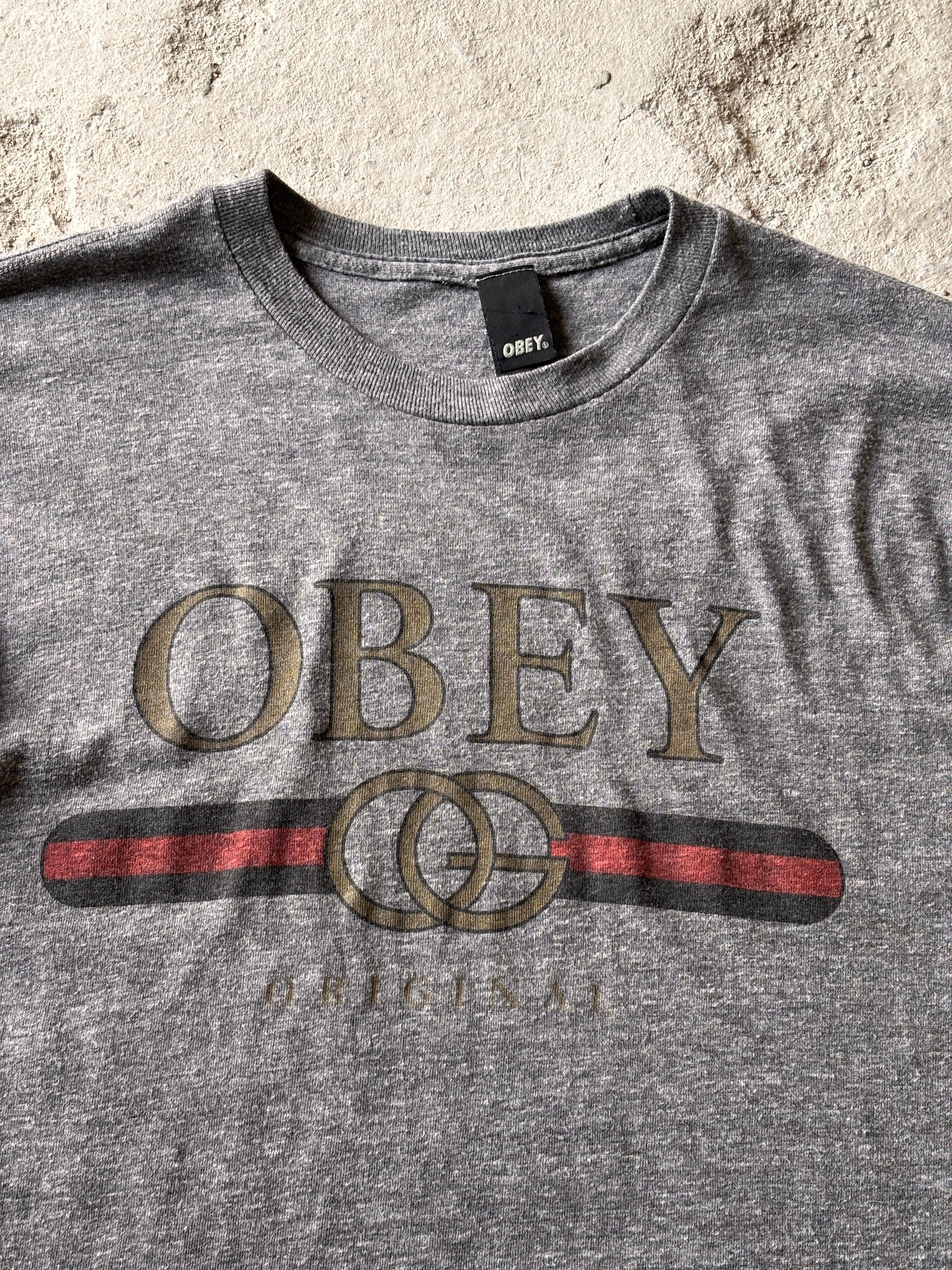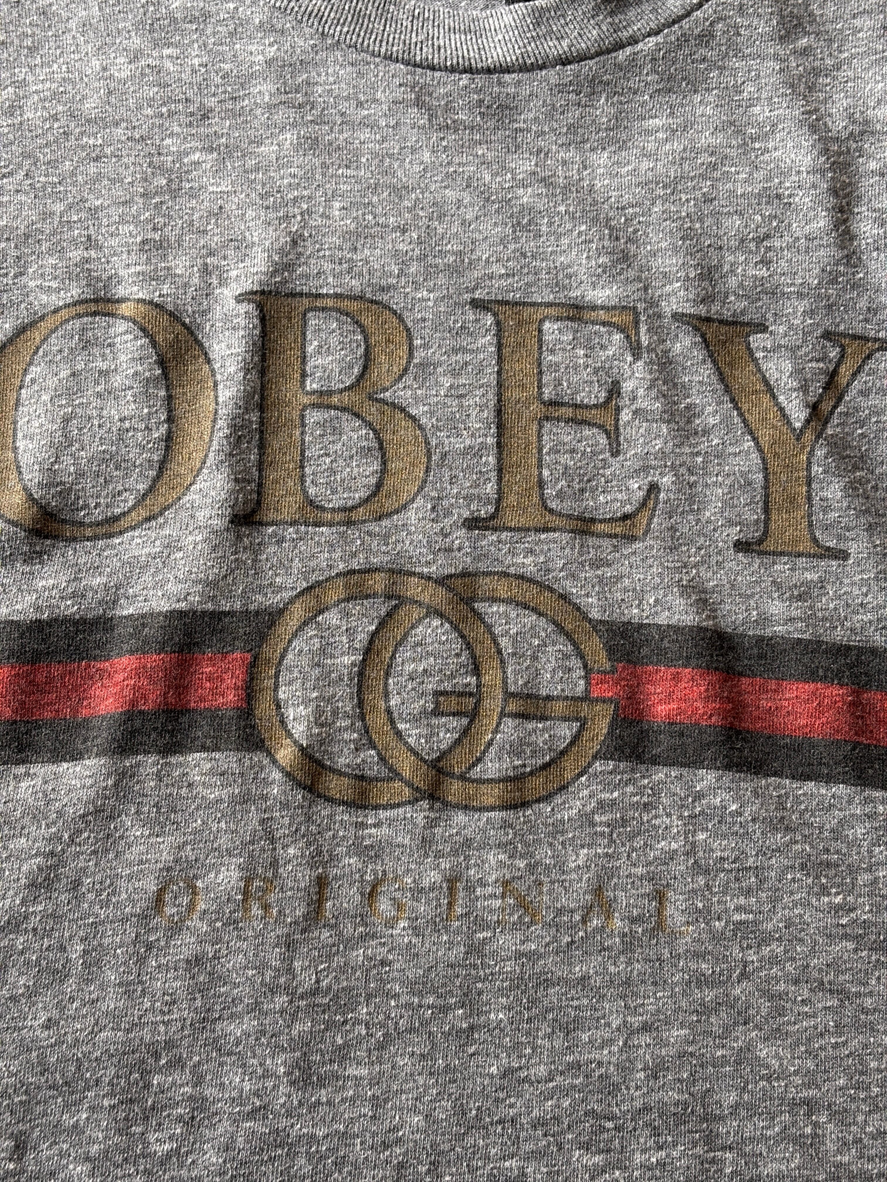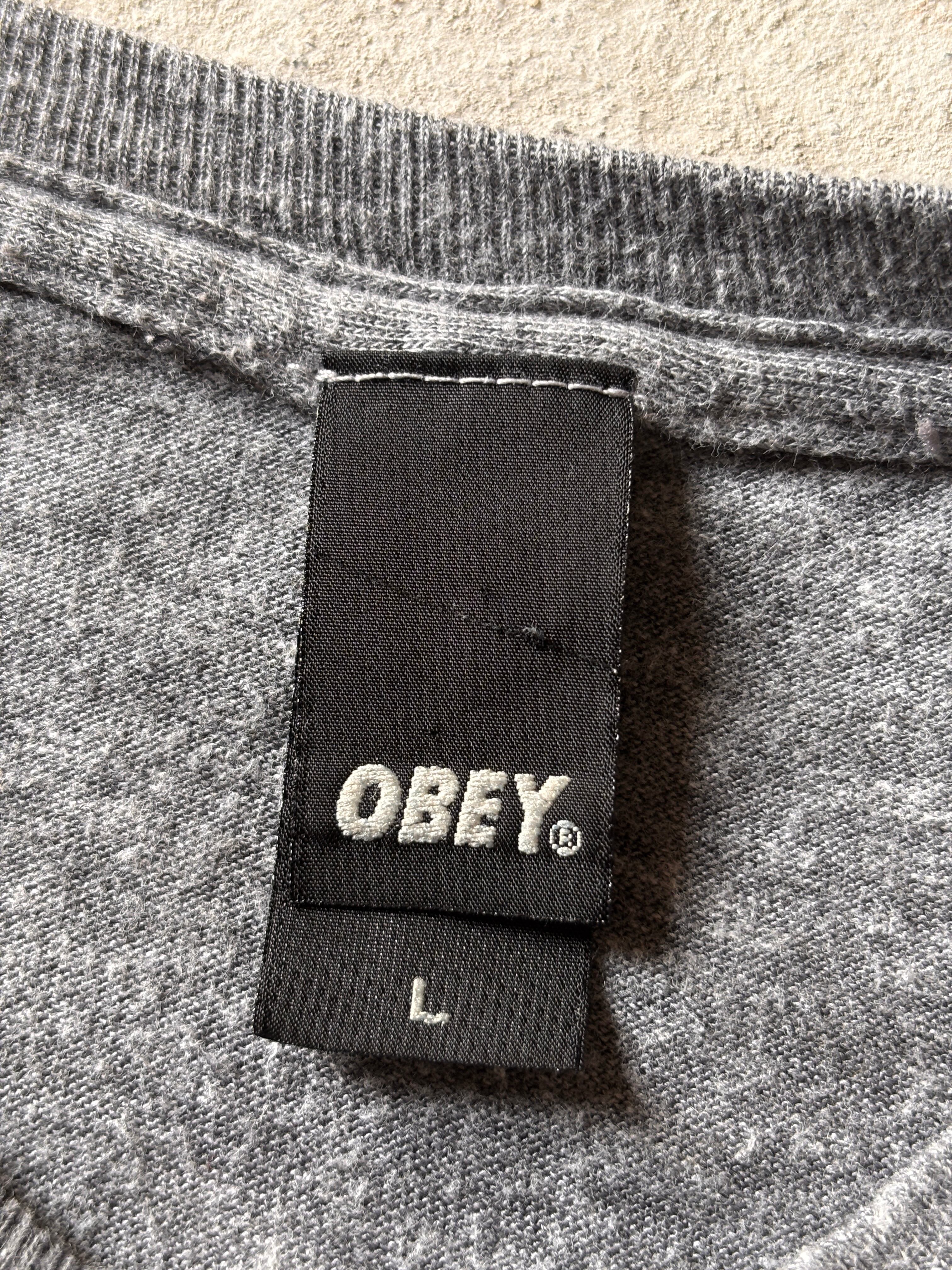 00s OBEY/Logo print Tee/USA製/L/ロゴプリントTシャツ/パロディ-デザイン/グレ-/オベイ/スケ-ト/スケートボード/古着
