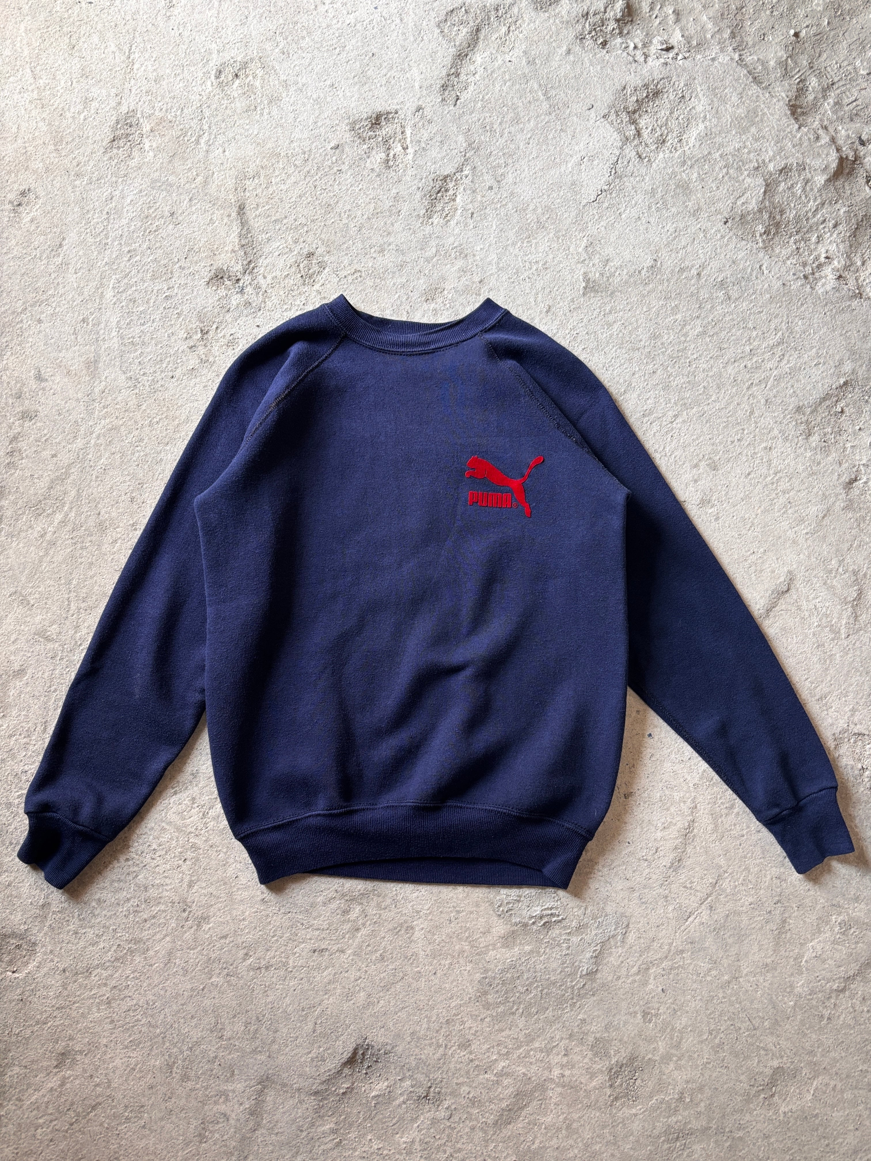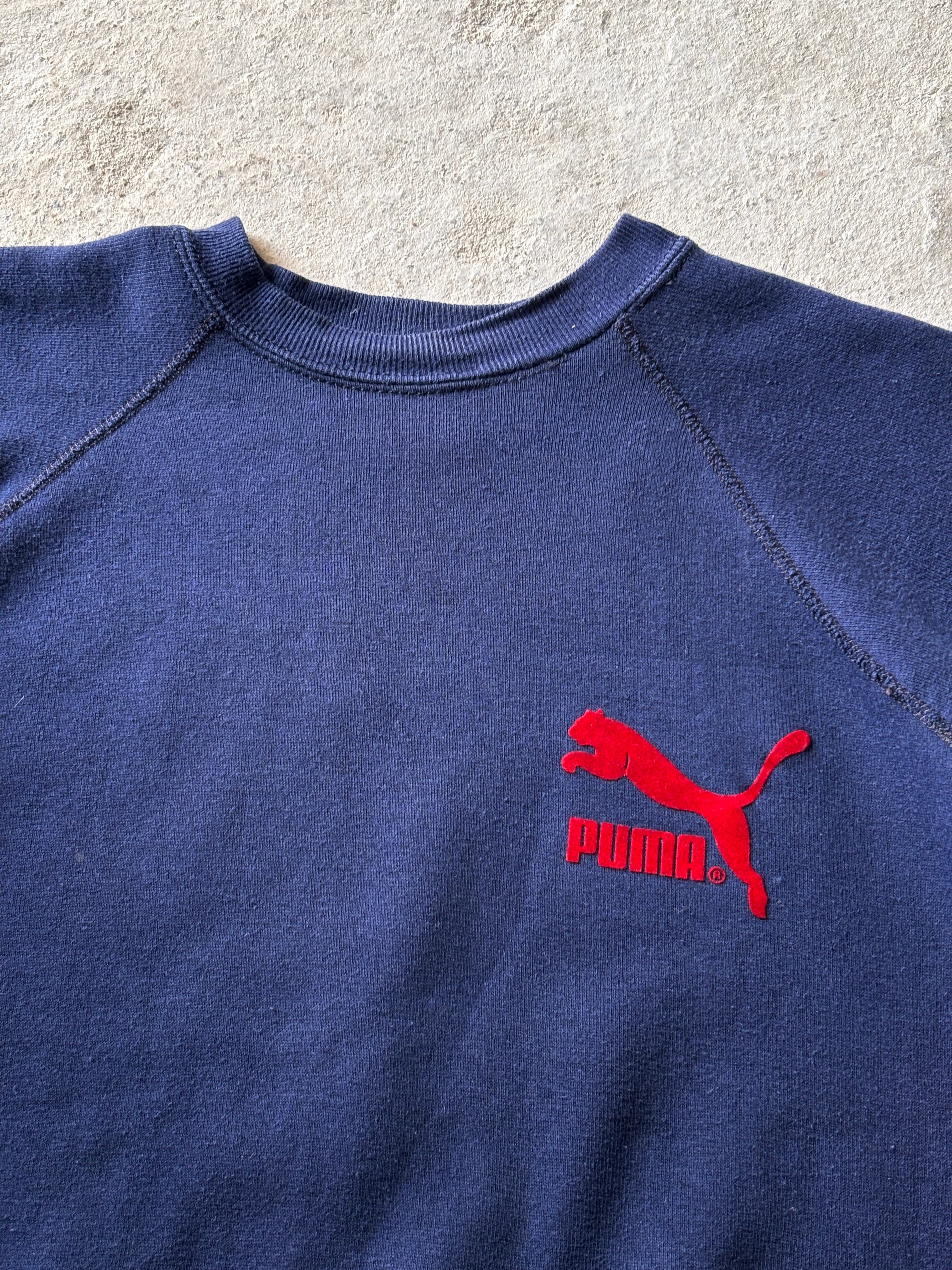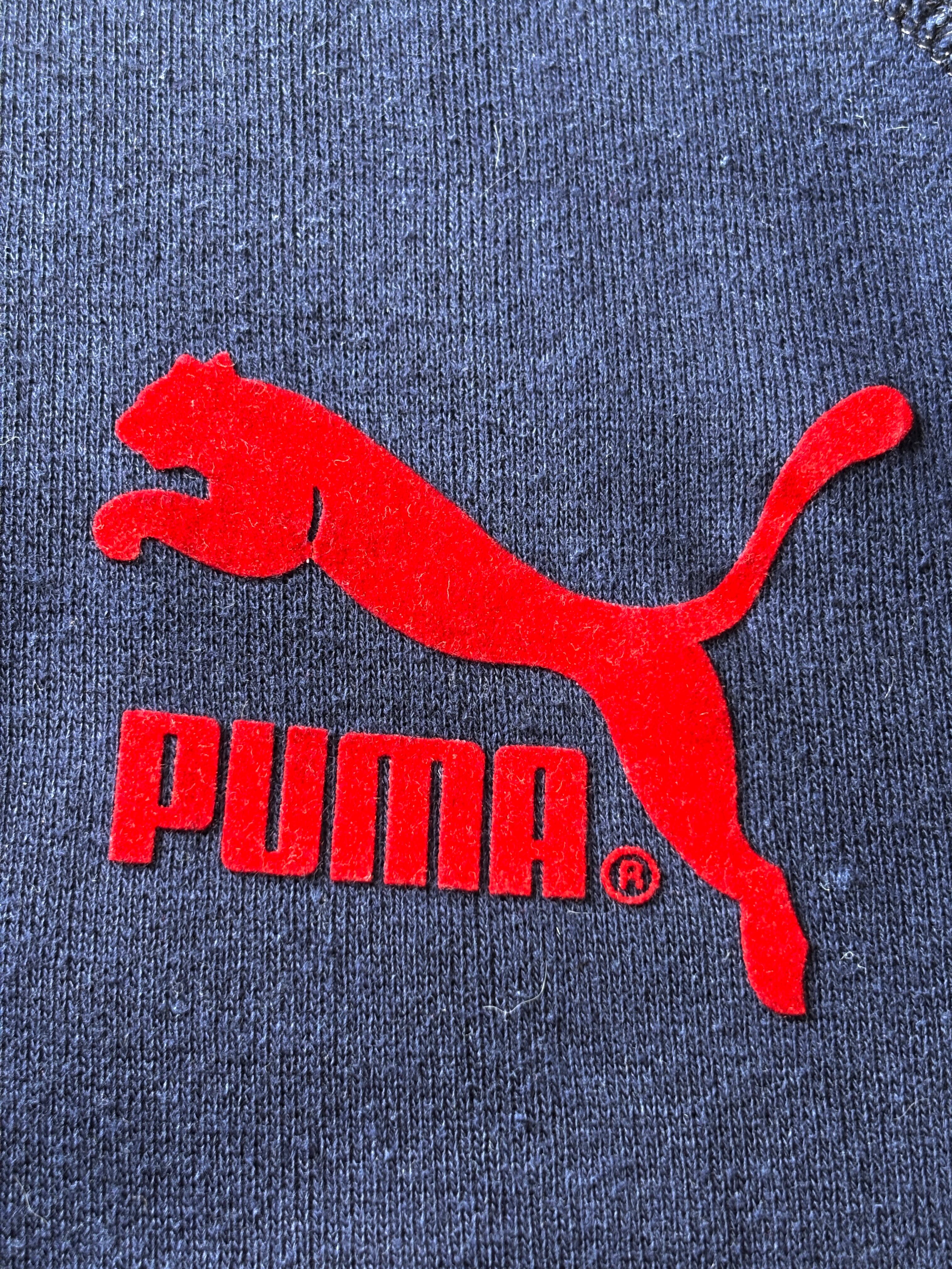 90s PUMA/Logo print Sweat/USA製/M/ロゴプリントスウェット/フロッキ-/ラグラン/ネイビ-/レッド/プ-マ/古着