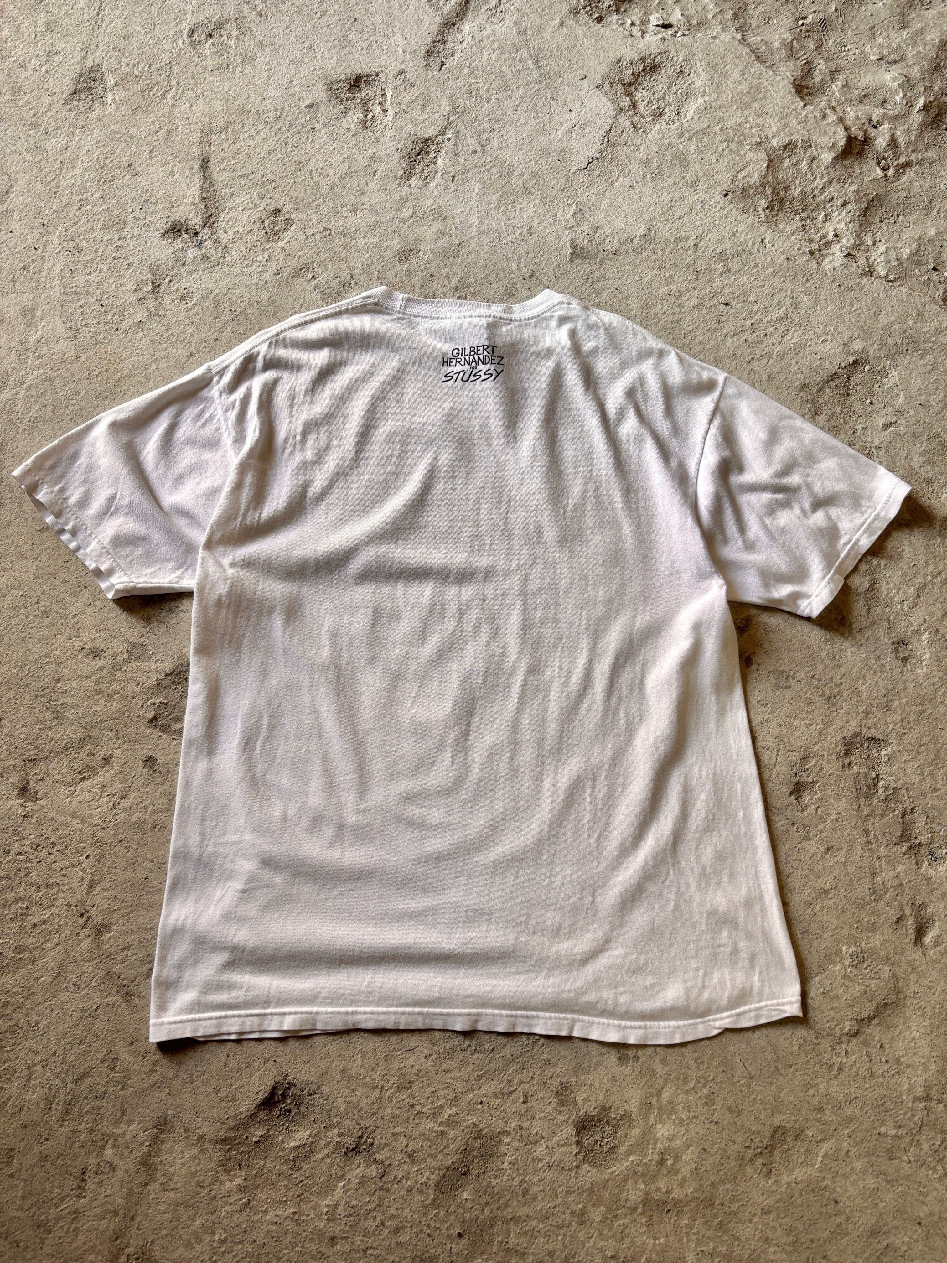00~10s STUSSY×GILBERT HERNANDEZ/Old Turntable Tee/L/蓄音機プリントTシャツ/I GET GOOSE BUMPS/ストックロゴ/ホワイト/ギルバート・ヘルナンデスコラボ/ステューシー