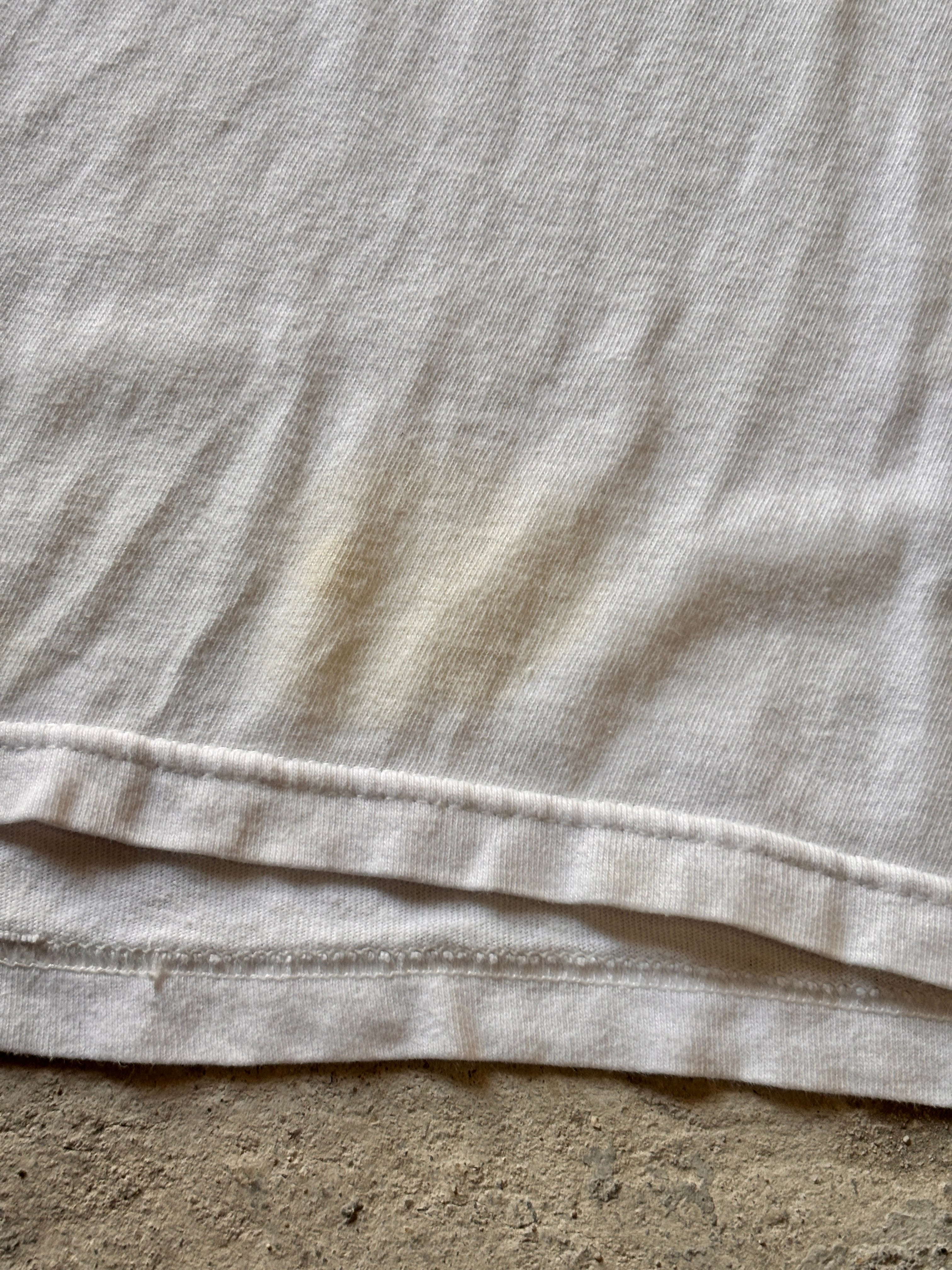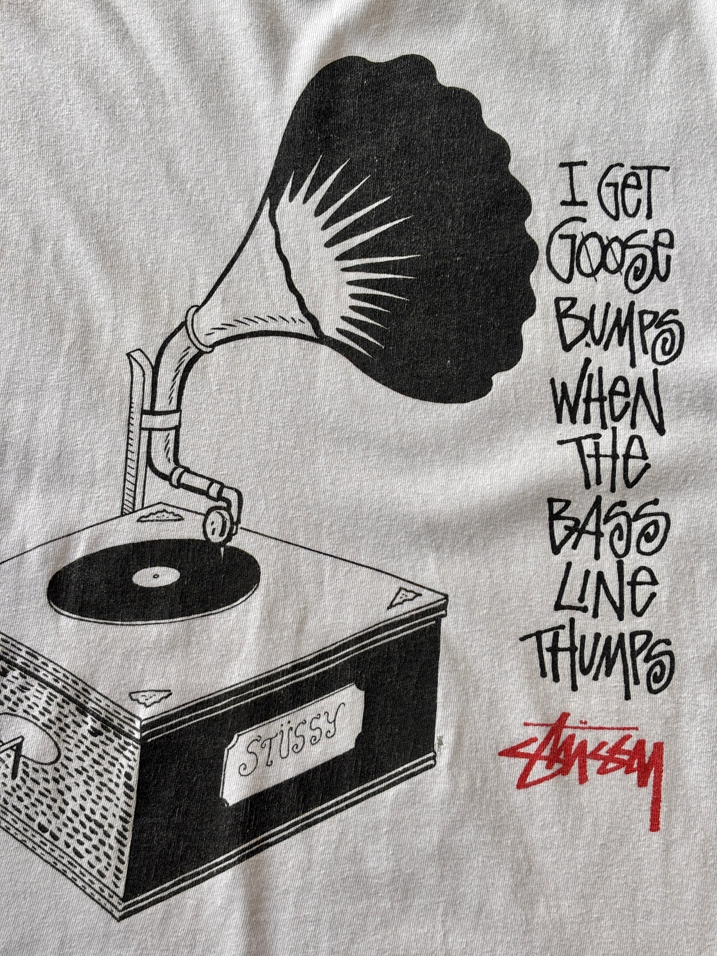 00~10s STUSSY×GILBERT HERNANDEZ/Old Turntable Tee/L/蓄音機プリントTシャツ/I GET GOOSE BUMPS/ストックロゴ/ホワイト/ギルバート・ヘルナンデスコラボ/ステューシー/古着/ア―カイブ