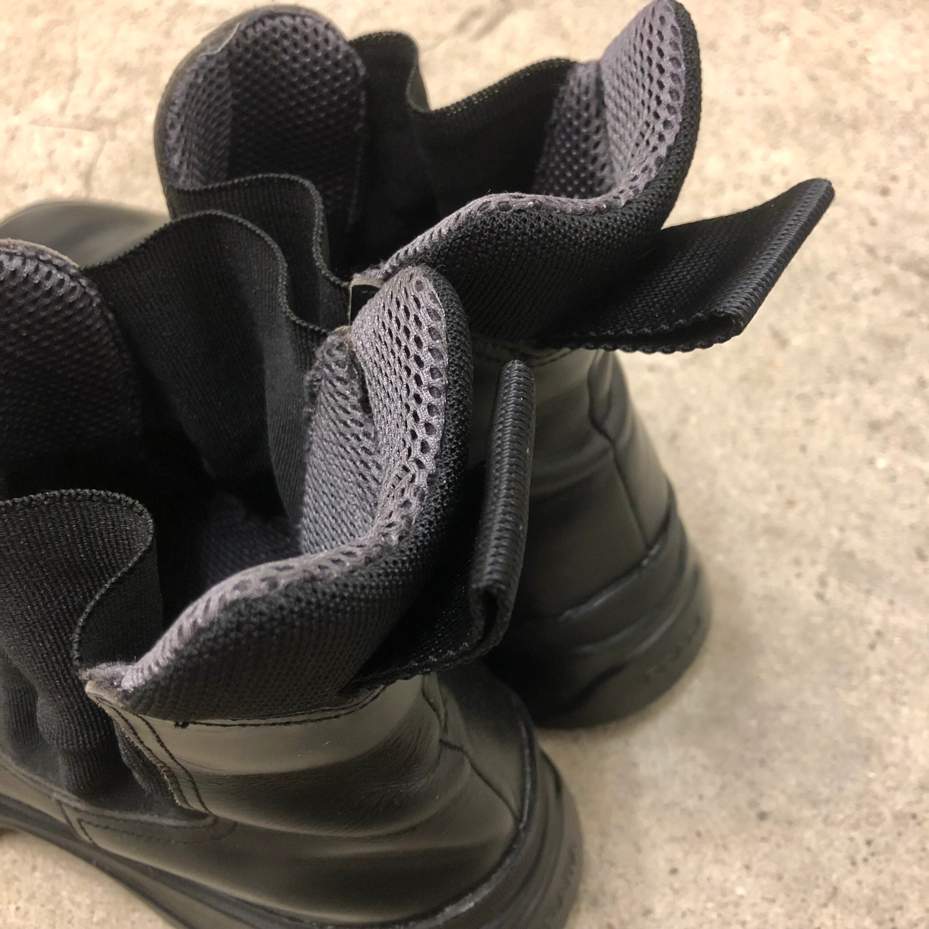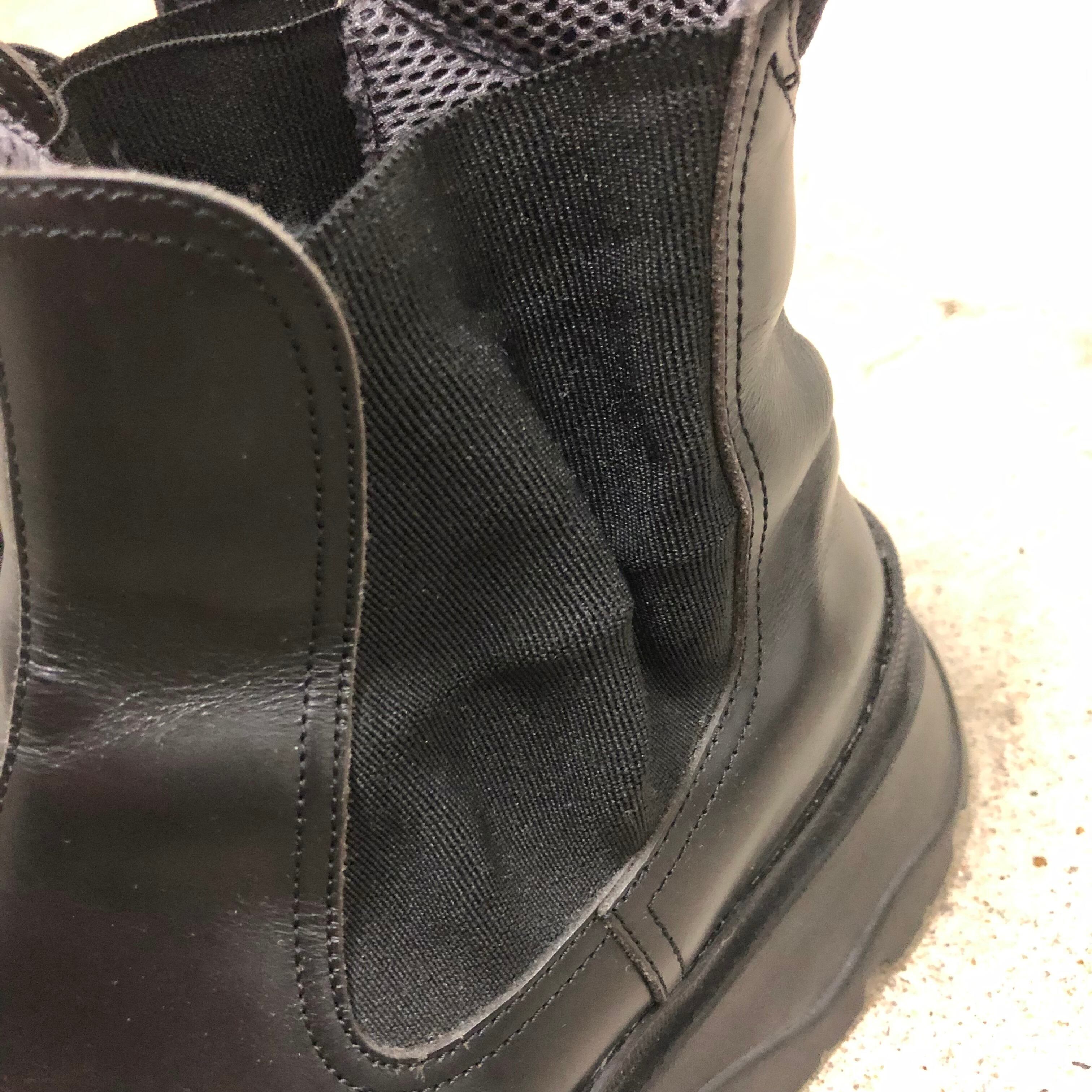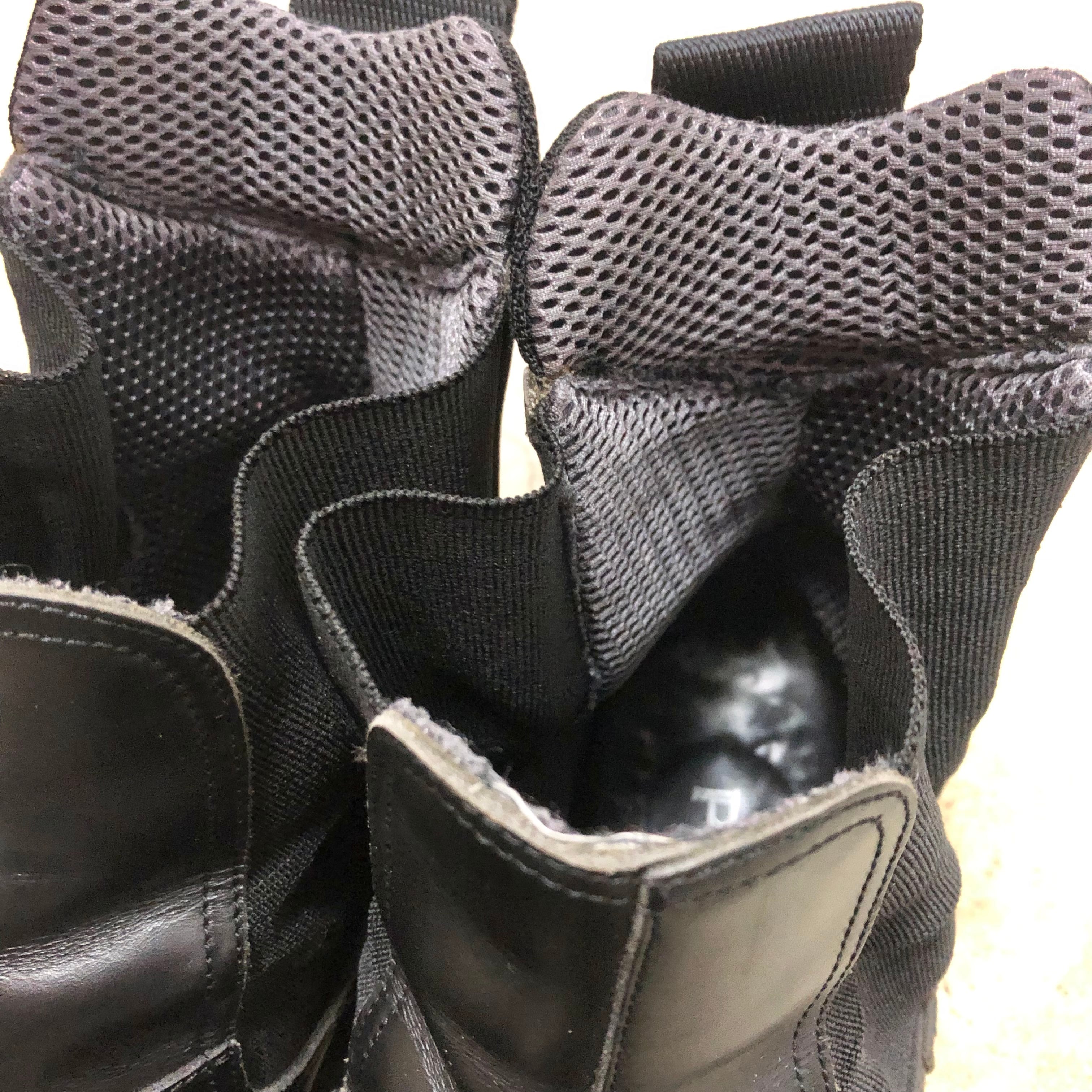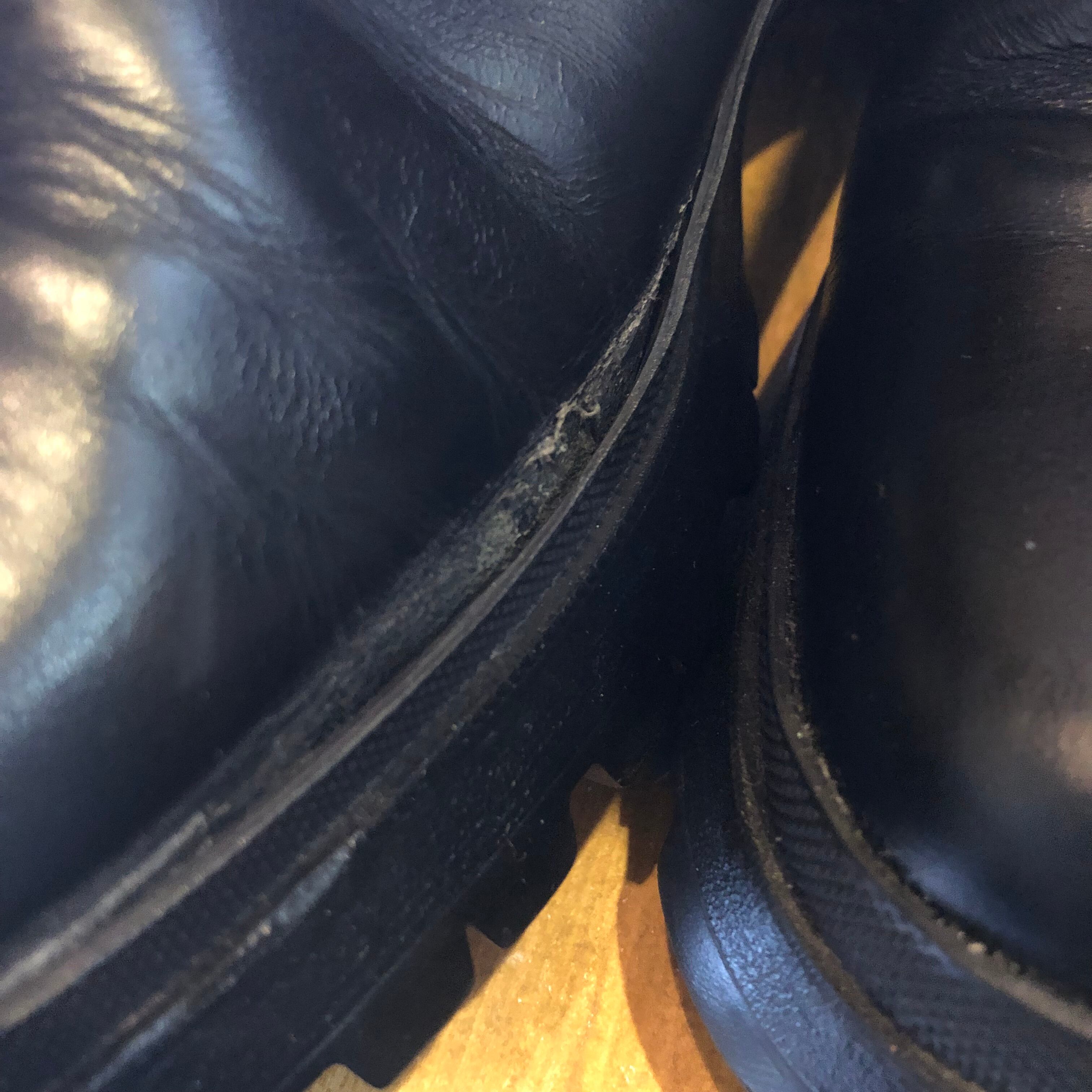中古、古着特有の着用感があり、つま先に履きシワがあり、履き口のゴム部分に使用感あります。また右足のサイド部分に剥がれがあります。