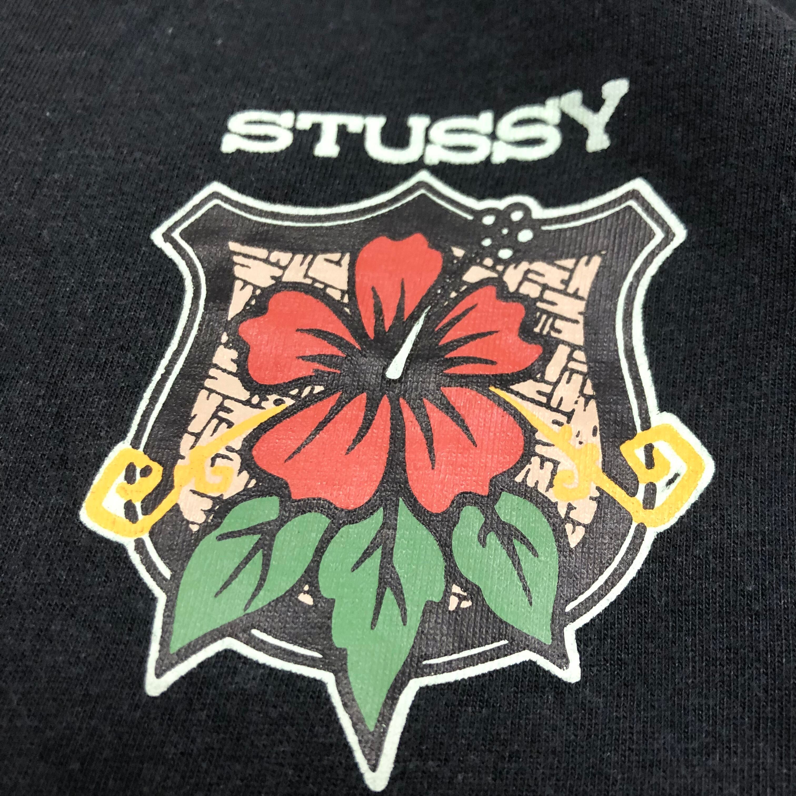 90s OLD STUSSY/Hibiscus print L/S Tee/USA製/白タグ/M/ハイビスカス/ロンT/ブラック/ステューシー