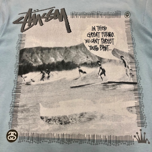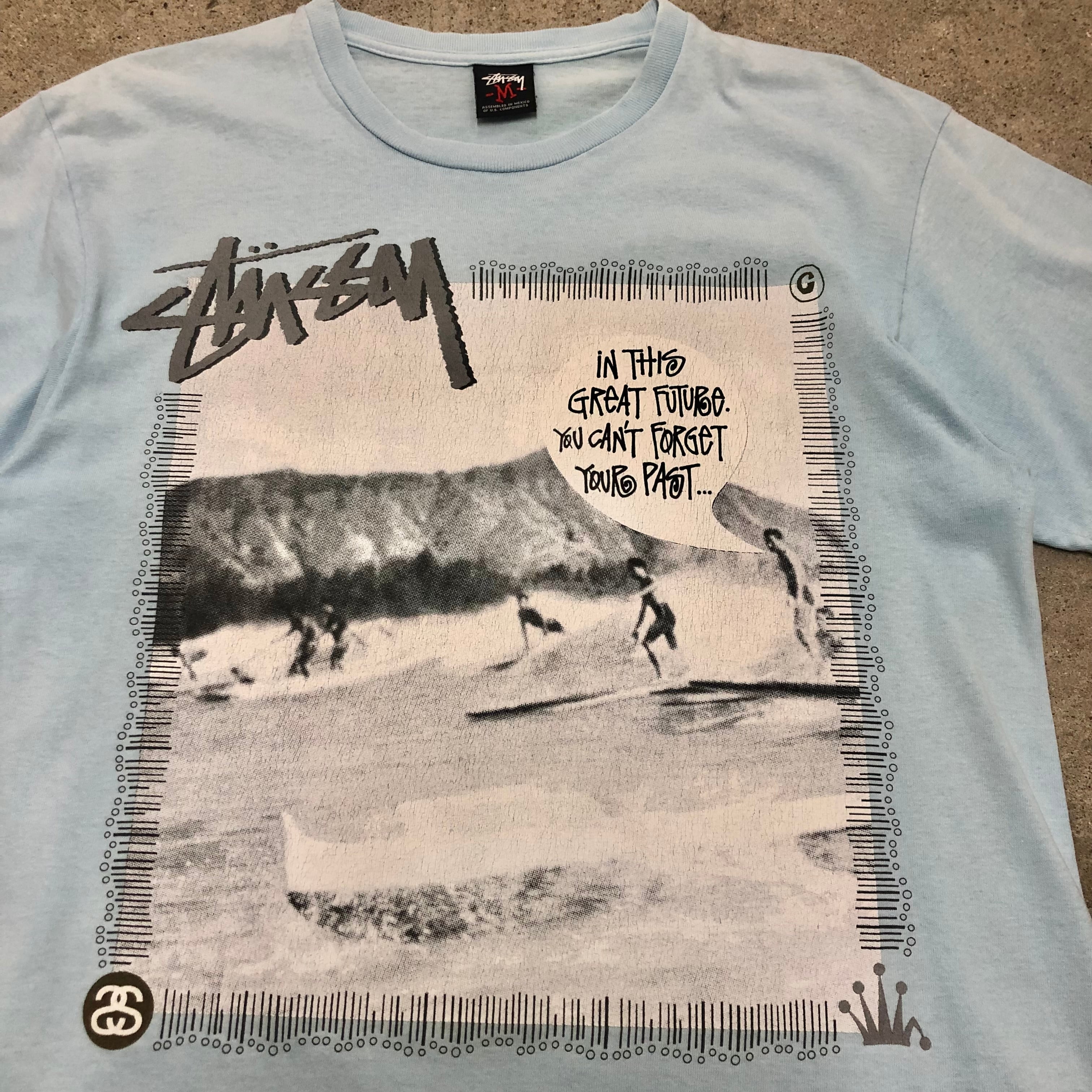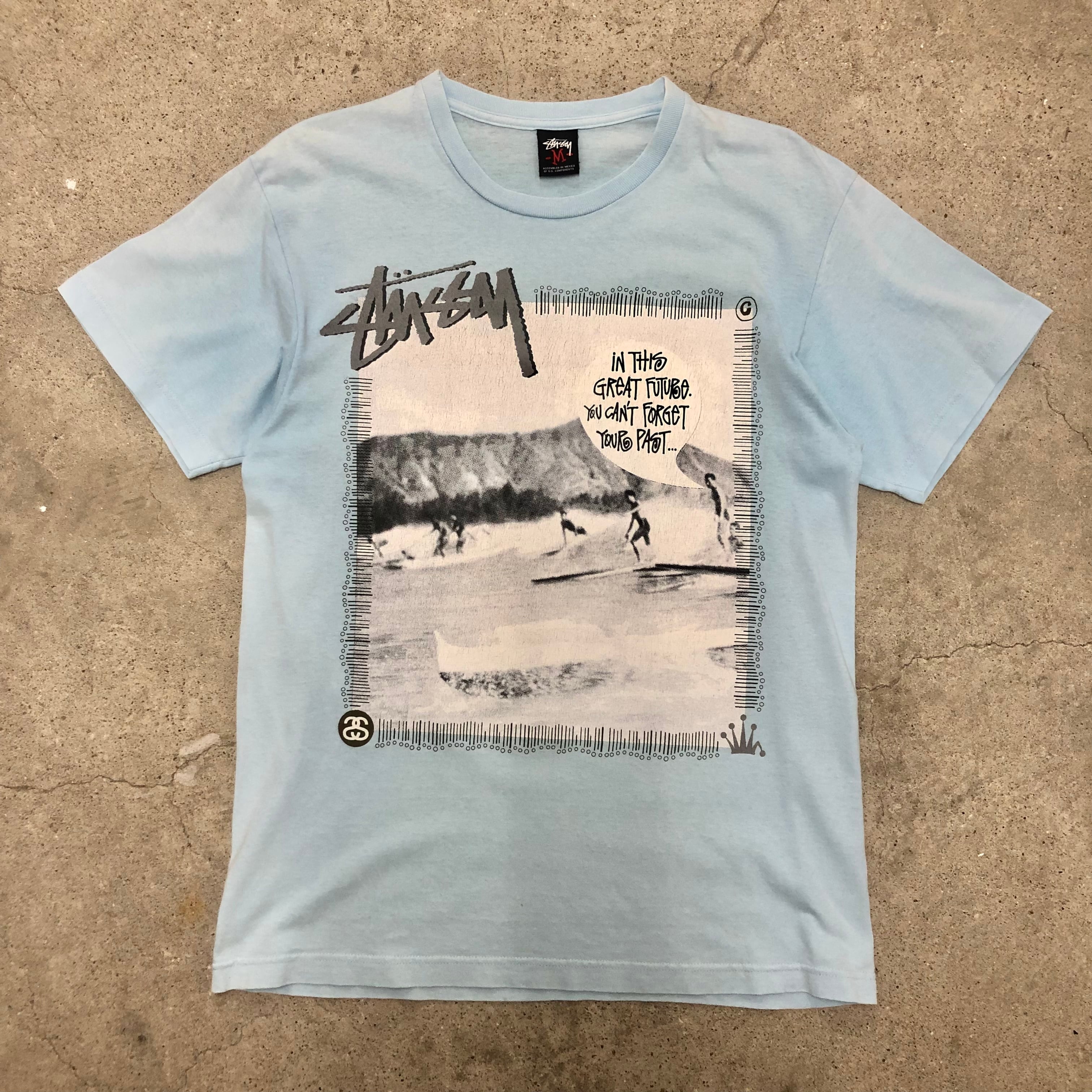 00s STUSSY/Surf print Tee/M/HAWAII/WAIKIKIモデル/M/サーフプリント/Tシャツ/アイルブルー/ステューシー