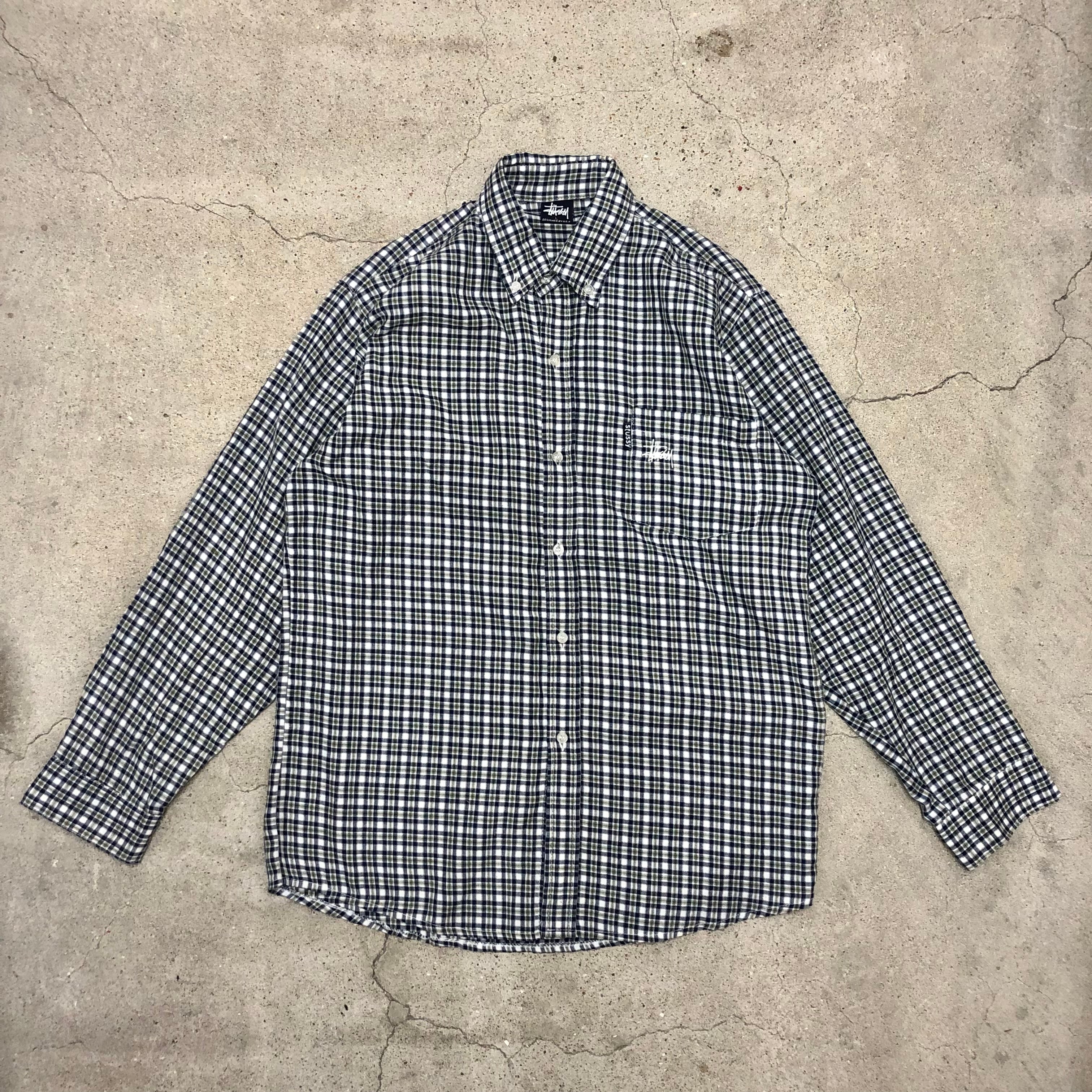 90~00s OLD STUSSY/ B/D check L/S shirt/Designed in USA/紺タグ/L/チェック柄/ボタンダウンシャツ/ネイビー/カーキ/長袖シャツ/ステューシー
