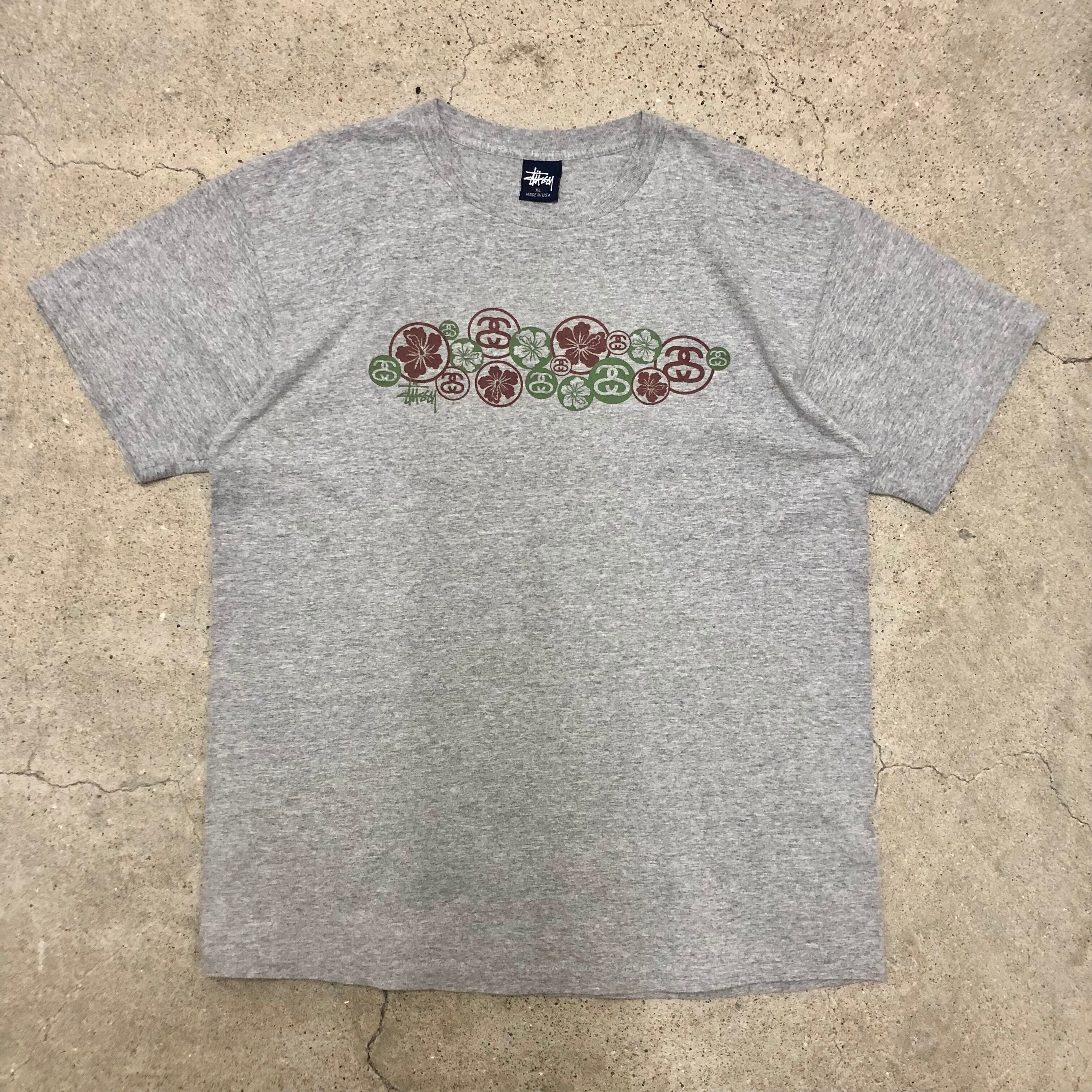 90s OLD STUSSY/Hibiscus Tee/USA製/紺タグ/XL/ハイビスカスプリント/Tシャツ/SSロゴ/グレー/ステューシー/オールドステューシー/古着/ヴィンテージ/アーカイブ